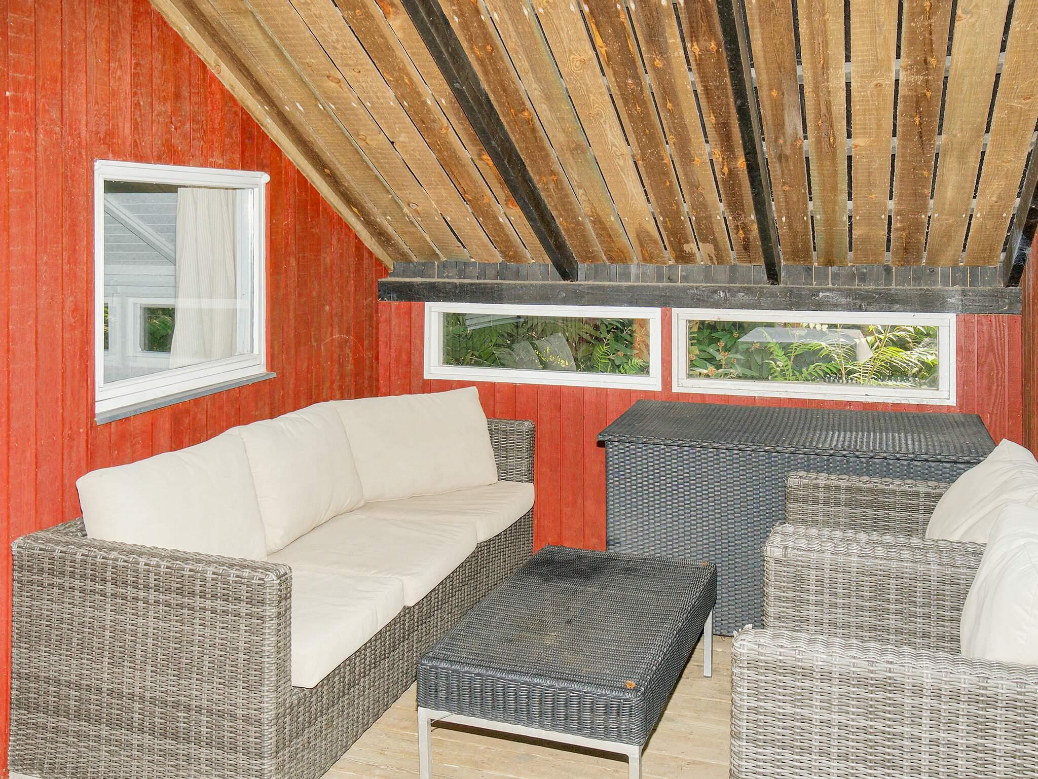 Bygningen er et klassisk træhus, som bidrager til den hyggelige og indbydende atmosfære. Den delvist overdækkede terrasse skaber en naturlig overgang mellem indendørs og udendørs arealer.