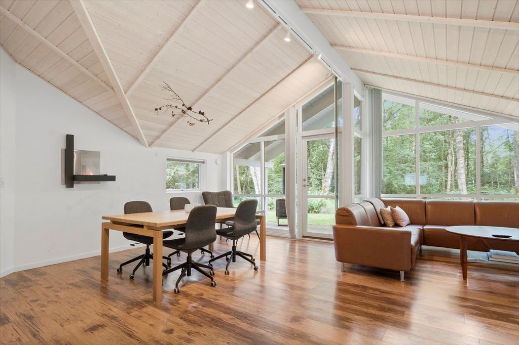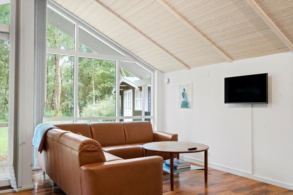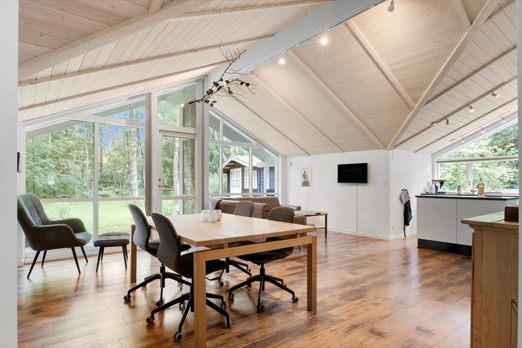 Stuen har loft til kip, store vinduer med udsigt over hele haven.