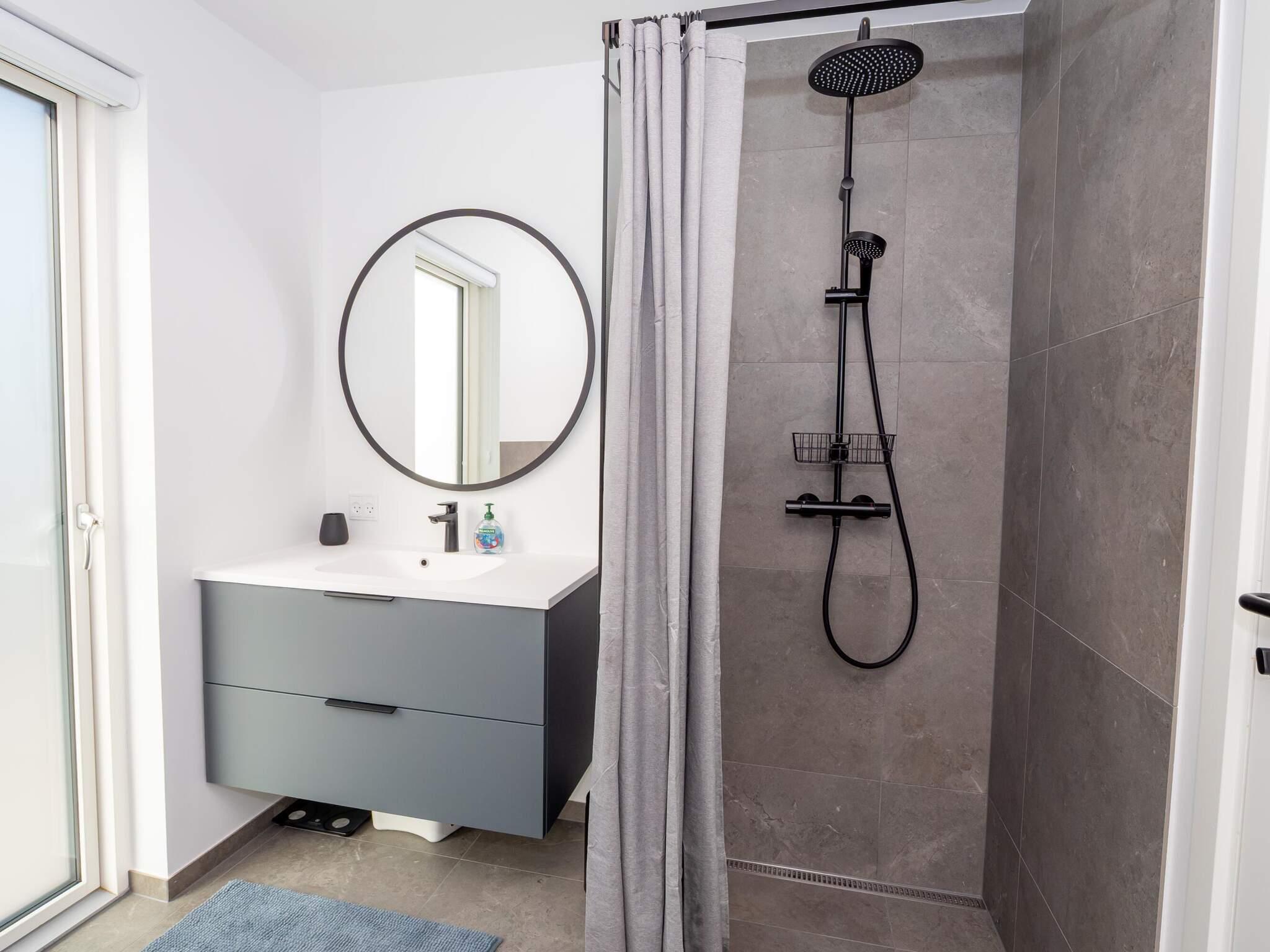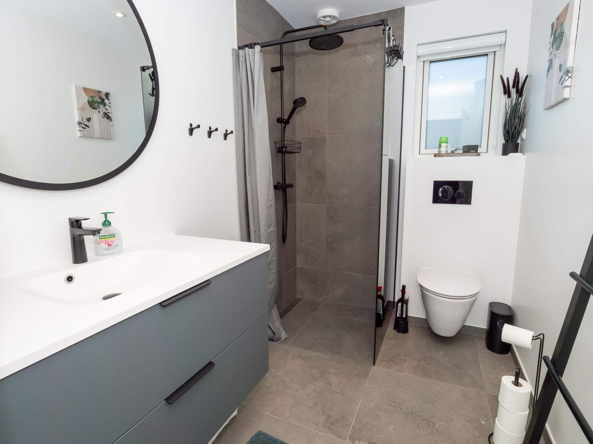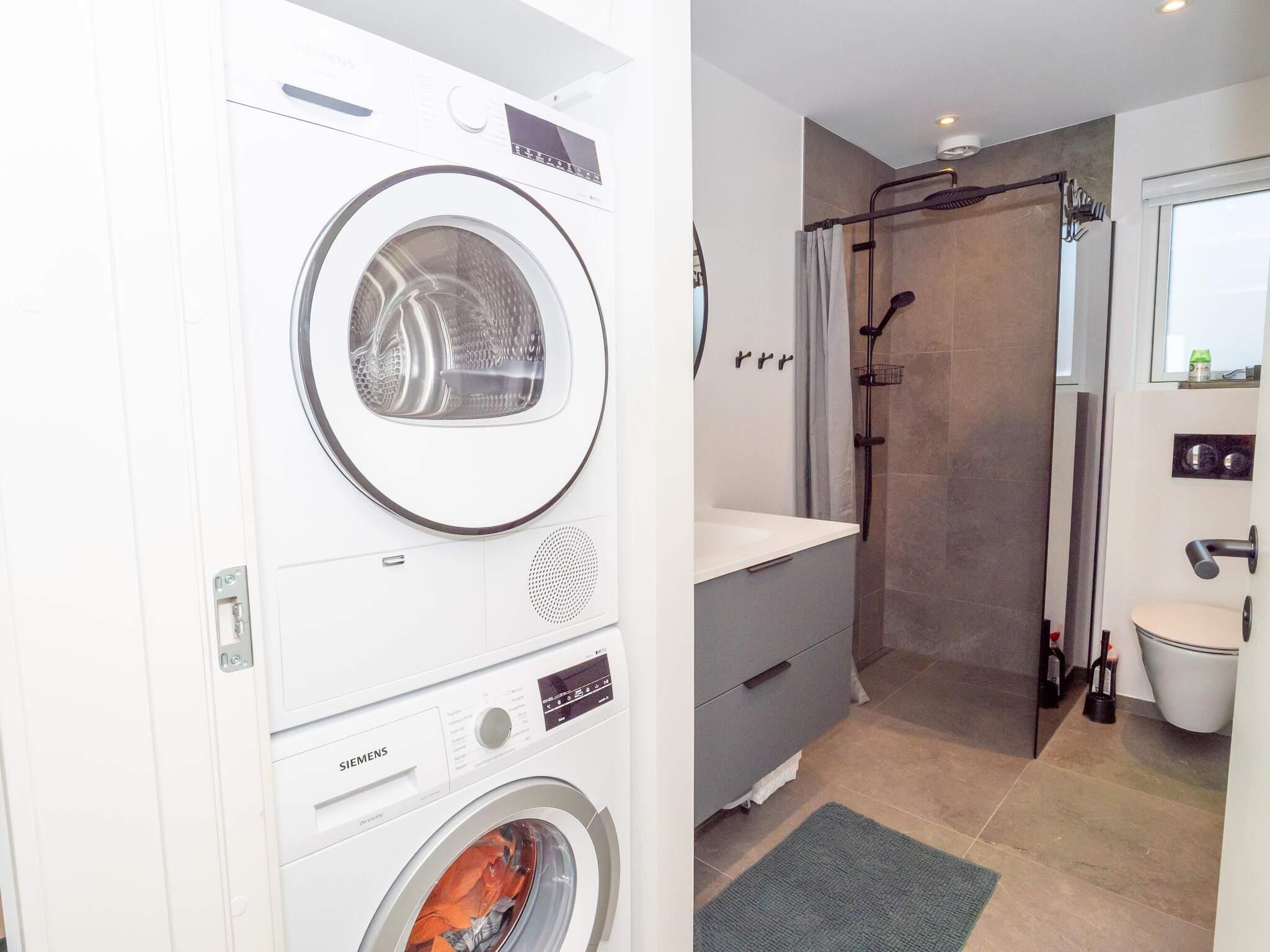 Lyst og lækkert kvalitetsbadeværelse med bademiljø, bruseniche samt toilet. Gæstebadeværelse i samme kvalitet med bademiljø, bruseniche samt toilet. Derudover er der vaskemaskine og tørretumbler i huset.
