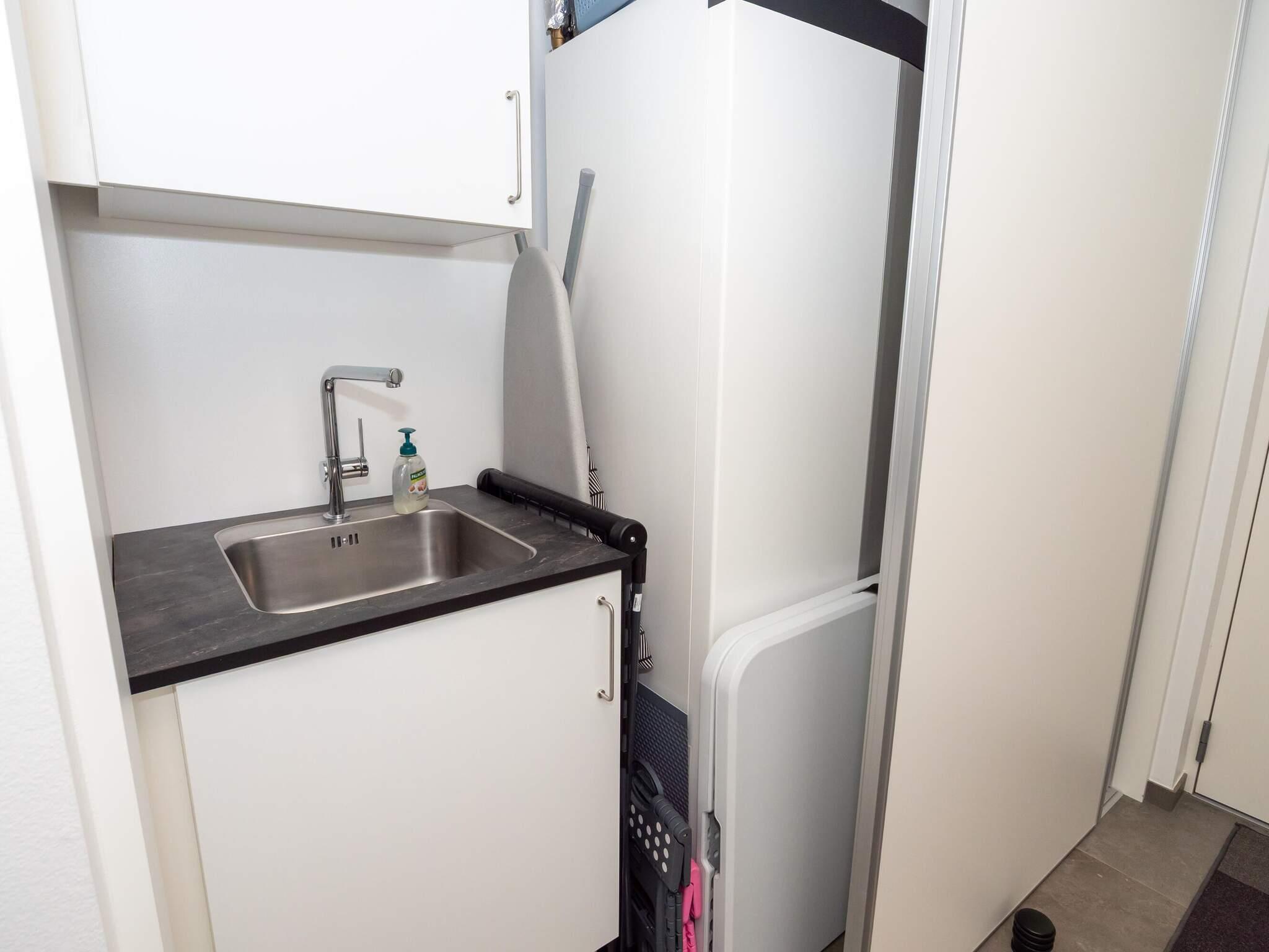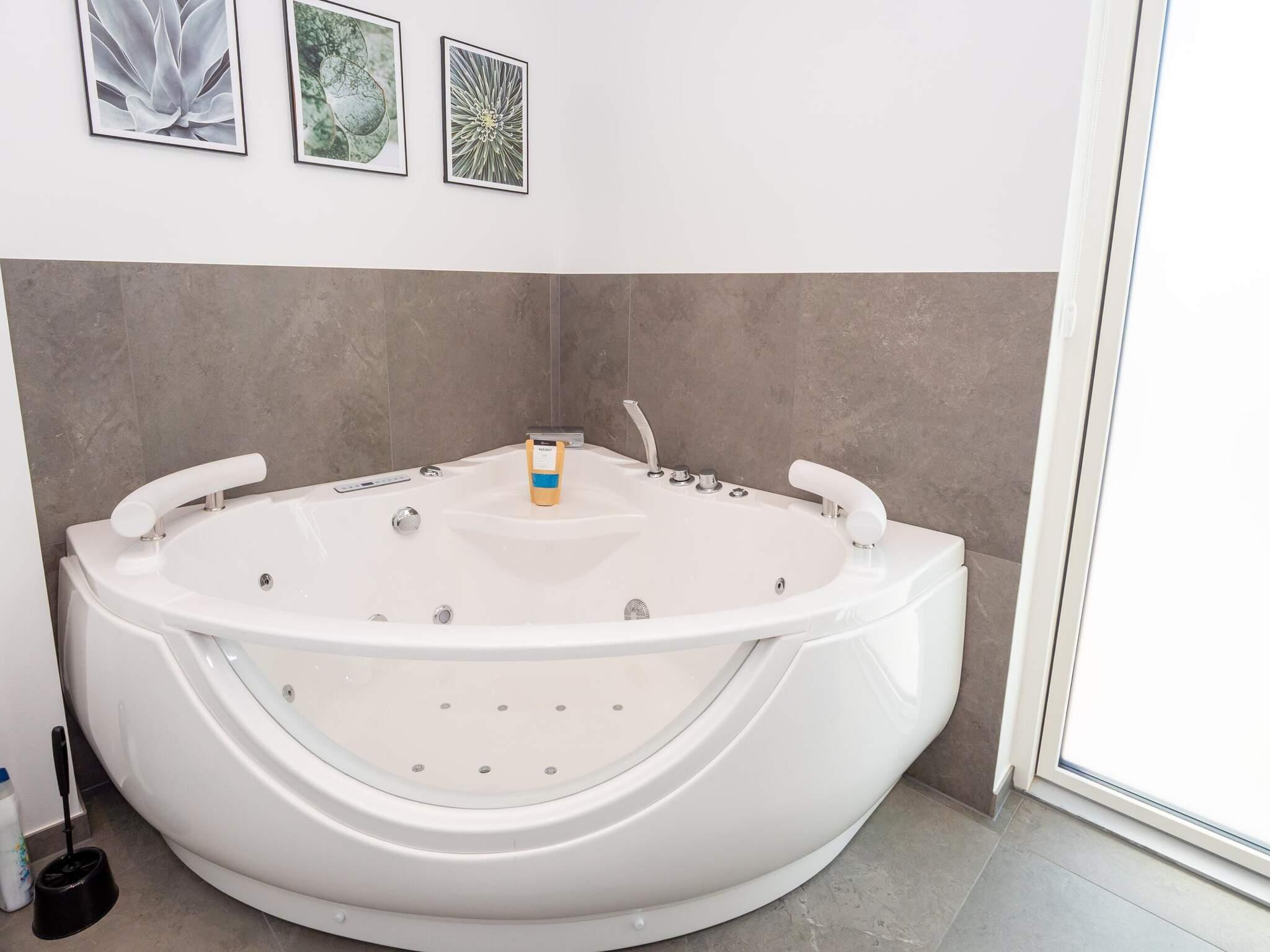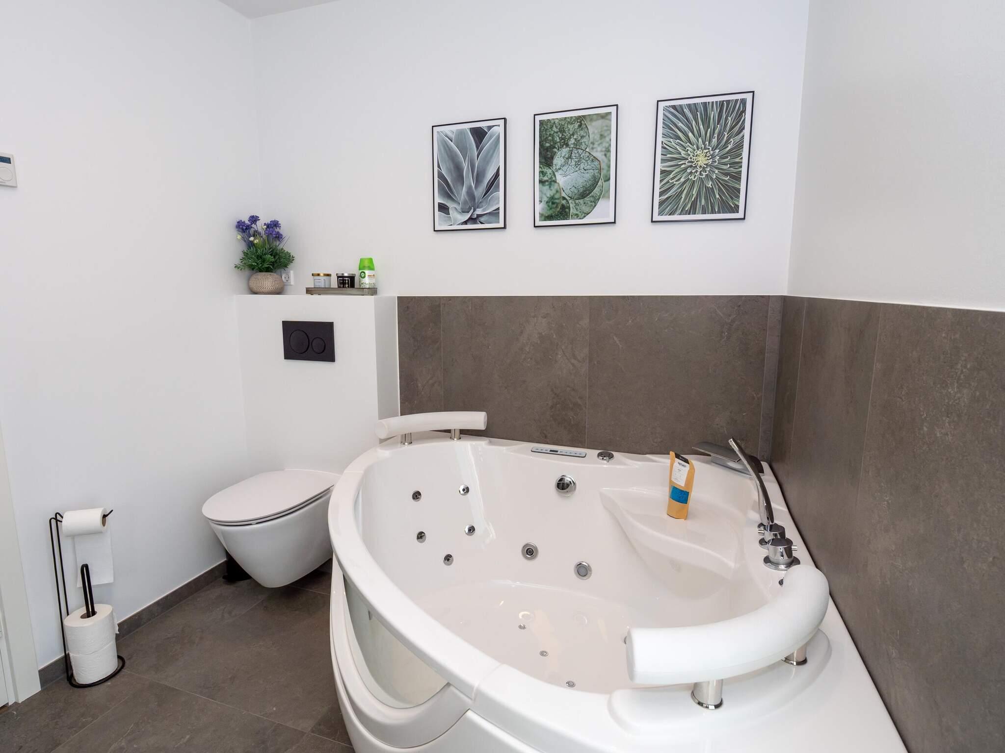 Lyst og lækkert kvalitetsbadeværelse med bademiljø, bruseniche samt toilet. Gæstebadeværelse i samme kvalitet med bademiljø, bruseniche samt toilet. Derudover er der vaskemaskine og tørretumbler i huset.