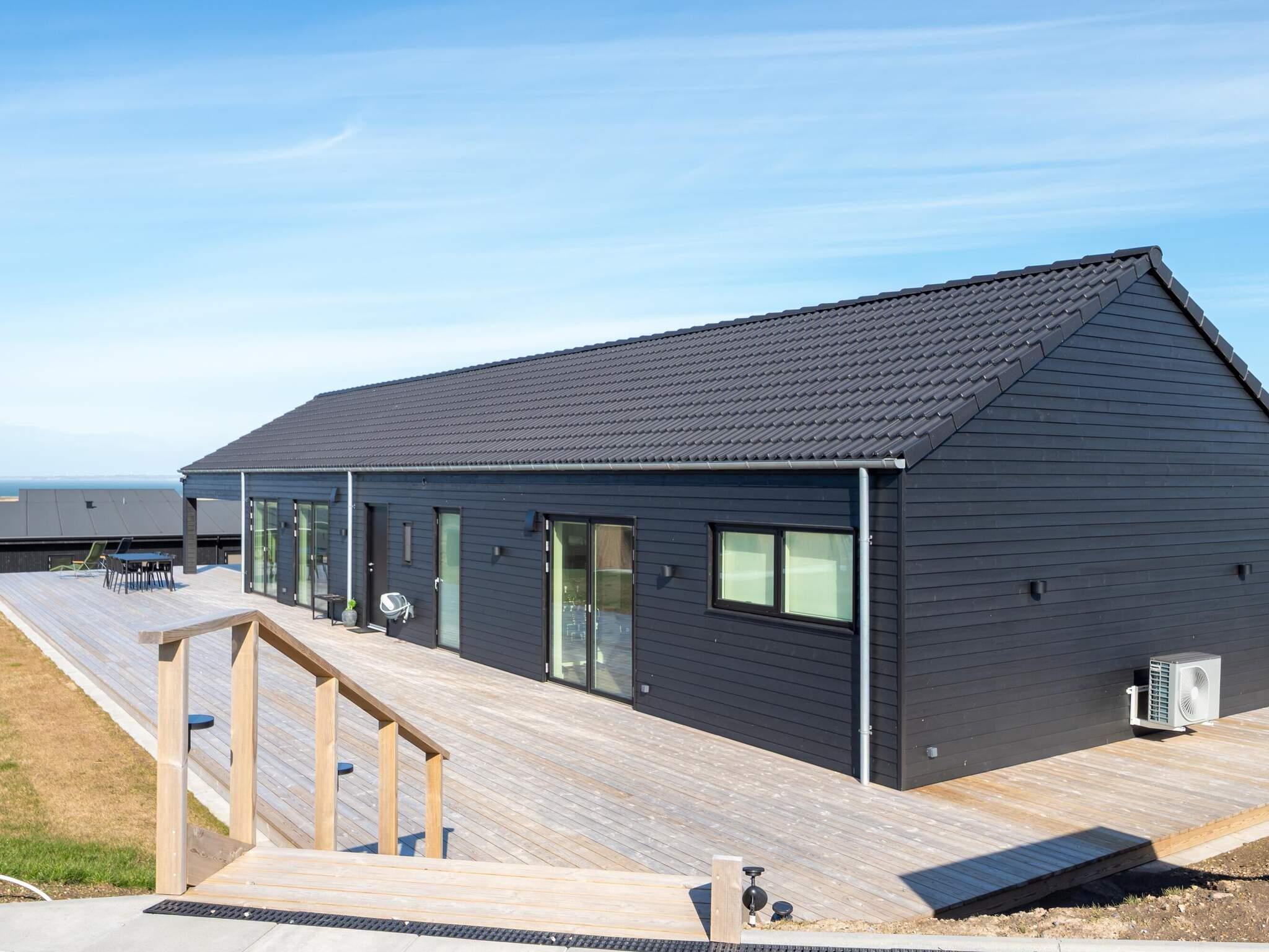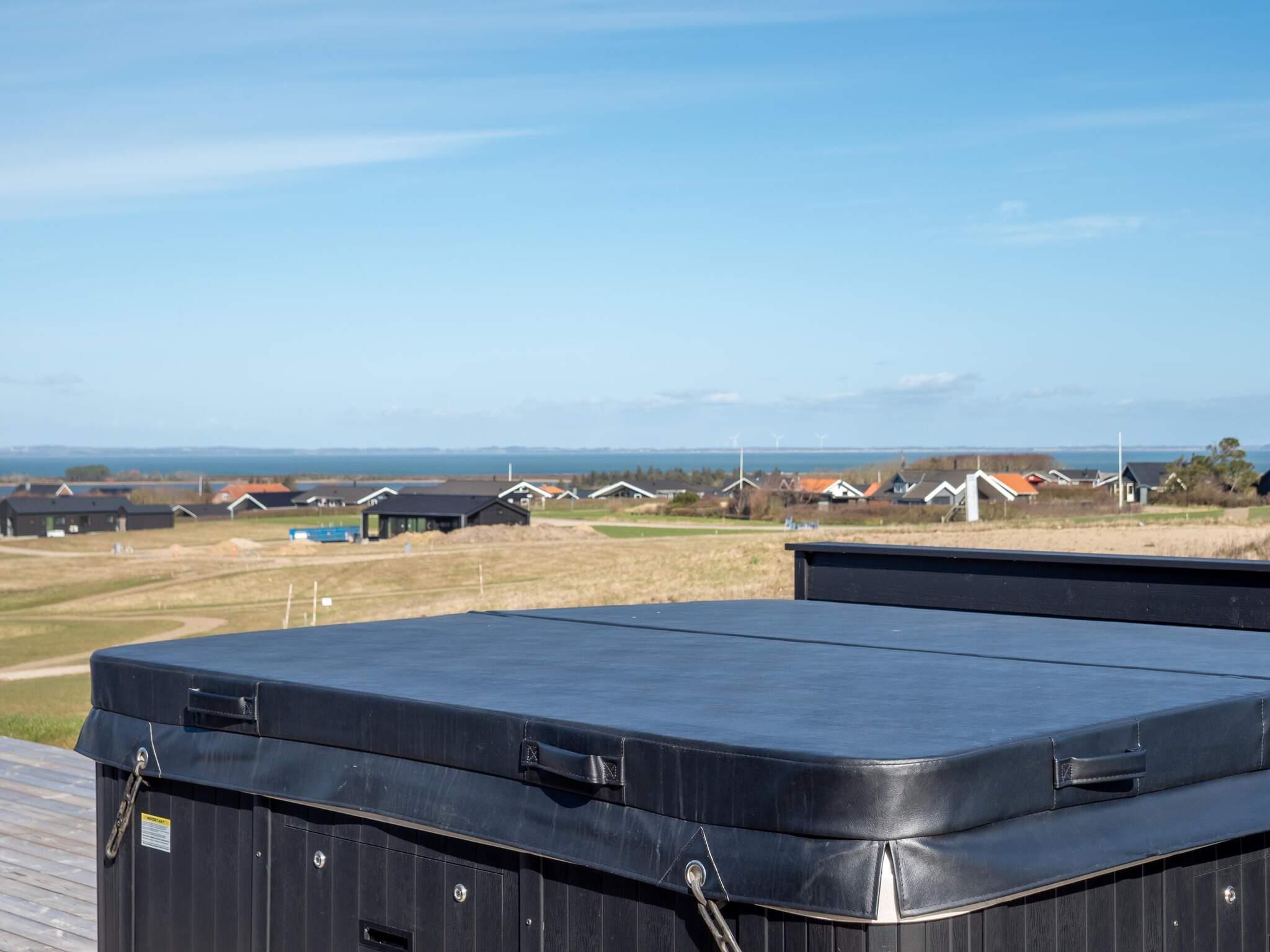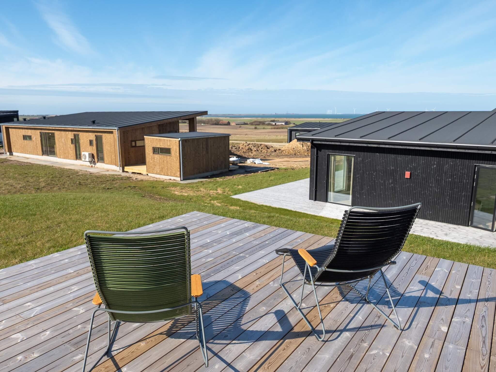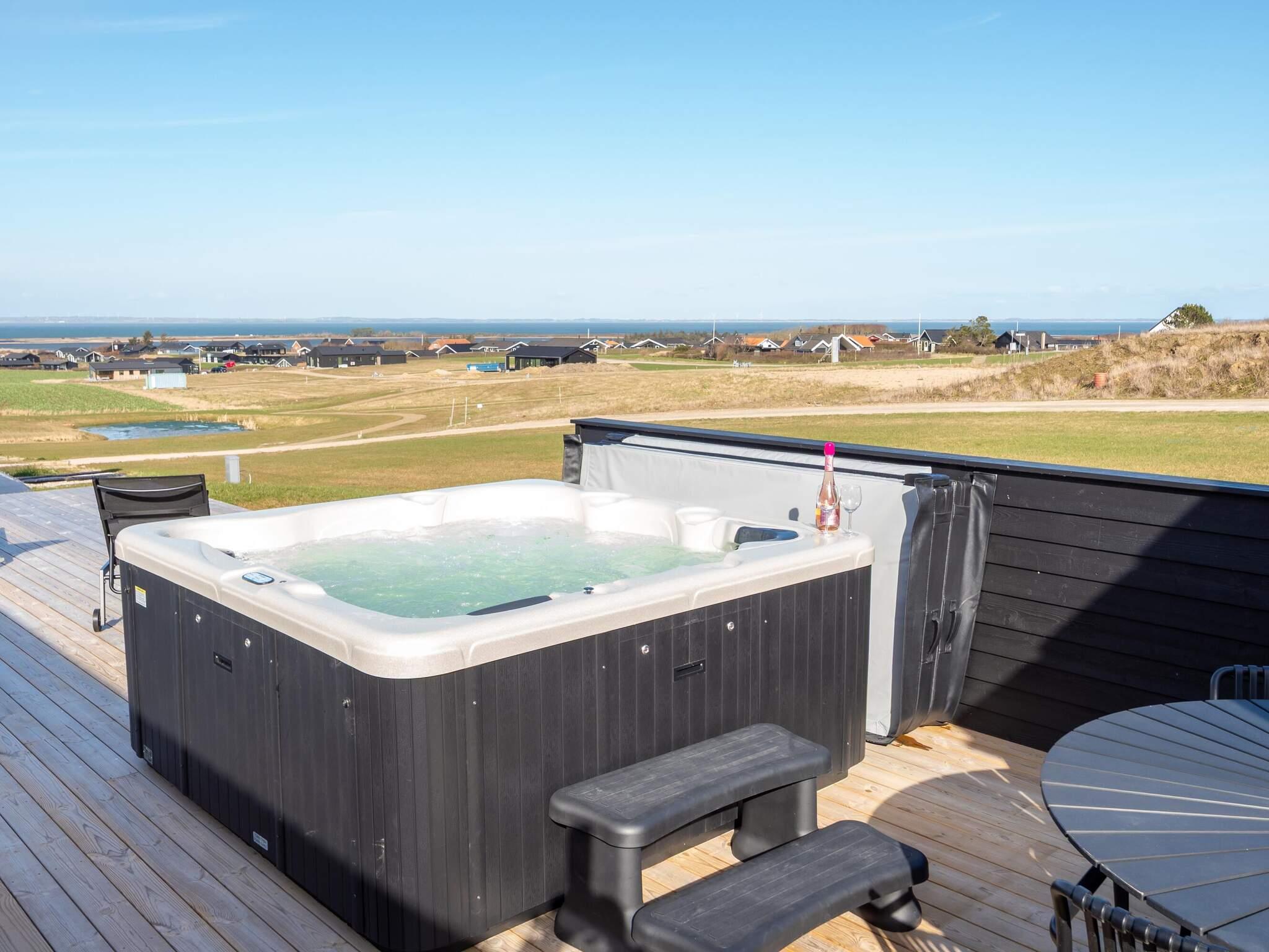 Luksus sommerhus (opført i 2025) med stor gennemgående træterrasse inkl. wellnessområde med udendørs spabad til 6 personer samt sauna til 4 personer.