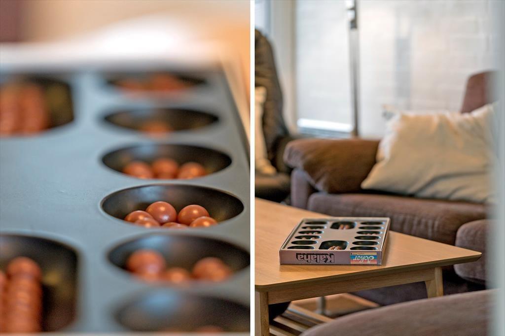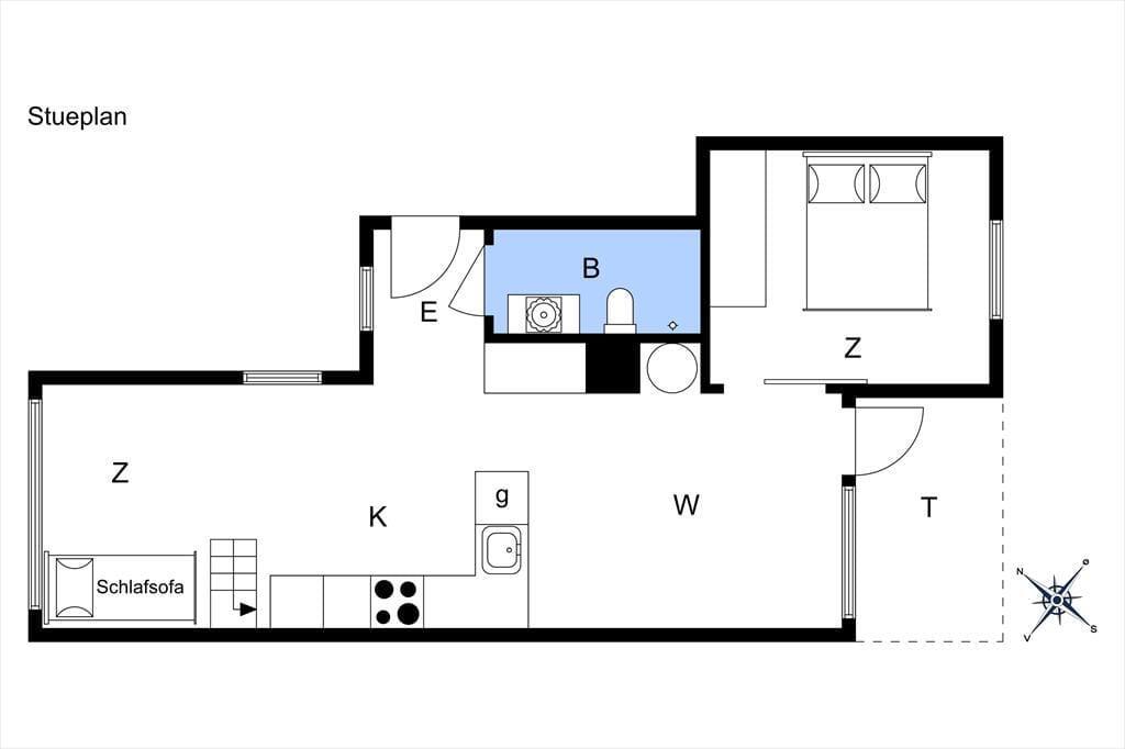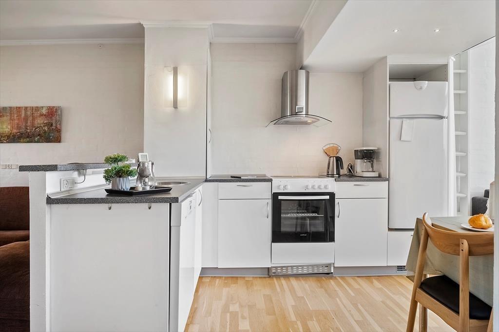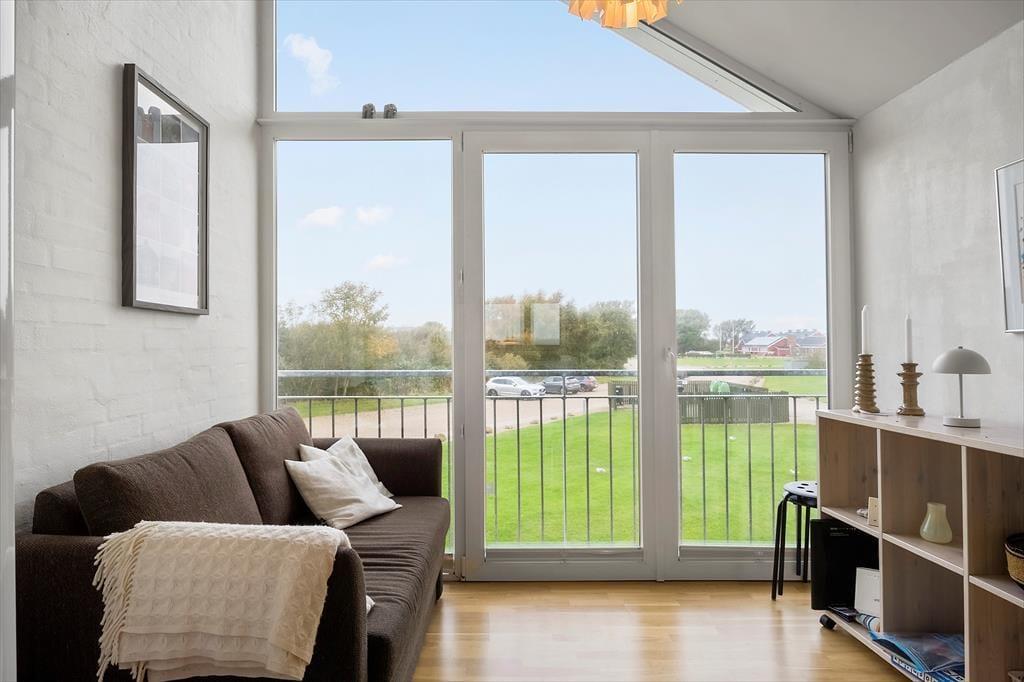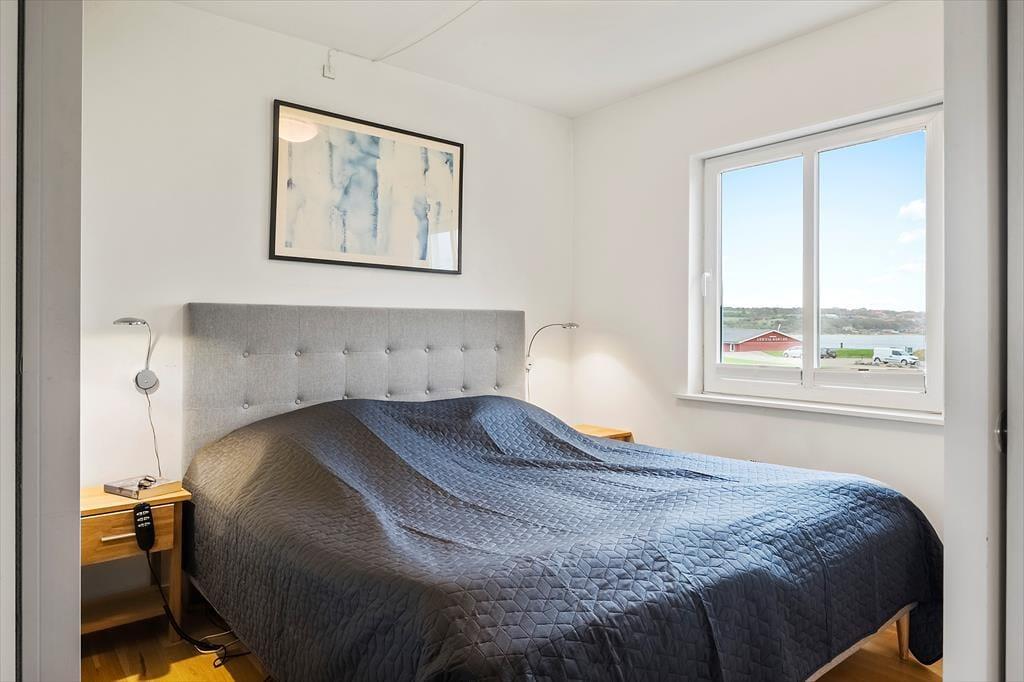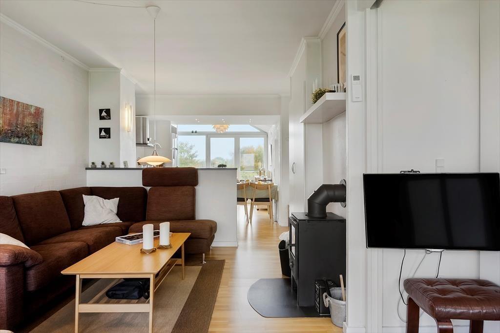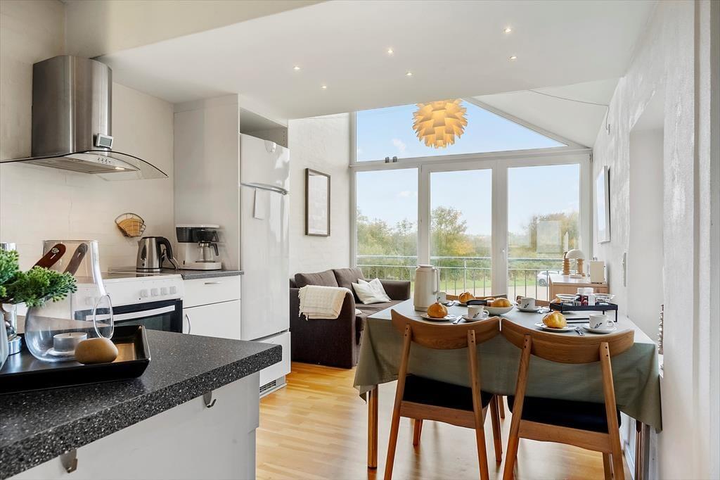 Lejligheden er lys og moderne indrettet med en afslappet atmosfære, der indbyder til ferie. Stue og køkken er integreret i ét rum, hvilket skaber et naturligt samlingspunkt til måltider, hygge og udsigt gennem de store vinduer. Indretningen er holdt i lyse farver og moderne materialer, som giver en let og luftig stemning. Her er god plads til både parret eller den lille familie, der ønsker komfortable rammer tæt på fjorden.