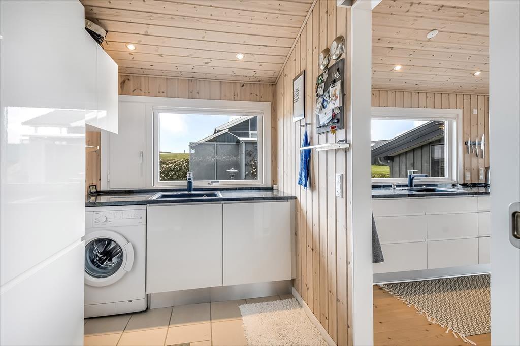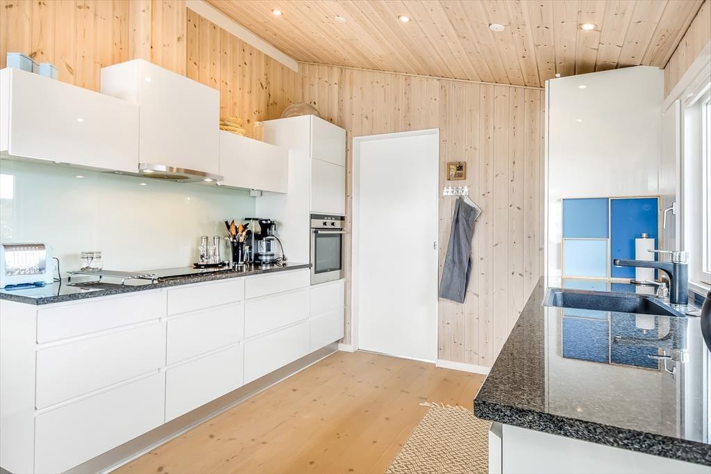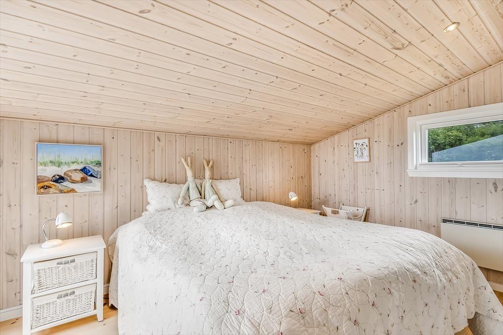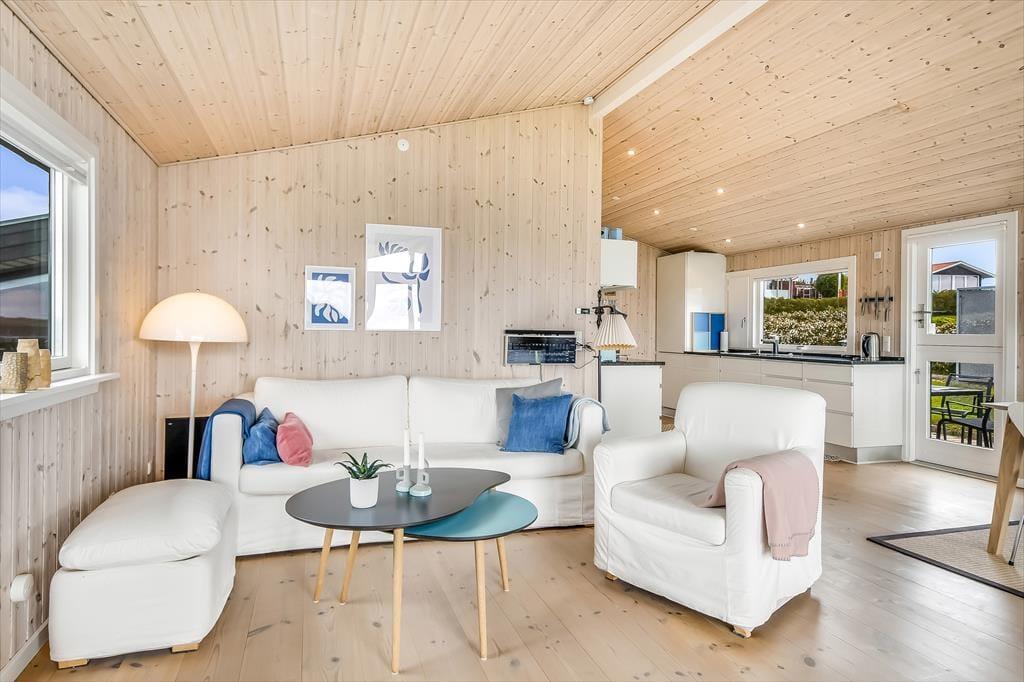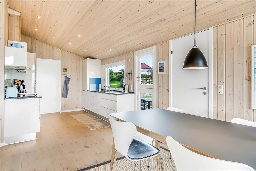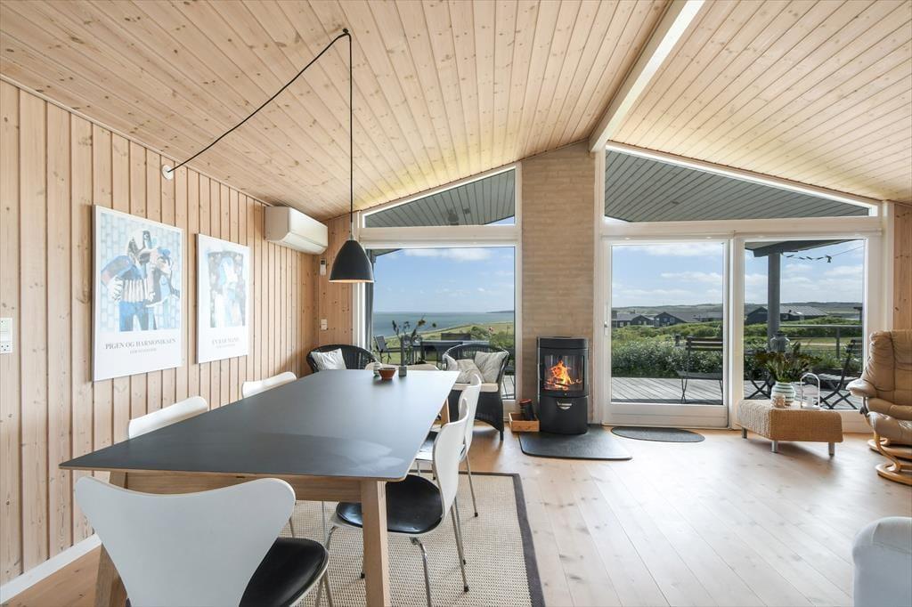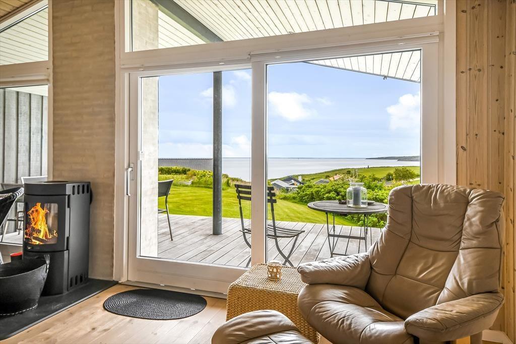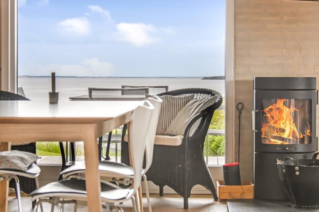 Det hyggelige sommerhus er indrettet med tanke på både komfort og feriestemning. Stuen har en varm og venlig atmosfære, hvor den klassiske brændeovn spiller en central rolle – perfekt til hyggelige aftener med en god bog, brætspil eller bare blikket hvilende på flammernes dans. Det åbne opholdsrum samler køkken, spiseplads og stue i ét, så feriedagene kan leves i fællesskab – uanset om du laver morgenmad, nyder frokosten eller lytter til musik i sofaen. Store vinduer trækker dagslyset og udsigten helt ind i rummet, og det milde lys fra fjorden skaber en beroligende stemning, som er svær at slippe igen. Her kan både par og små familier nyde en ferie i helt uforstyrrede omgivelser.