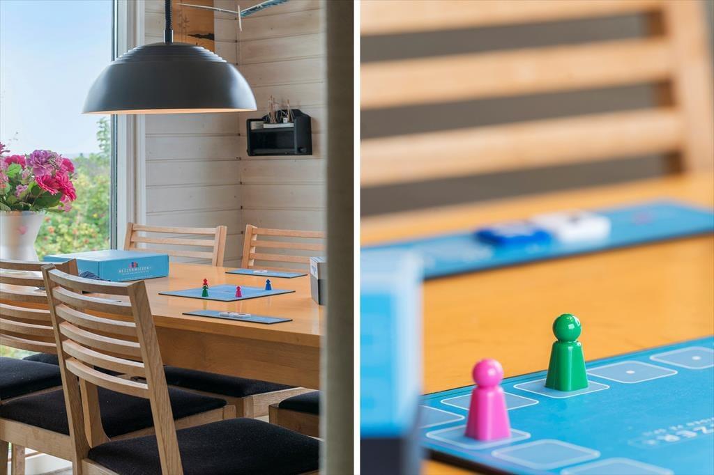 Sommerhuset er indrettet i en lys og venlig stil, hvor du straks føler dig hjemme. Stuen er husets naturlige samlingspunkt, og her kan I samles til spil, film og lange snakke, mens flammerne knitrer i brændeovnen og skaber en varm atmosfære. Fra stuen er der direkte adgang til den hyggelige udestue, hvor du kan nyde udsigten til haven, mens solens stråler luner bag ruderne – også på dage, hvor vinden rusker lidt udenfor. Køkkenet ligger i åben forbindelse med opholdsrummet, så feriens måltider kan tilberedes i selskab med resten af familien, og med flere gode soveværelser er der plads til, at alle kan finde sig til rette og slappe af efter en dag fuld af oplevelser.