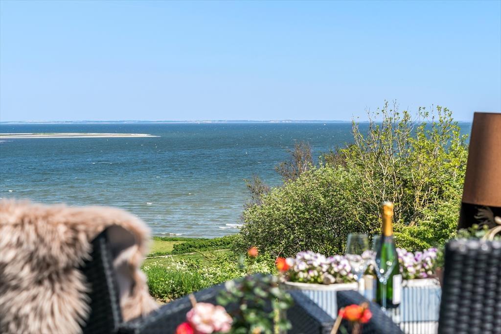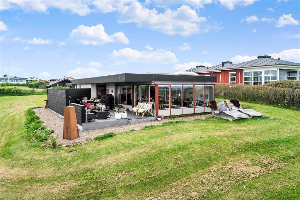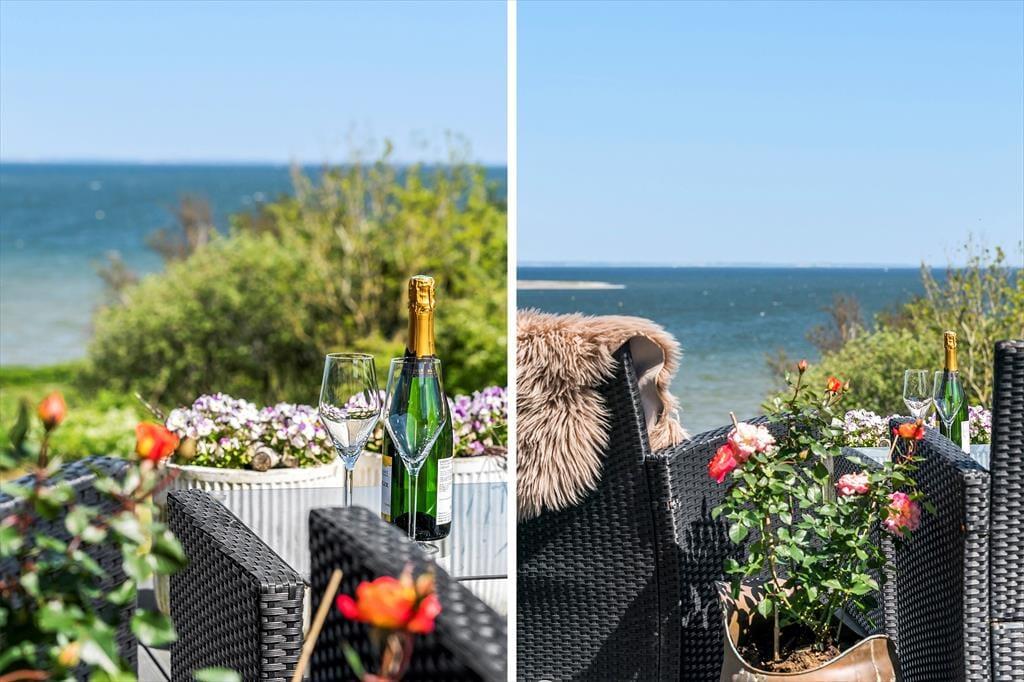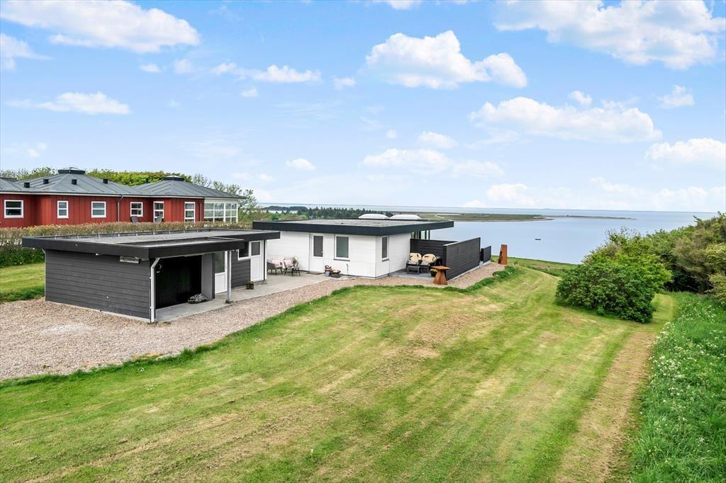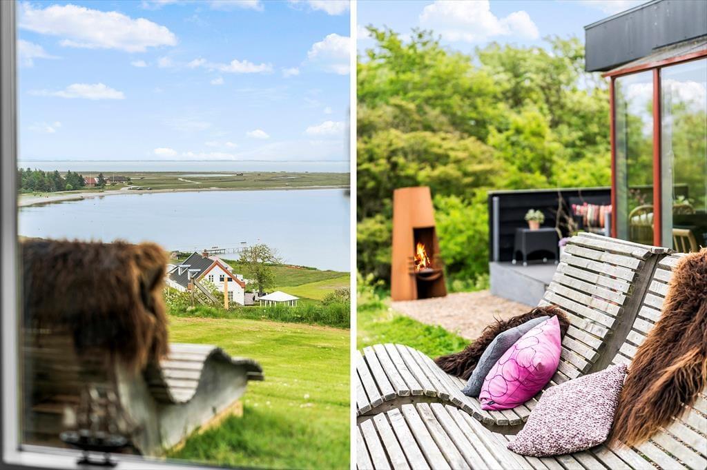 Sommerhuset ligger midt på en mere end 1500 m2 stor grund, der har en dejlig, skrånende græsplæne. Rundt om huset finder du flere terrasser, der giver dig og dine kære en perfekt ramme om driverlivet: Her er der lækre kvalitetshavemøbler at slå sig ned i, og med grillpejs, puder og andre hyggedetaljer er det tydeligt at se, at udelivet kan blive mindst lige så komfortabelt som de indendørs afslapningsstunder. Den sydøstvendte terrasse vil sandsynligvis blive din foretrukne, for når du sidder her, kan du dvæle ved fjordudsigten, mens du lytter til fuglesang og nyder solen.