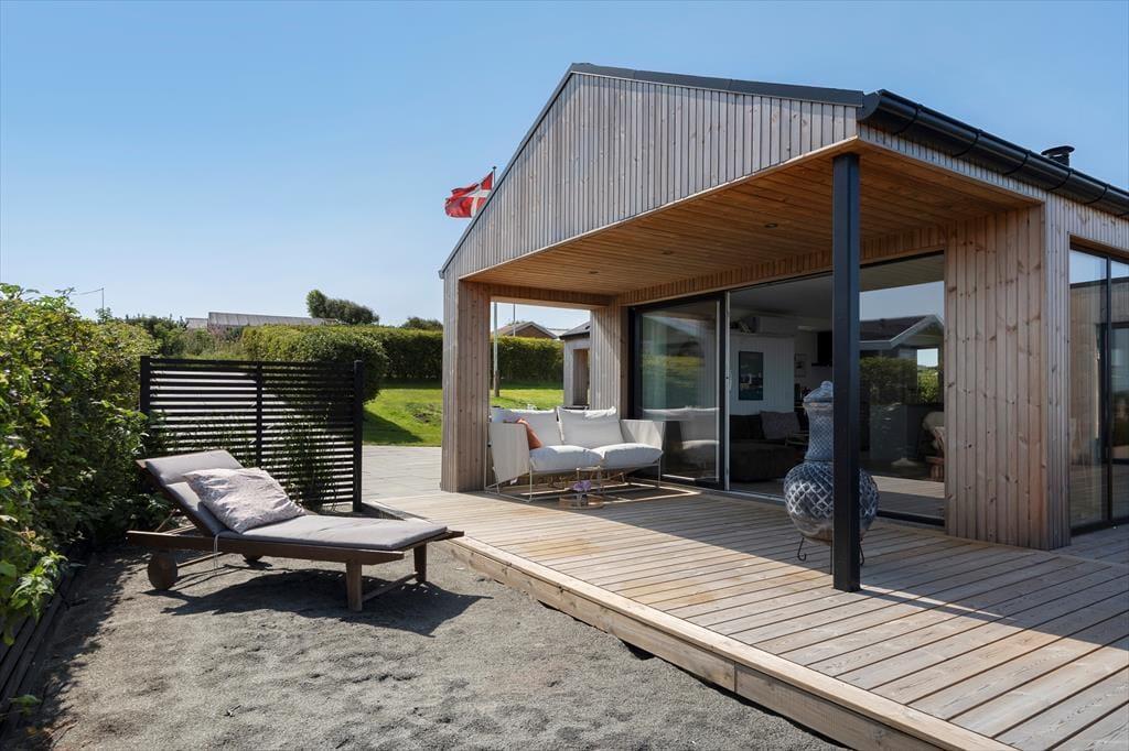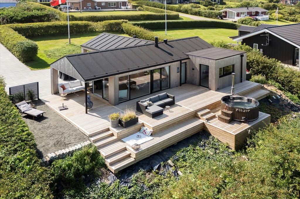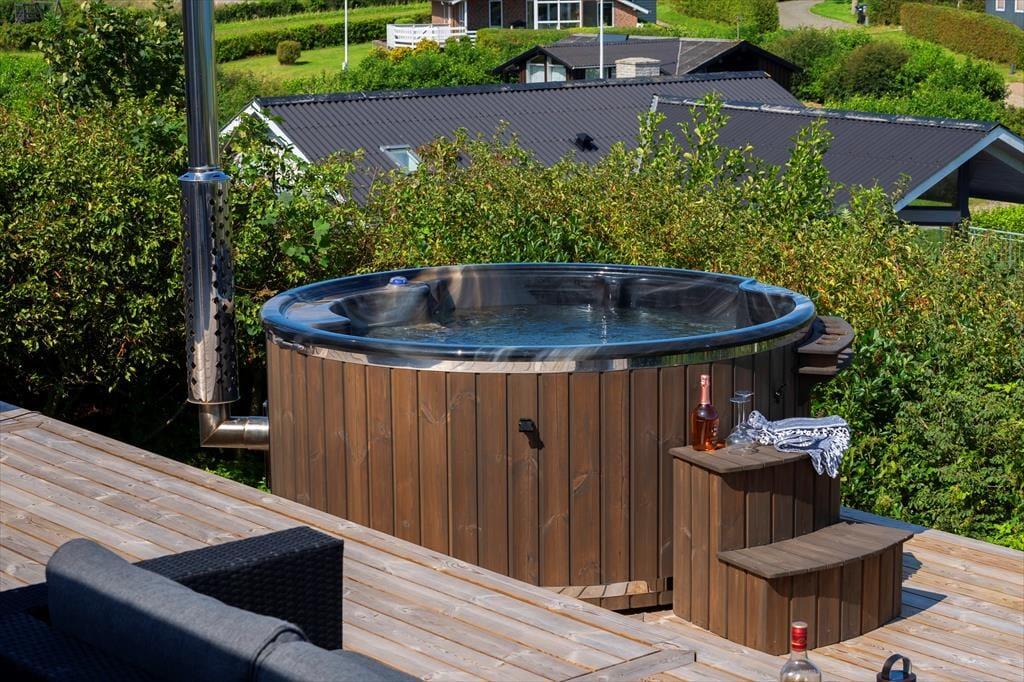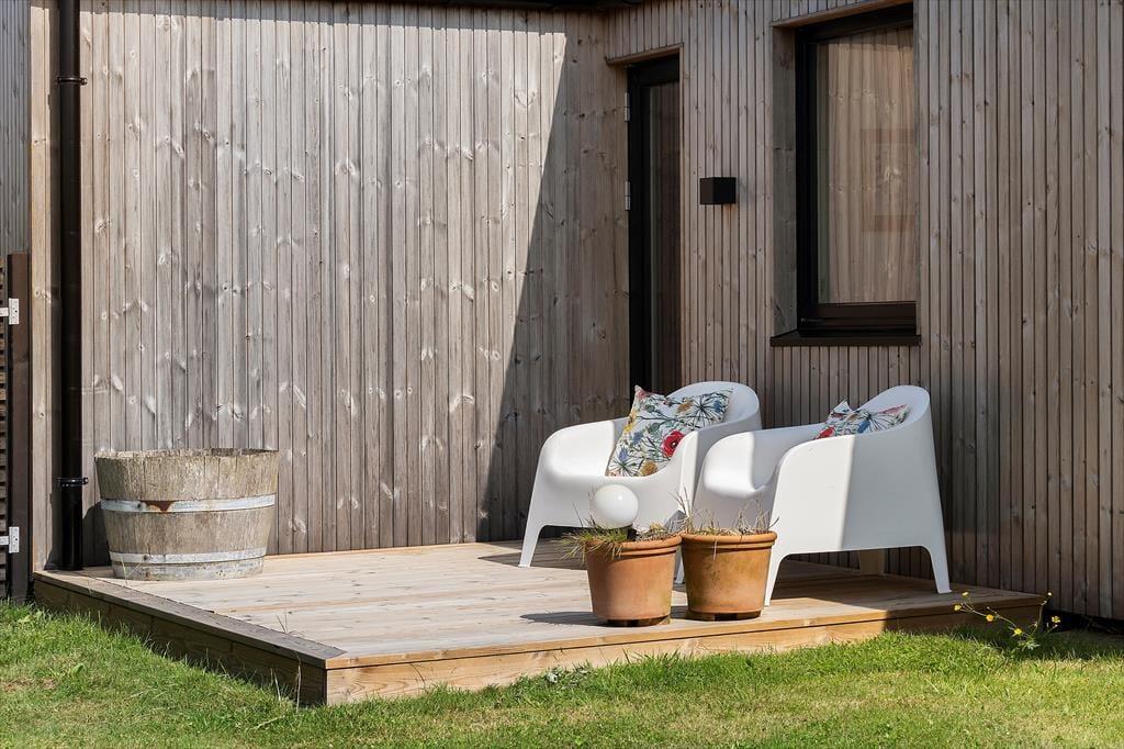 Terrassen er i sig selv en attraktion – hele 100 m², hvoraf 20 m² er overdækket, så du kan nyde udelivet i både solskin og regn. Flere små kroge giver mulighed for at finde lige præcis den plads, der passer til stemningen – om du vil sidde i morgensolen med en kop kaffe, nyde en rolig stund i læ for vinden eller samles om grillen til aften. Og når dagen går på hæld, kan du lade vildmarksbadets varme vand og den vidunderlige udsigt over fjorden være dagens perfekte afslutning. Har du hunde med, er det oplagt at lade dem udforske området omkring huset, hvor den friske fjordluft altid er til stede.