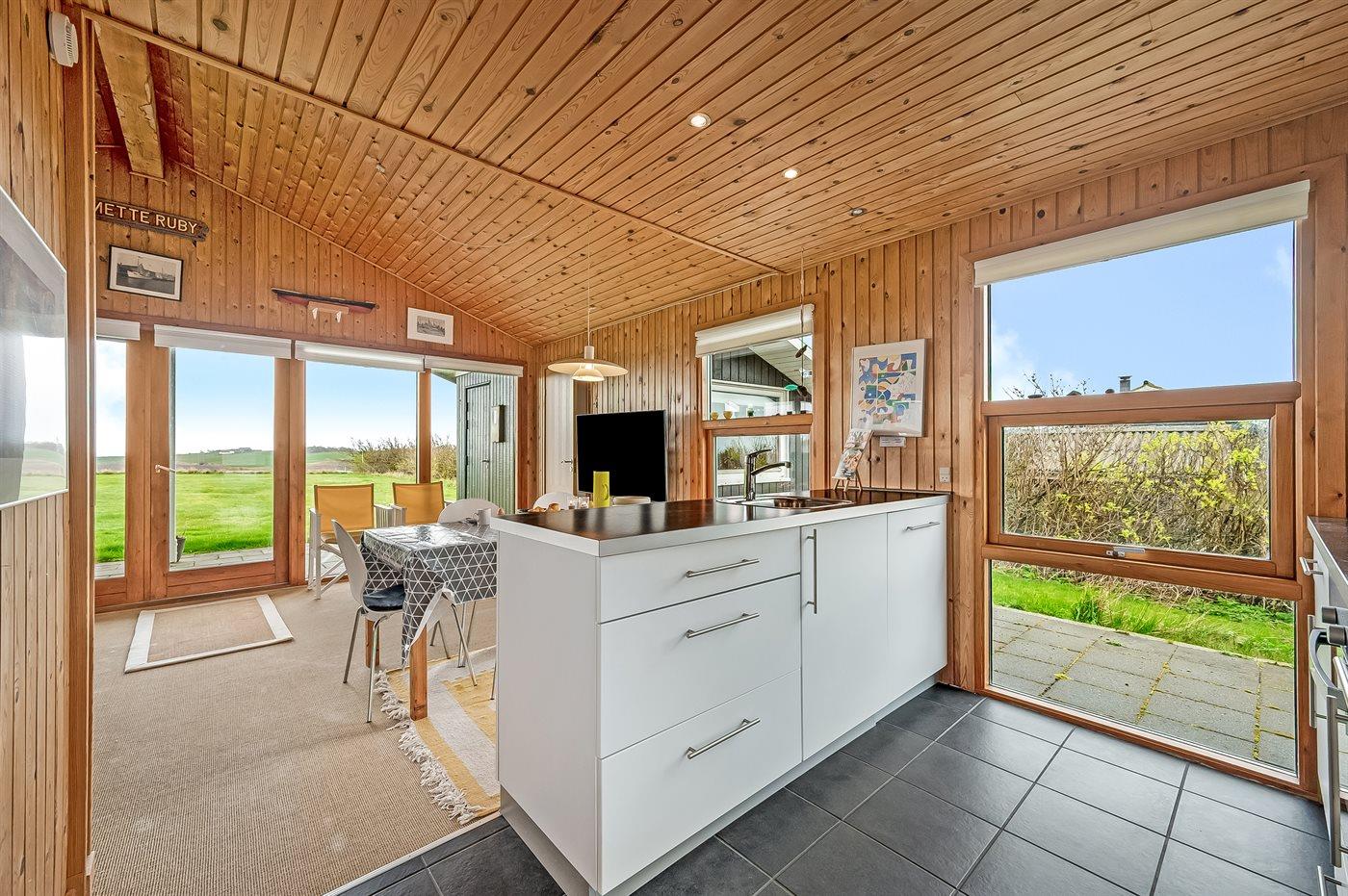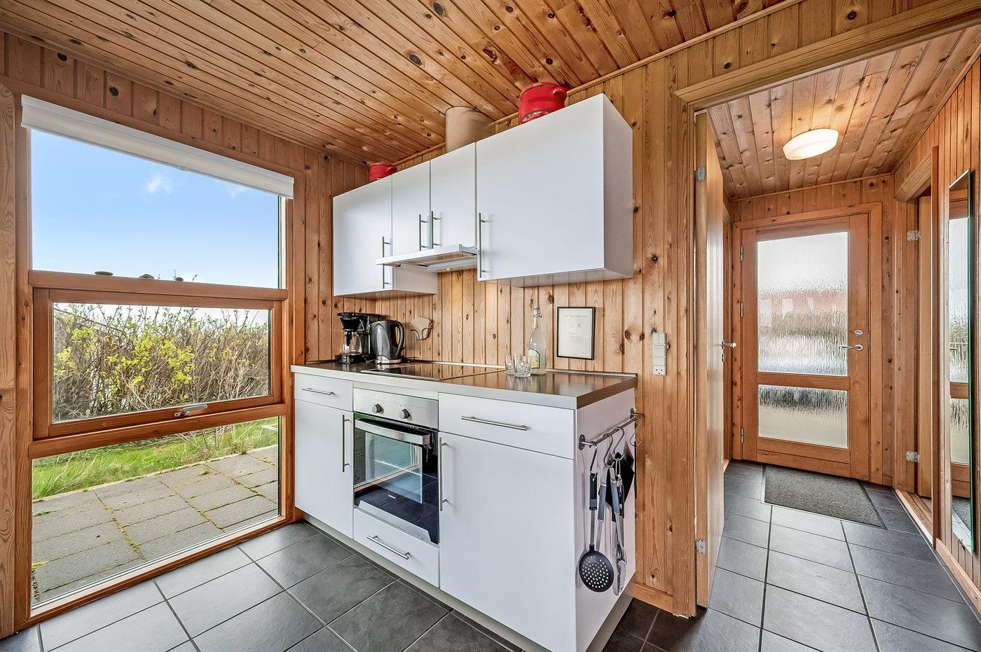 Køkkenet er udstyret med 1 køleskab. Der er 4 keramiske kogeplader, varmluftovn samt opvaskemaskine.