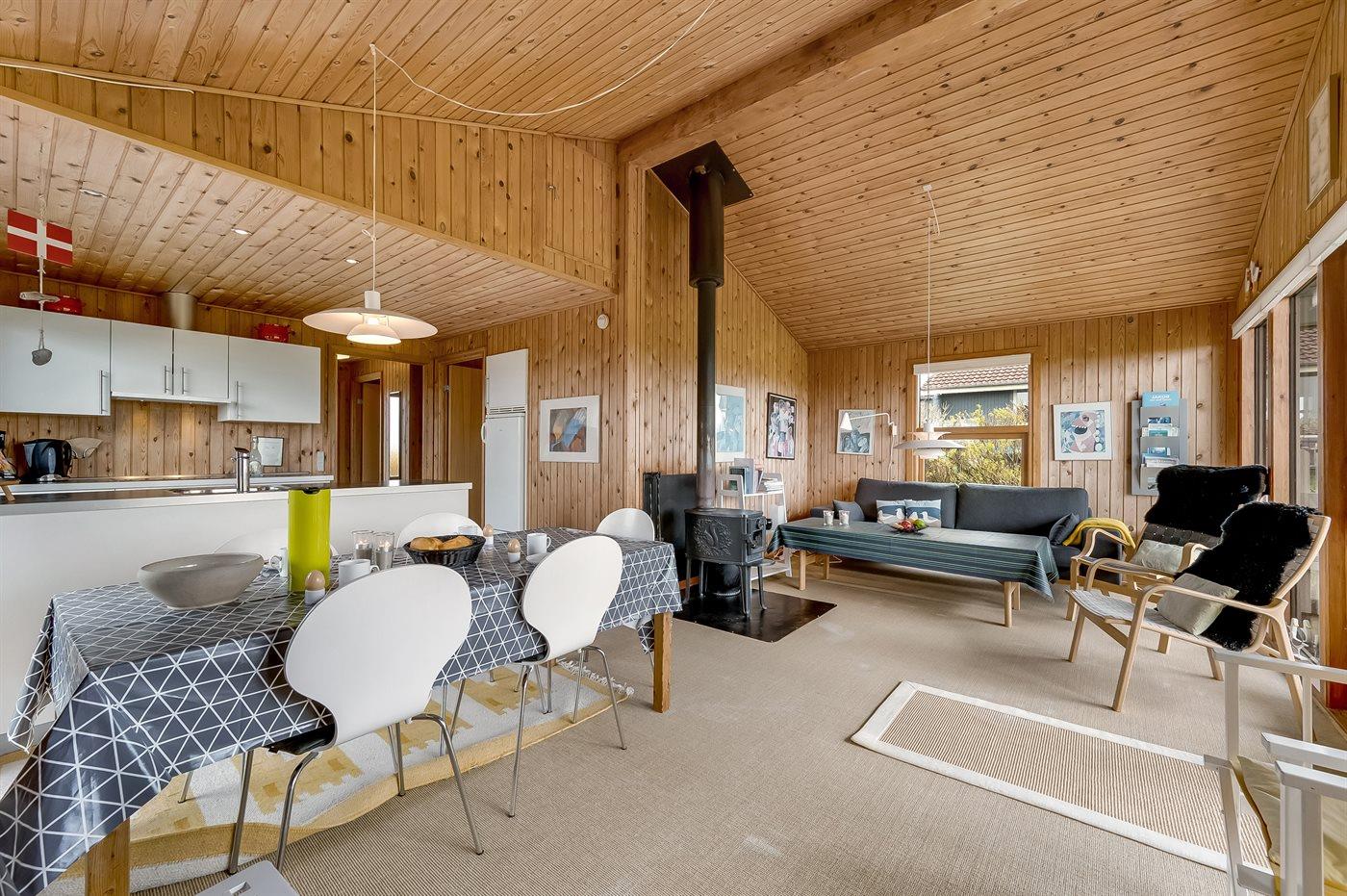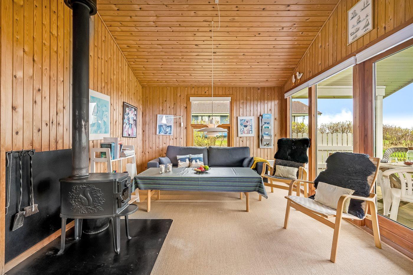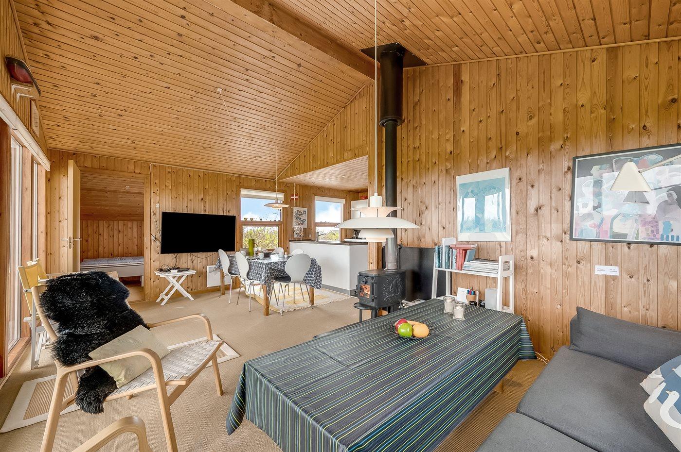 Selve feriehuset byder på en autentisk sommerhusstemning, hvor man, mens ilden knitrer i brændeovnen, kan læse en god bog.