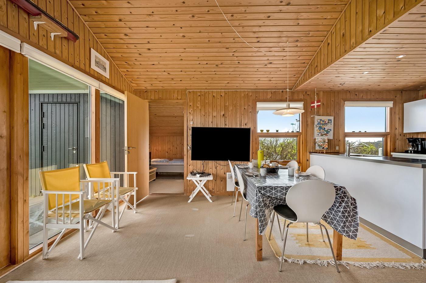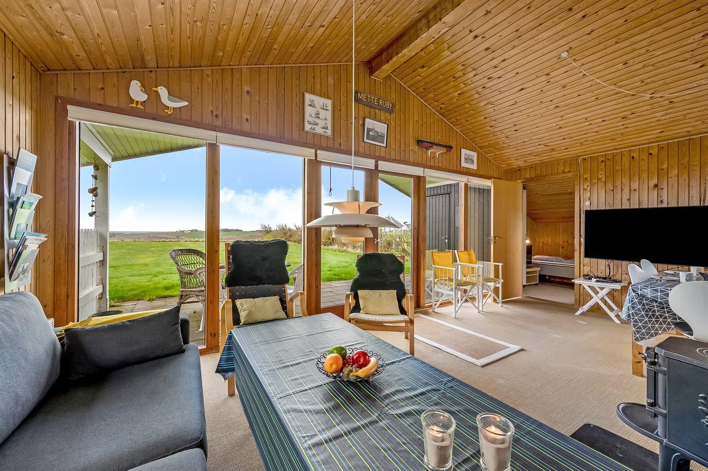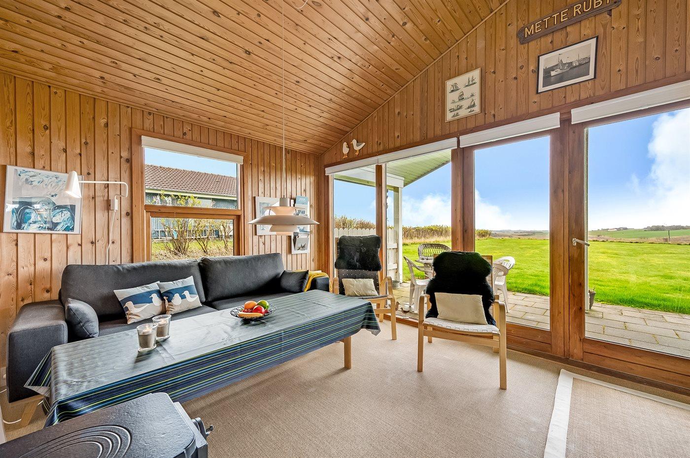 Selve feriehuset byder på en autentisk sommerhusstemning, hvor man, mens ilden knitrer i brændeovnen, kan læse en god bog.
