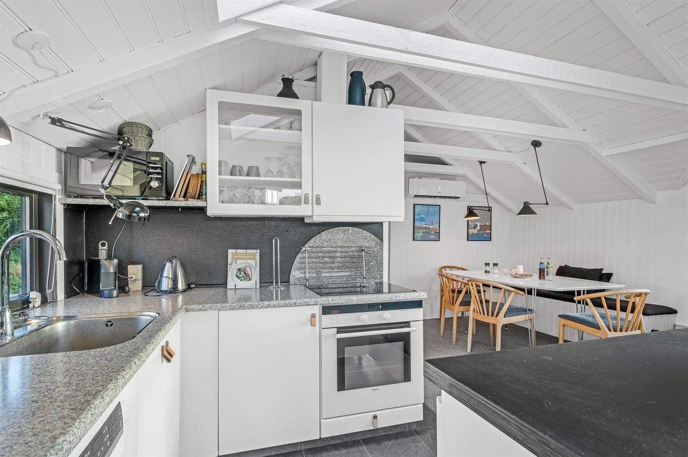 Køkkenet er udstyret med 1 køleskab. Der er 4 induktionskogeplader, varmluftovn, mikrobølgeovn samt opvaskemaskine.