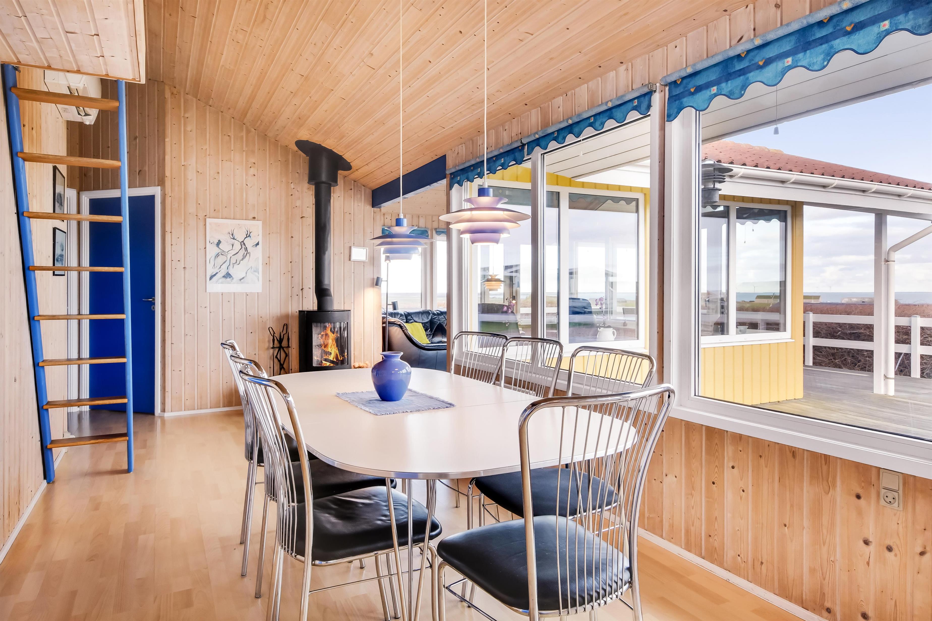 Dette dejlige træferiehus ligger ideelt på en 1.600 m² stor udsigtsgrund med en fantastisk panoramaudsigt over Limfjorden og det omkringliggende landskab. Husets store vinduer giver et lyst og venligt indeklima, og vægge og loft er beklædt med ludbehandlet træ. Overalt i huset ligger trægulve, mens badeværelserne har klinkegulve med gulvvarme.