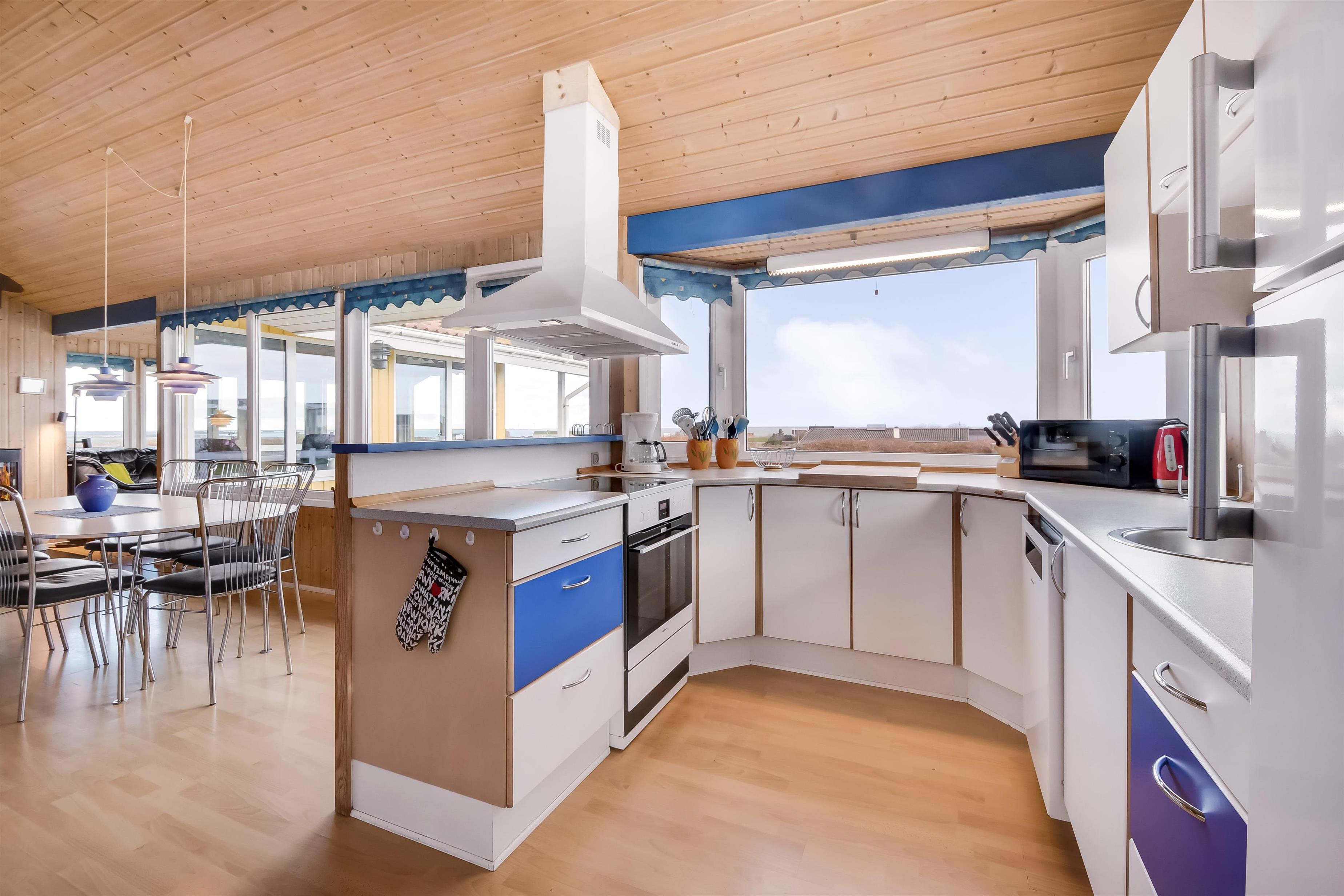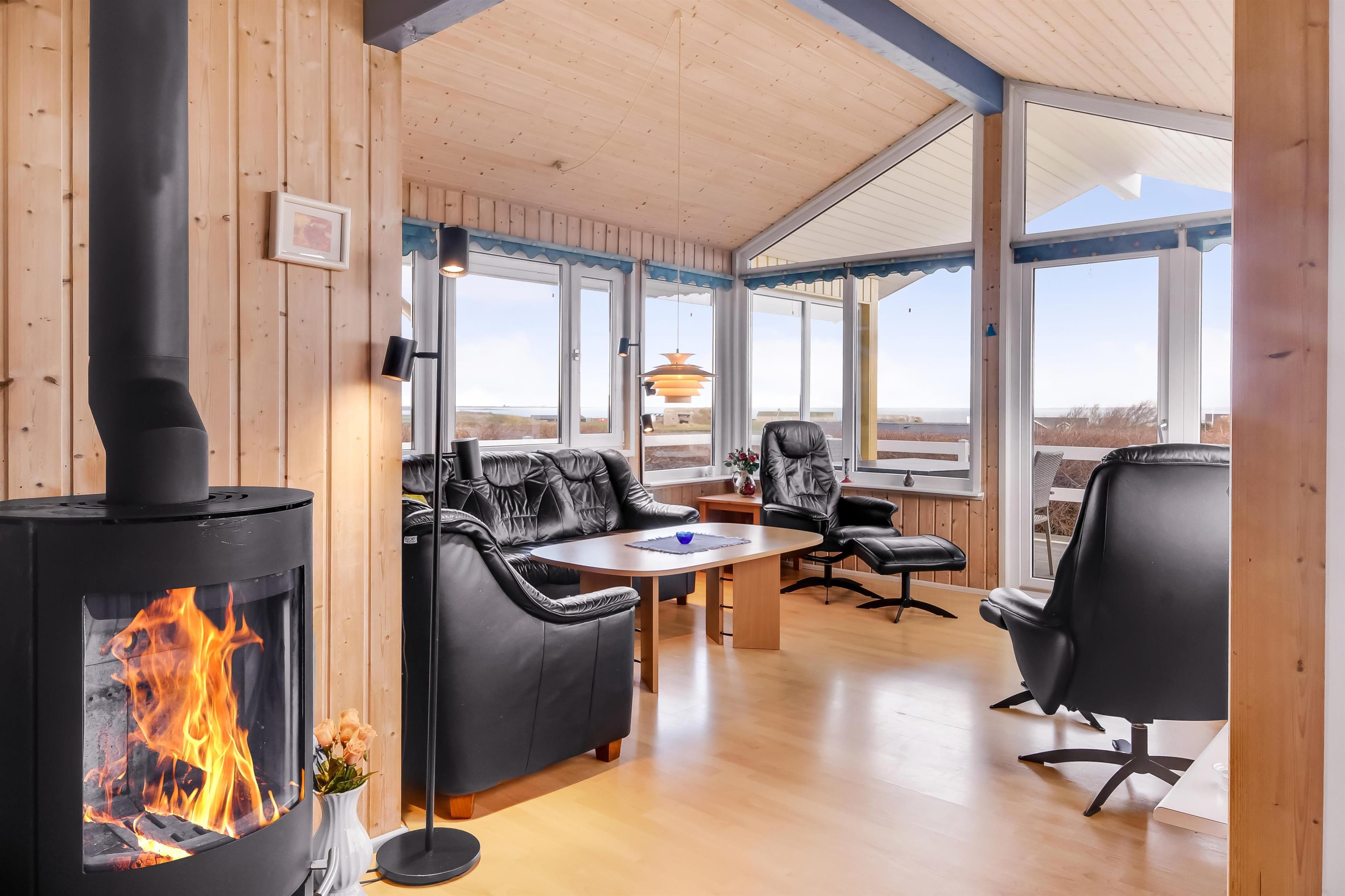 Køkkenet er velindrettet og kombineret med stuen, som byder på kamin, farve-tv med DR1 og satellit (med tyske kanaler). Der er installeret varmepumpe for ekstra komfort.