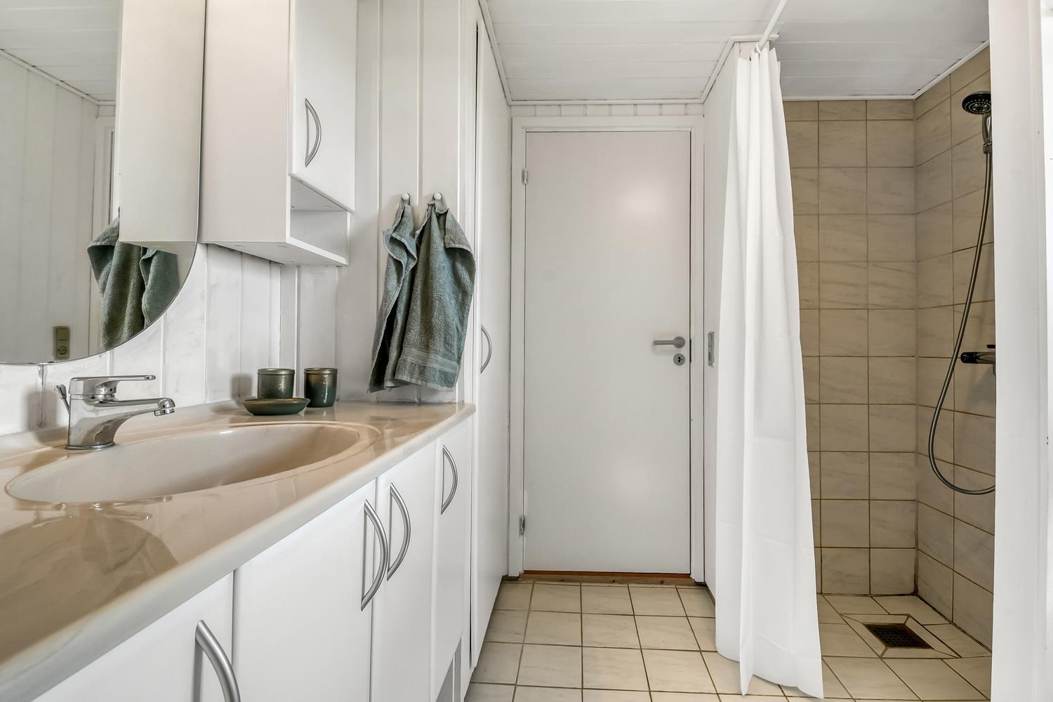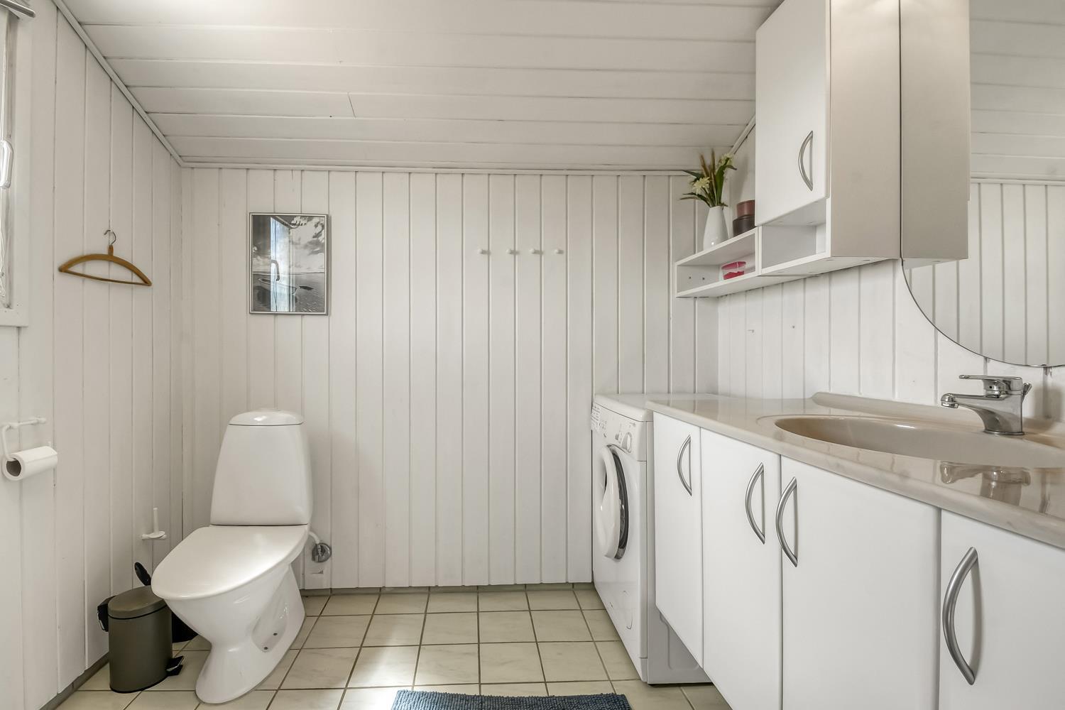 Flot, delvist overdækket terrasseanlæg med havemøbler, liggestole og grill som kan flyttes rundt på terrassen alt efter vejr og vind og efter hvor der findes en plads i solen. Ved terrassen er der også et lækkert vildmarksbad som opvarmes med træ - en unik oplevelse i al slags vejr. Højt, ugeneret beliggende på en stikvej på en velholdt grund på ca. 1.804 m2. Fra huset findes der er dejligt stisystem, som på få minutter fører direkte ned til vandet. Ca. 300 m fra huset ligger den nye flotte naturlegeplads i træ med fodboldbane og rutsjebane og der er heller ikke langt til indkøb eller til stranden ved Gjellerodde.