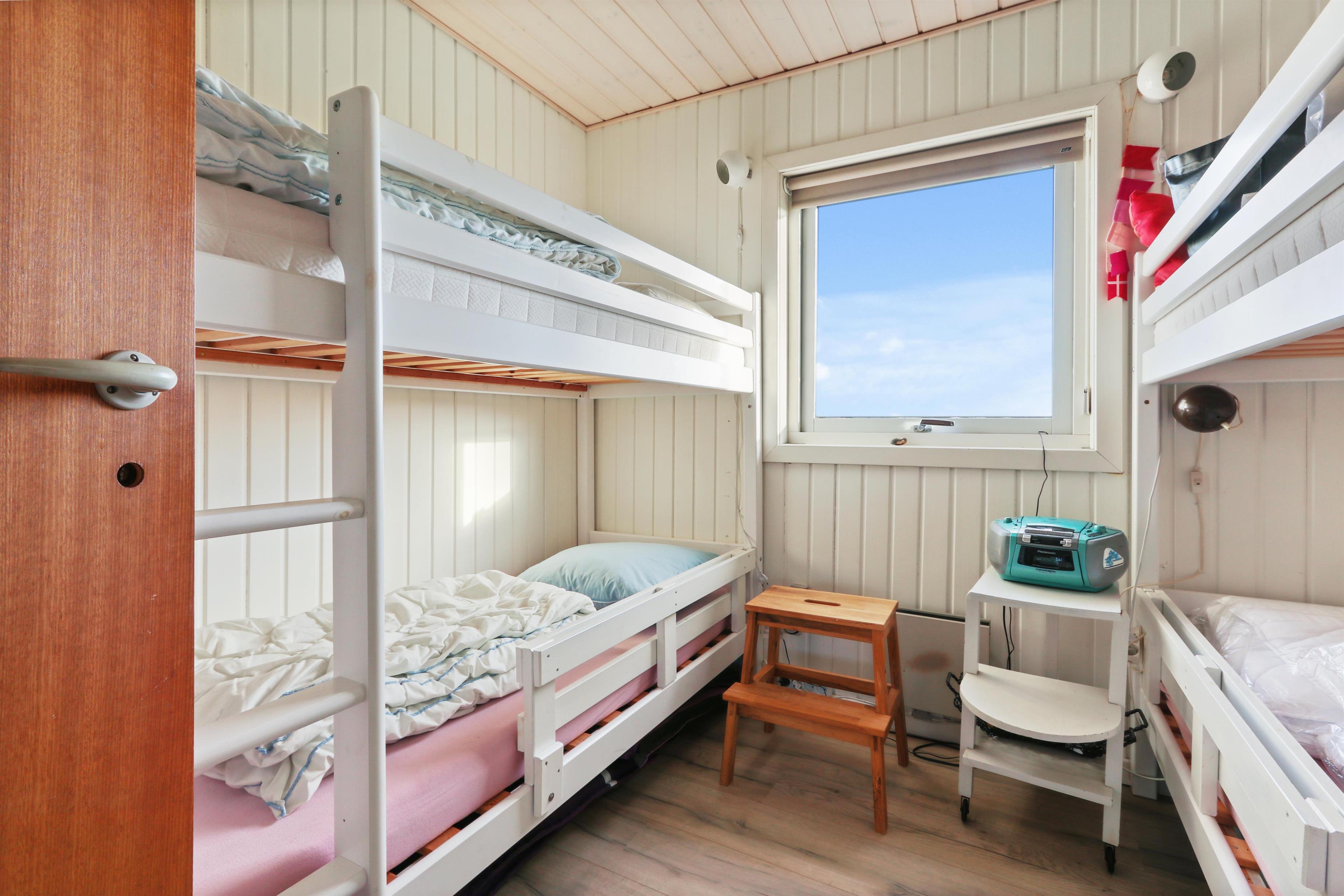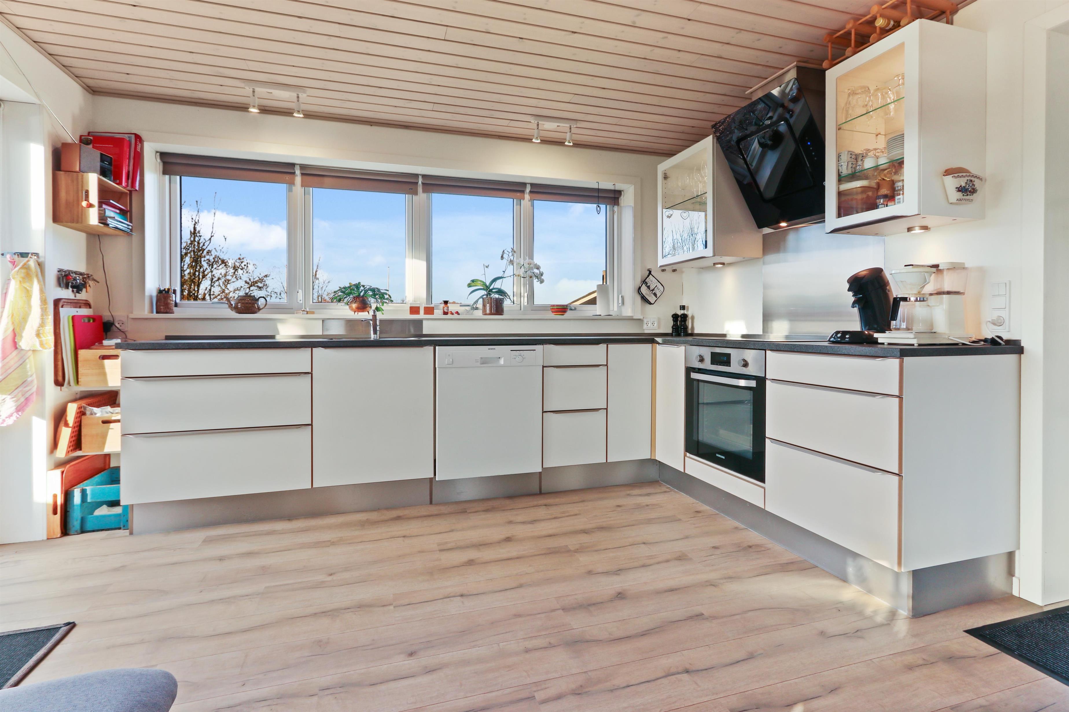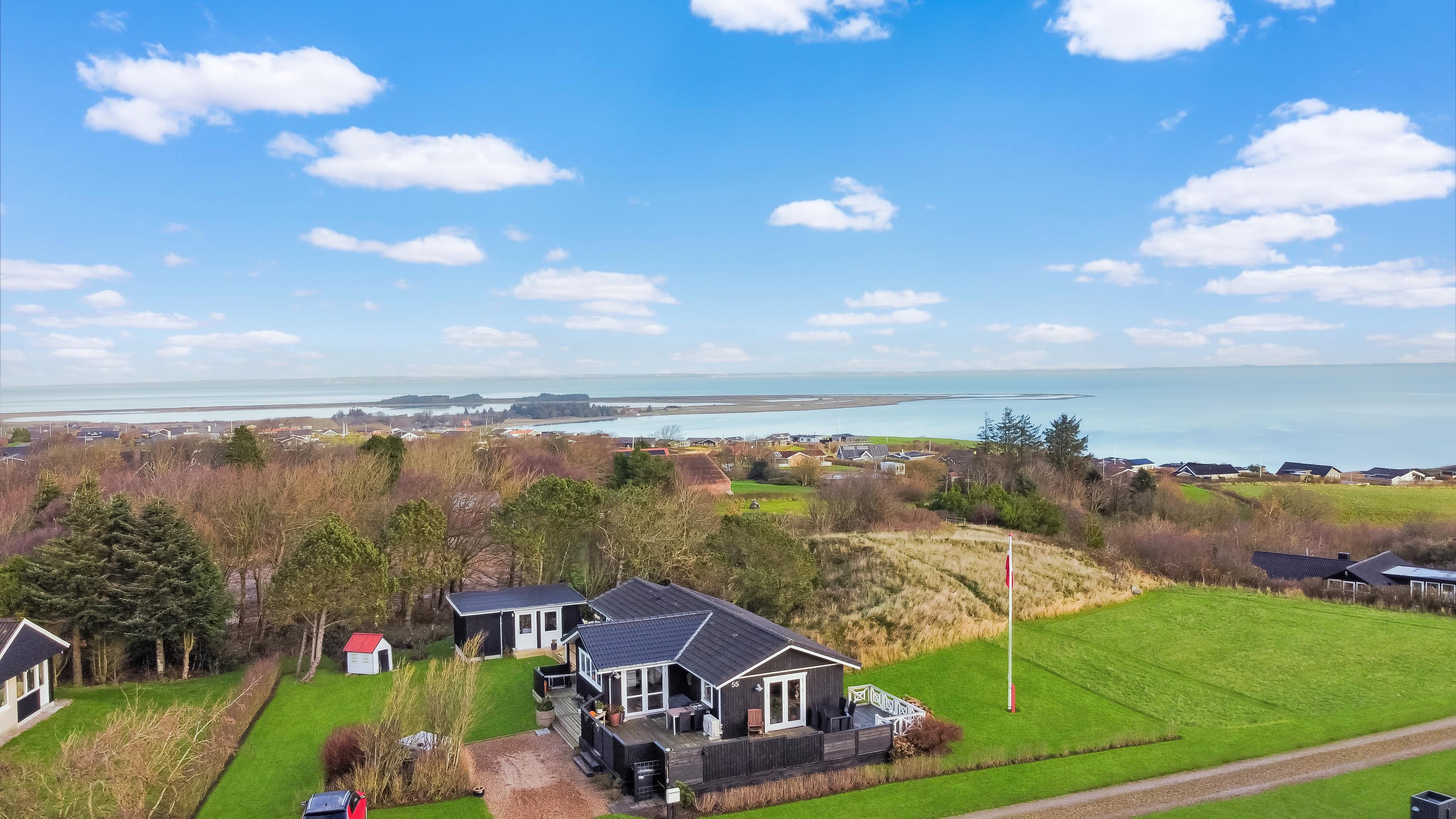 Feriehuset har en størrelse på 85 m2 og er flot istandsat i 2020 og løbende. Når man træder ind i huset, står man i husets dejlige lyse og indbydende hjerterum, som består af kombineret køkken og stue. Fra stuen og køkkenet er der udgang til husets store terrasse, hvorfra udsigten er et levende maleri. Husets køkken er udstyret med induktionskogeplader, indbygningsovn, emhætte, mikroovn, opvaskemaskine og køle-/fryseskab. Køkkenet har et stort vinduesparti, der giver et flot lysindfald og Vesterhavet kan anes i horisonten. Går man videre fra køkkenet bliver man mødt af stuen der er hyggelig og personlig indrettet. Stort vinduesparti giver dejligt lys til hele rummet, som også er med til at gøre stuen mere rummelig og herfra kan udsigten mod Limfjorden nydes. Stuen er udstyret med polstermøbler, fjernsyn hvorfra man kan streame egne apps via Chromecast og der er en DAB-radio. I stuen er der opsat en varmepumpe, der er med til at holde strømforbruget nede. Stuen giver plads til hele familien og er indbydende at tilbringe film- og spille-aftener. Fra stue og køkken kommer man ud i gangen, hvorfra man kommer til badeværelset og soveværelserne. Badeværelset er optimalt udnyttet og her forefindes toilet, håndvask og bruser. Desuden er der en vaskemaskine, hvis tøjet skulle trænge til en vask i løbet af ferien. Huset har 3 soveværelser, hvor det største er med 1 dobbeltseng og der er adgang til et eget toilet. Desuden har det store soveværelse også egen udgang til terrassen. Det andet soveværelse er med 1 dobbeltseng og i det sidste soveværelse er der 2 køjesenge. Til de mindste gæster er der 1 barnestol til rådighed.