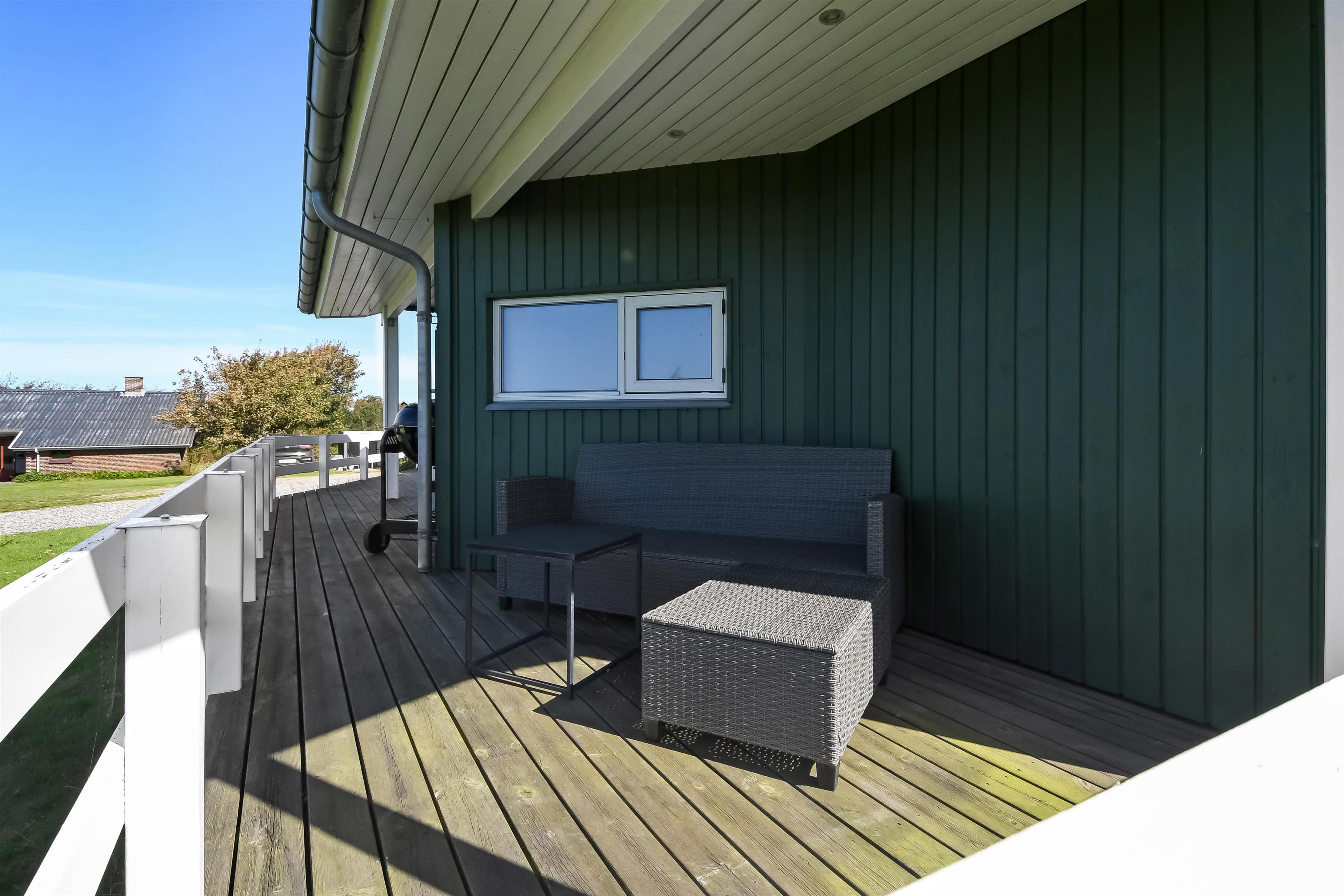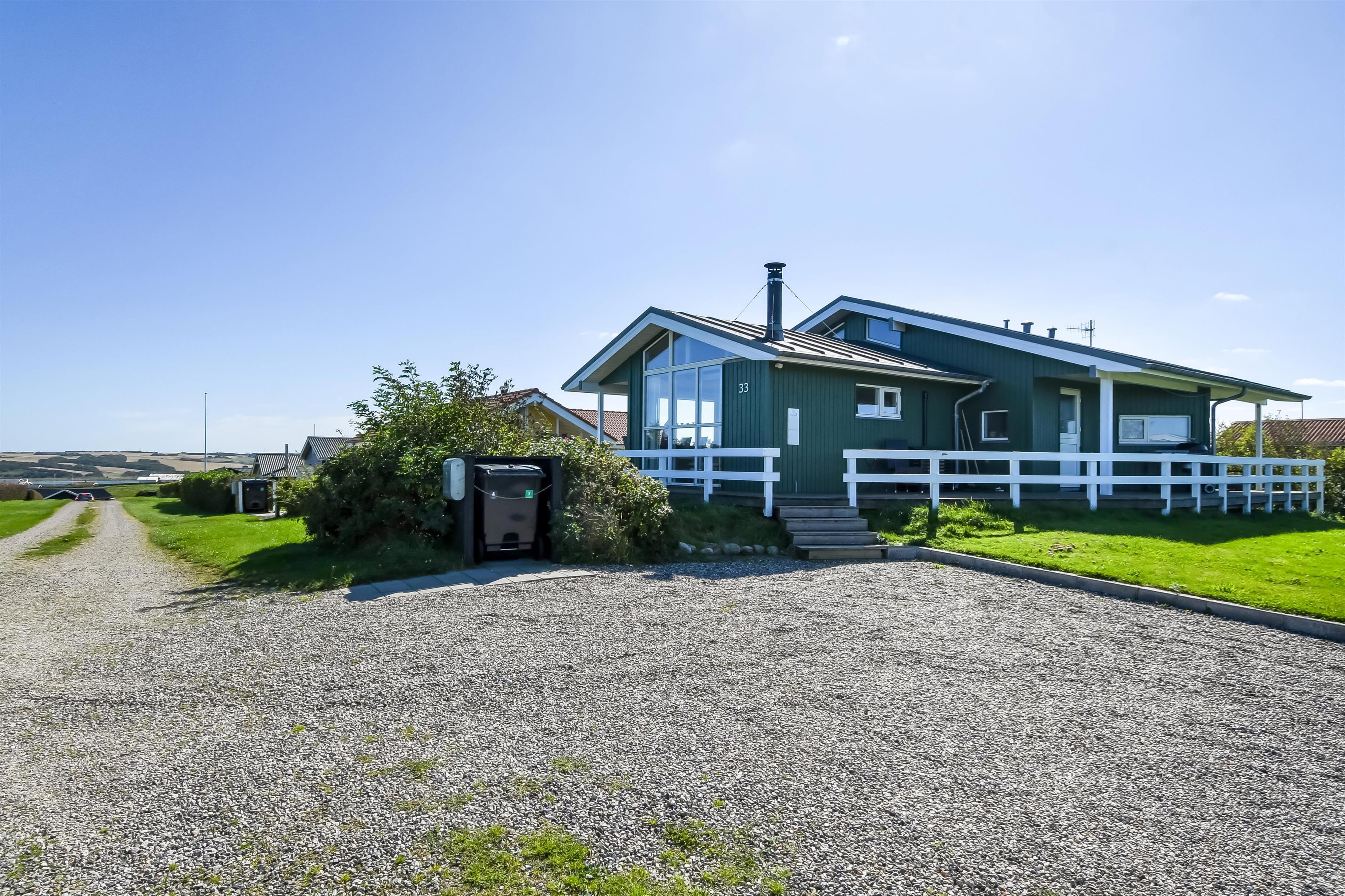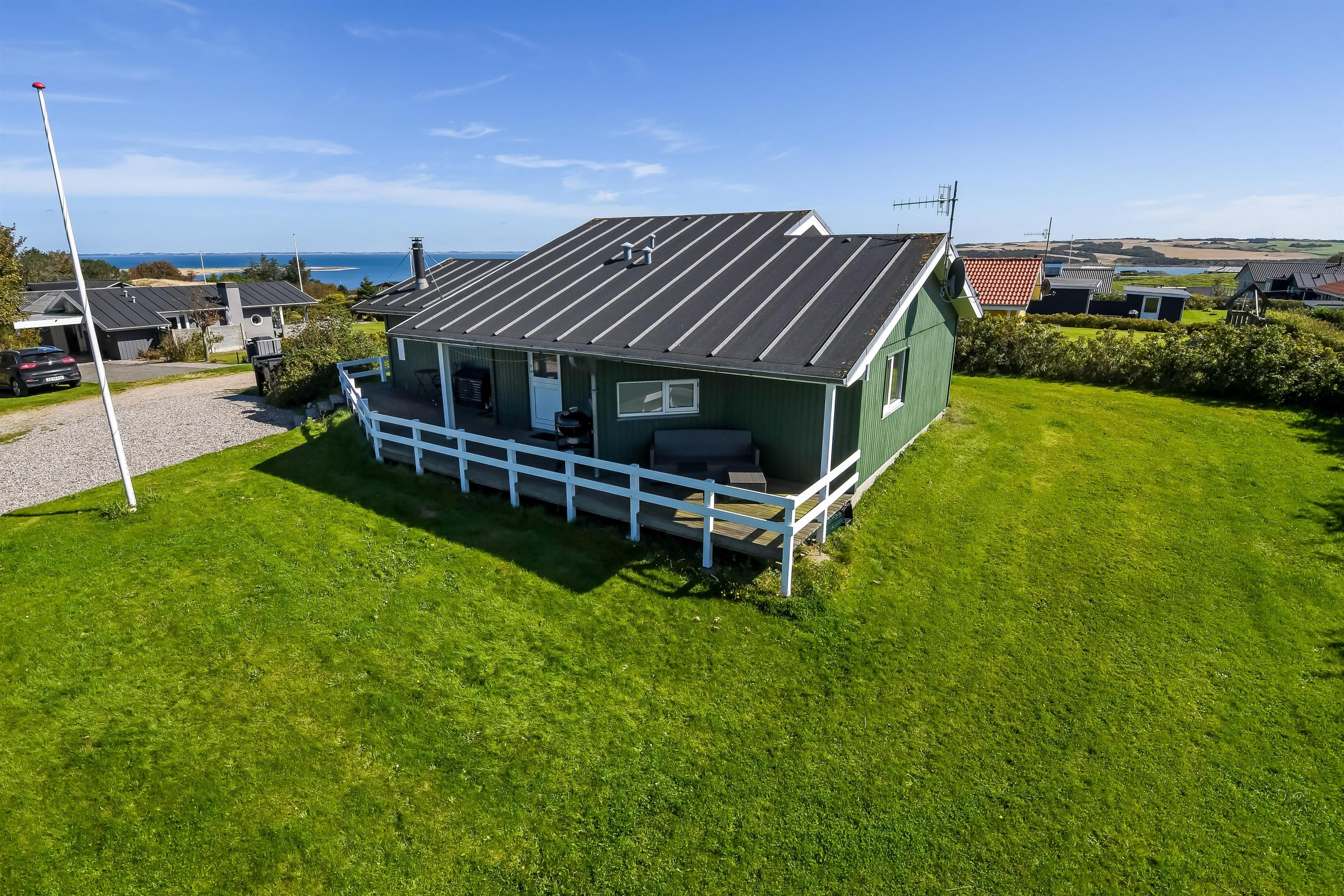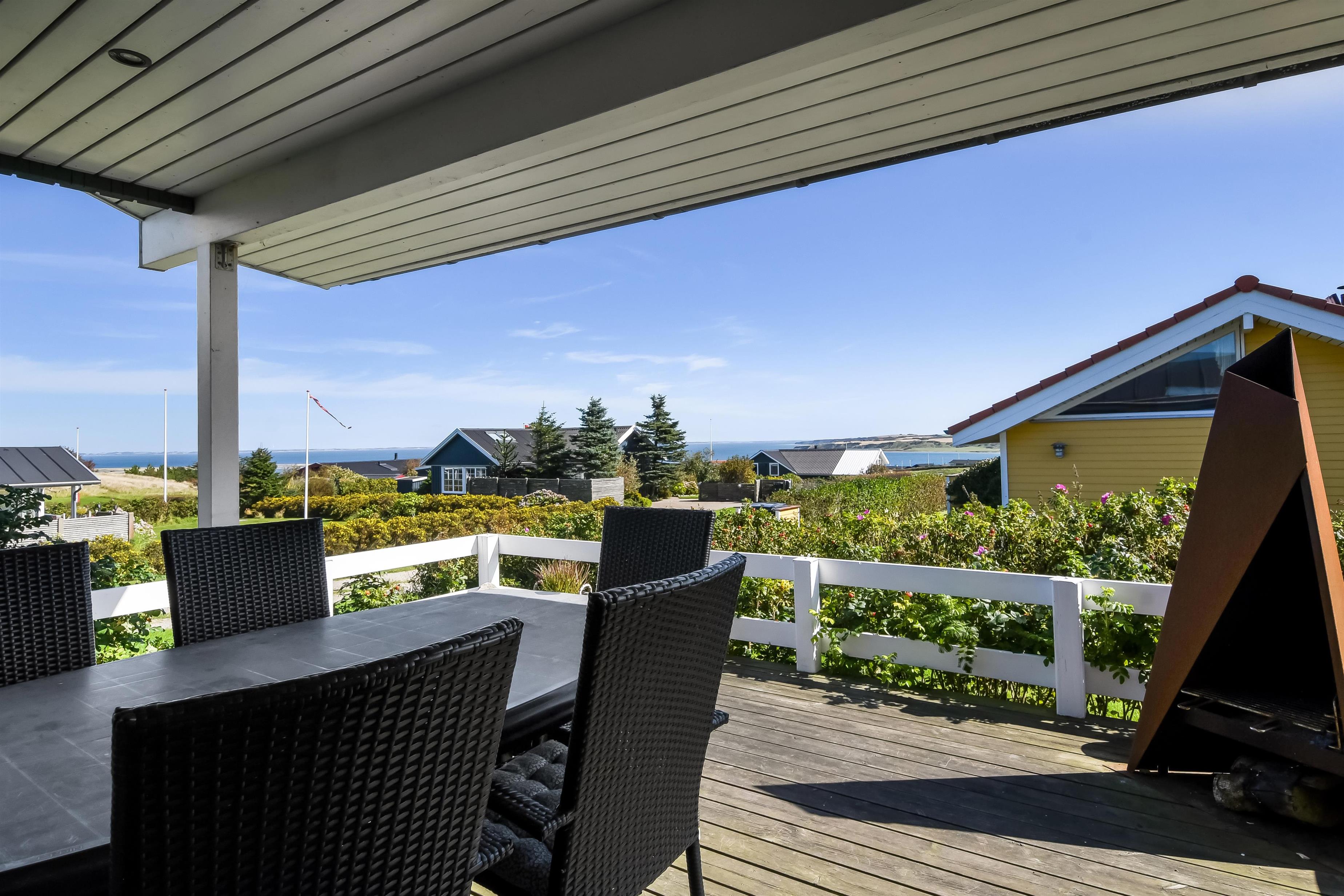 Huset har både åbne og overdækkede terrasser, udstyret med havemøbler og grill, som kan tilpasses efter behov. Uanset hvor du sidder, vil du kunne nyde læ- og solforholdene, og udsigten til Limfjorden er helt fantastisk. Der er et dejligt stisystem, som hurtigt fører dig ned til vandet. Cirka 500 meter fra huset ligger en ny, flot naturlegeplads i træ med både fodboldbane og rutsjebane – et hit for både store og små.