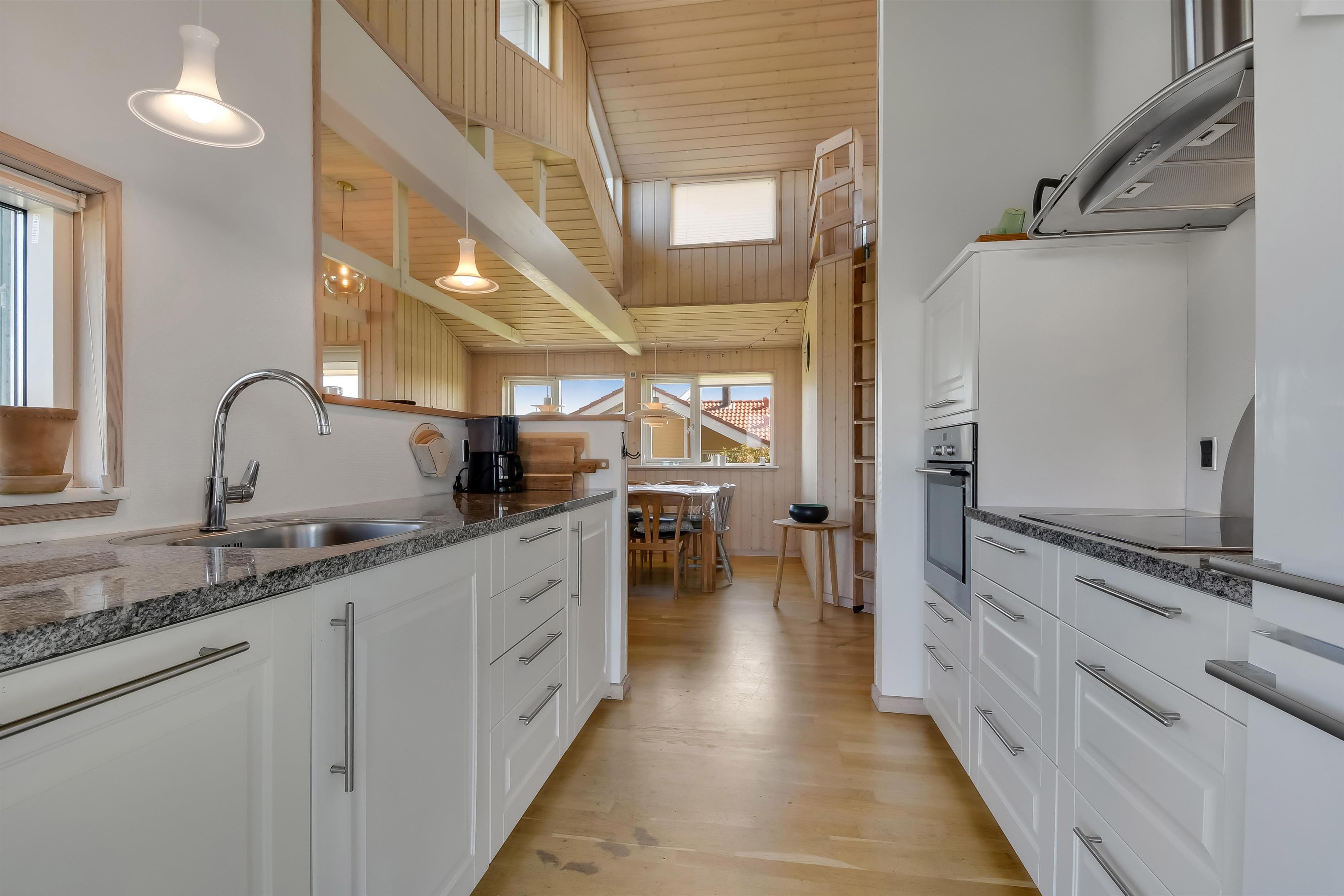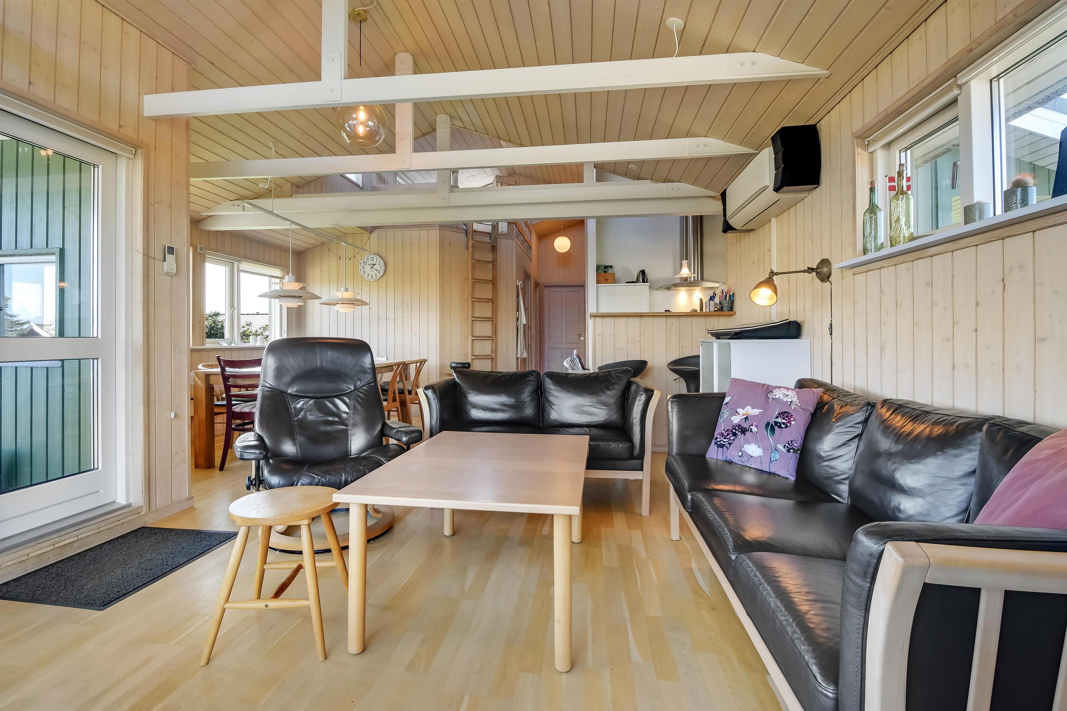 Når du kører op til huset, vil du straks lægge mærke til den enestående beliggenhed. Indenfor åbner huset sig op med en hyggelig og indbydende atmosfære, hvor lædermøbler og en rummelig spiseafdeling skaber den perfekte ramme om samvær. Den åbne loftshøjde og de store vinduespartier giver masser af naturligt lys og en smuk udsigt over fjorden fra flere steder i huset. Det moderne køkken er udstyret med alle nødvendige teknologiske hjælpemidler, og fra stuen er der adgang til en hems med 2 sovepladser – ideel til ekstra overnattende gæster.