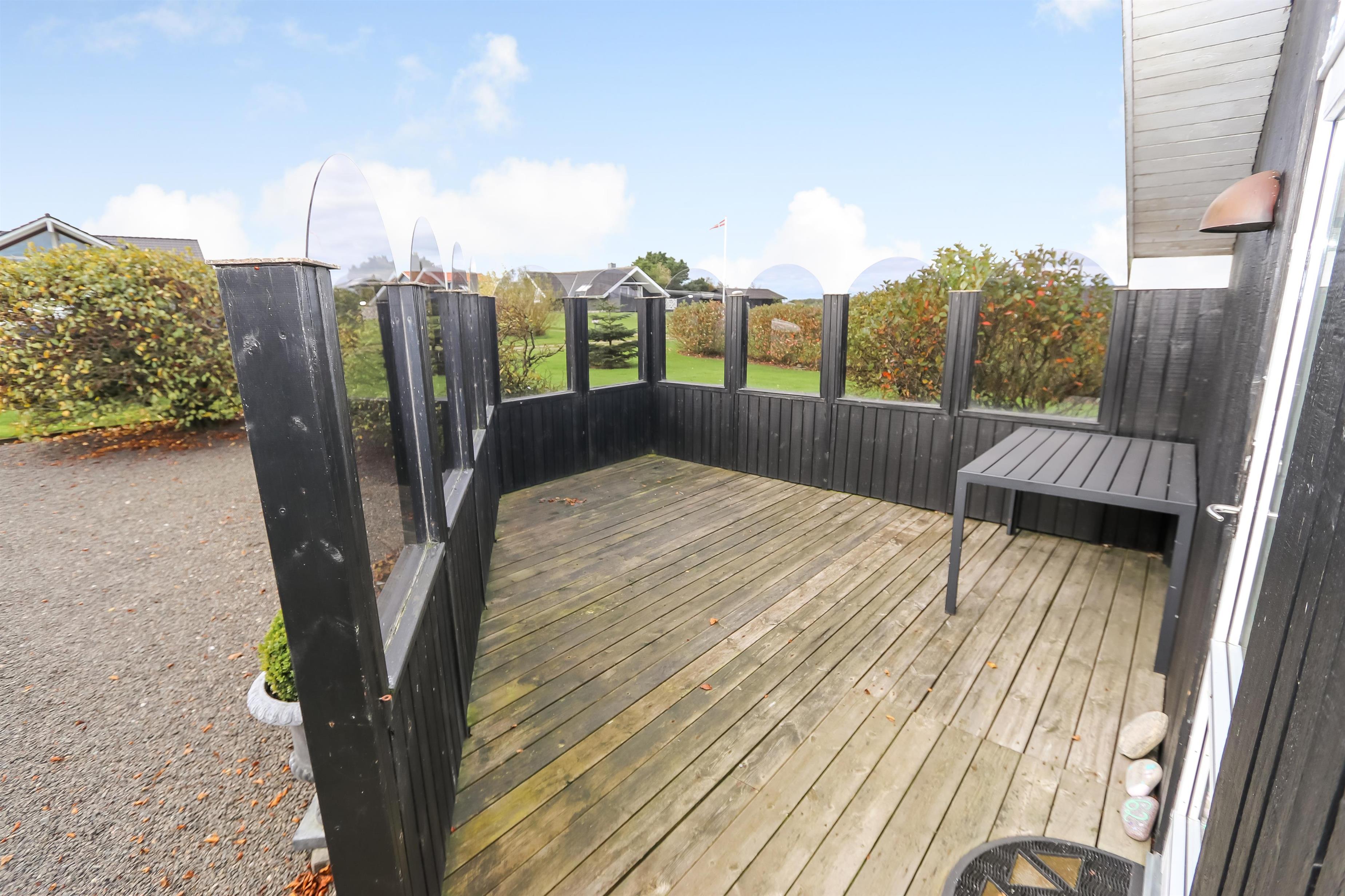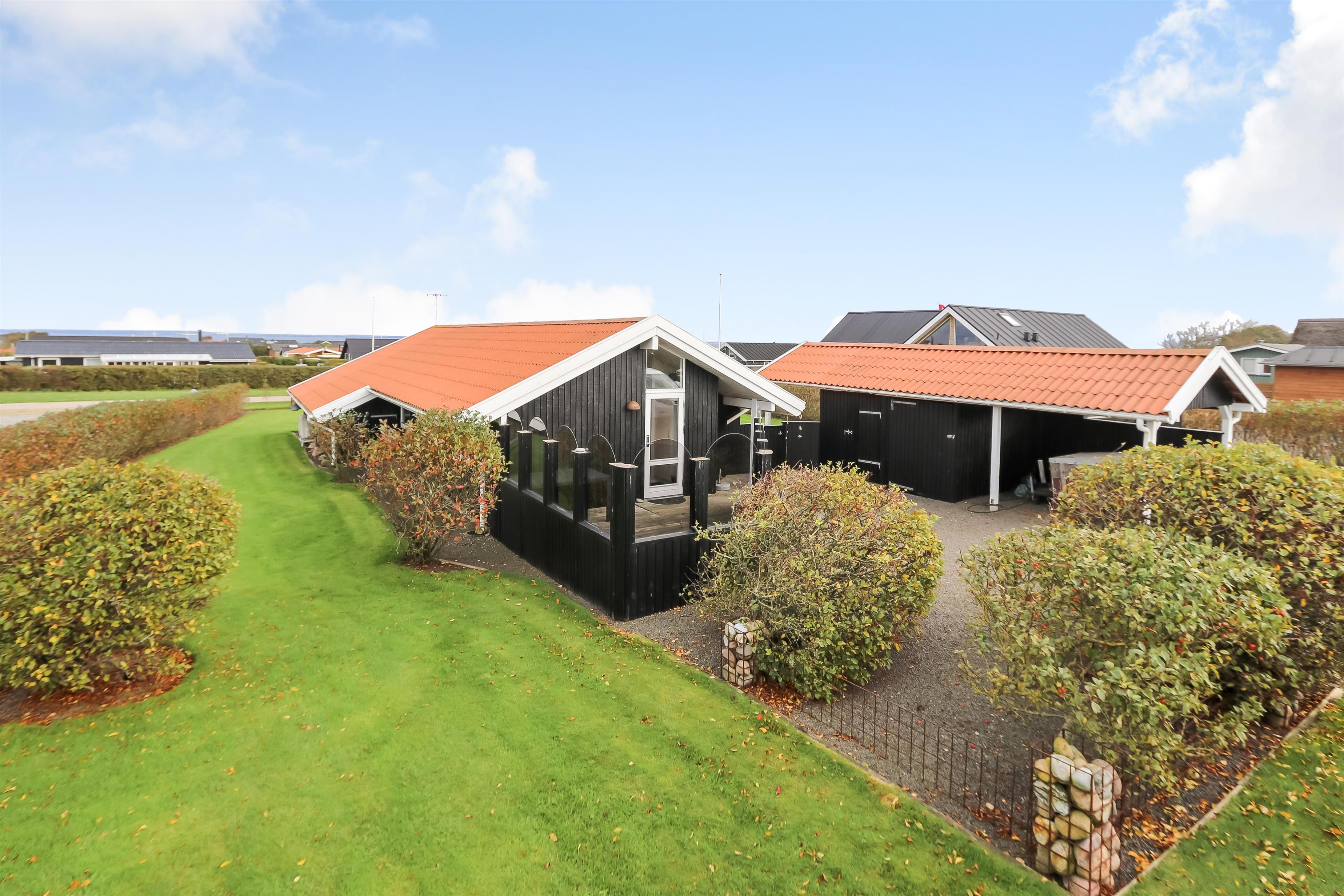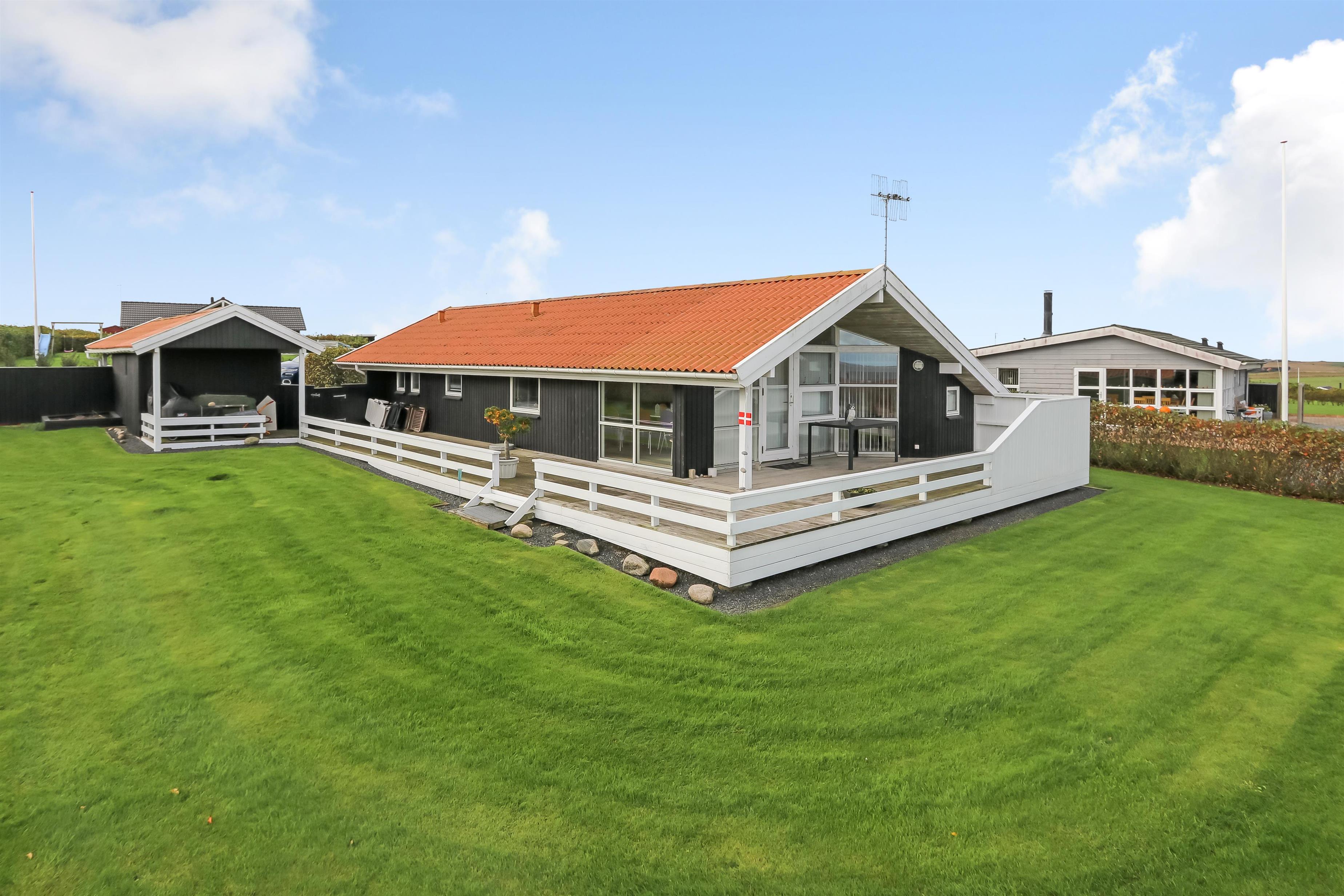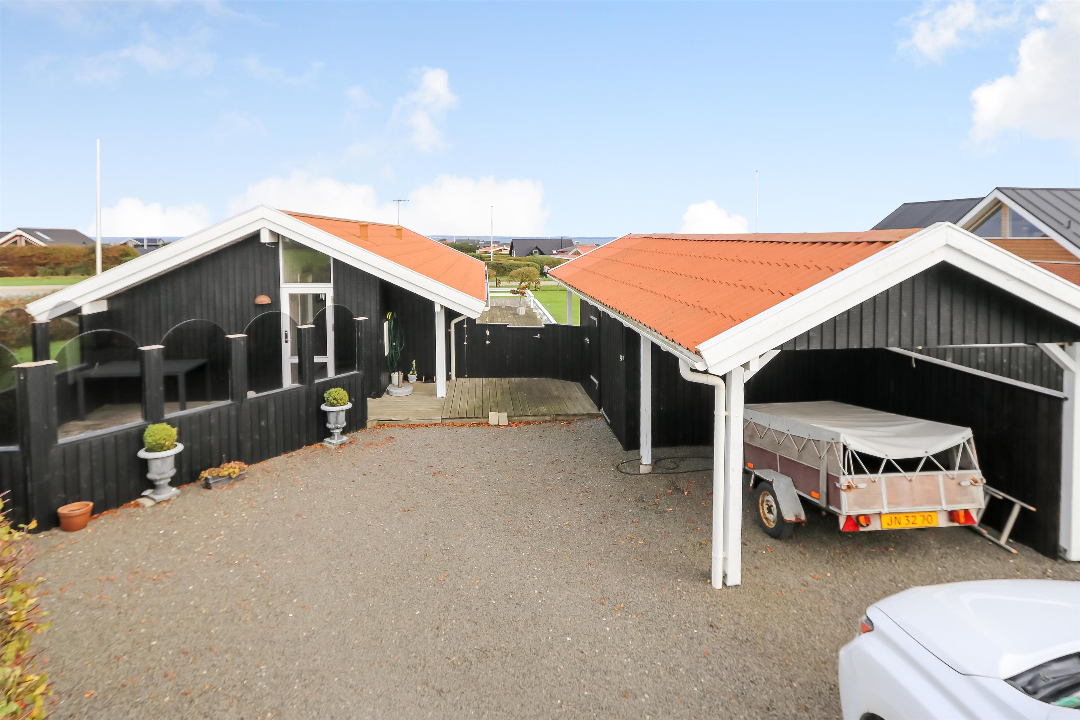 Huset har et helt fantastisk terrasseanlæg. Fra stuen er der udgang til en stor delvis overdækket terrasse som også løber langs med huset. Fra entreén er den udgang til en pragtfuld terrasse med læhegn. Der kan altid findes en plads i solen. Der er masser af havemøbler og liggestole samt grill kan flyttes rundt på terrasserne efter behag. Carport til bilen. Højt, ugeneret beliggende på en stikvej på en velholdt grund på ca. 1.063 m2 og kun 300 fra Limfjorden med en hyggelig lille badestrand. Fra huset findes der er dejligt stisystem, som på få minutter fører direkte ned til vandet. Ca. 200 m fra huset ligger den nye flotte naturlegeplads i træ med fodboldbane og rutsjebane og der er heller ikke langt til indkøb eller til stranden ved Gjellerodde. Der er kun fire km til Lemvig by, som er en livlig handelsby med mange butikker, fiskerestaurant, museum mm.