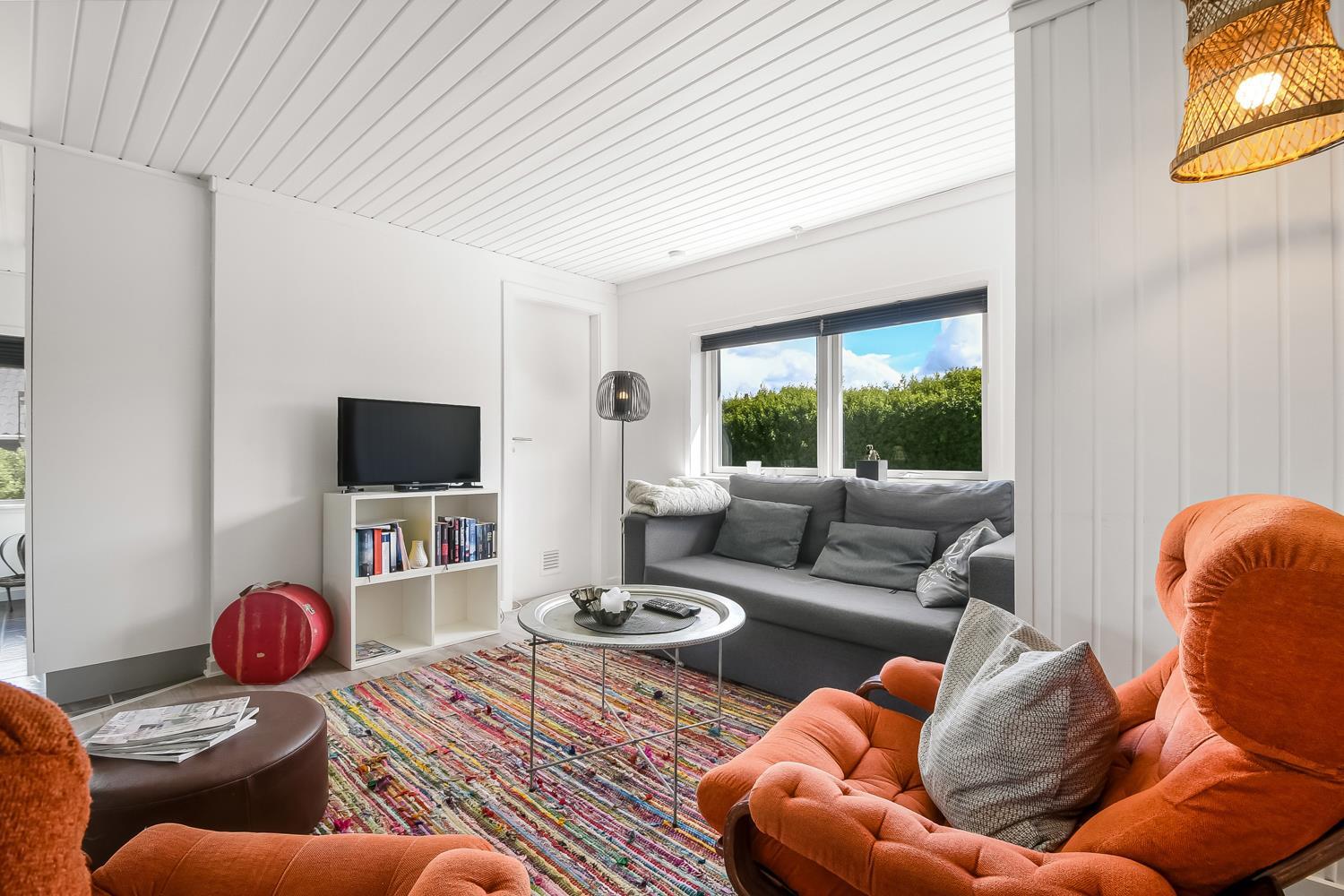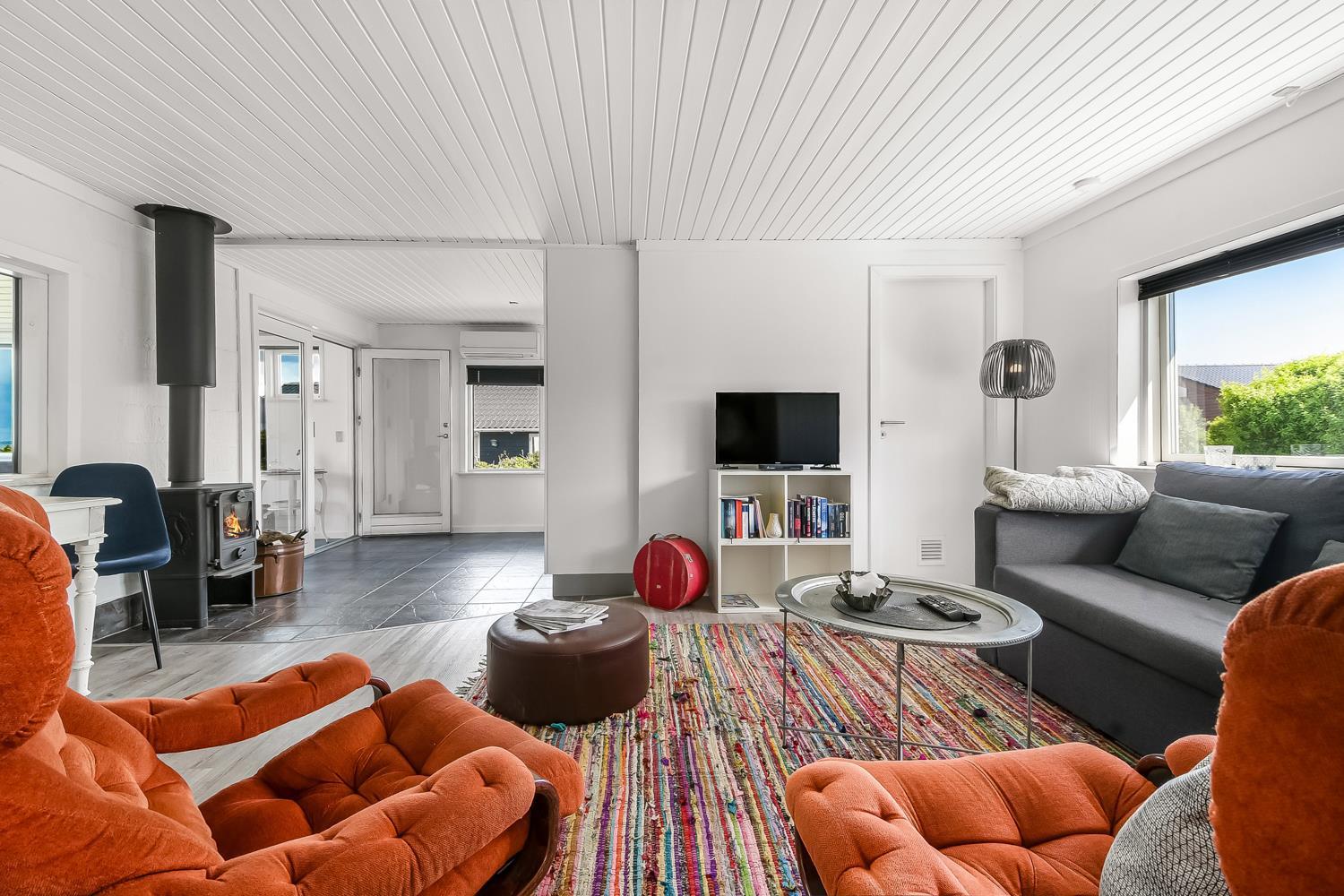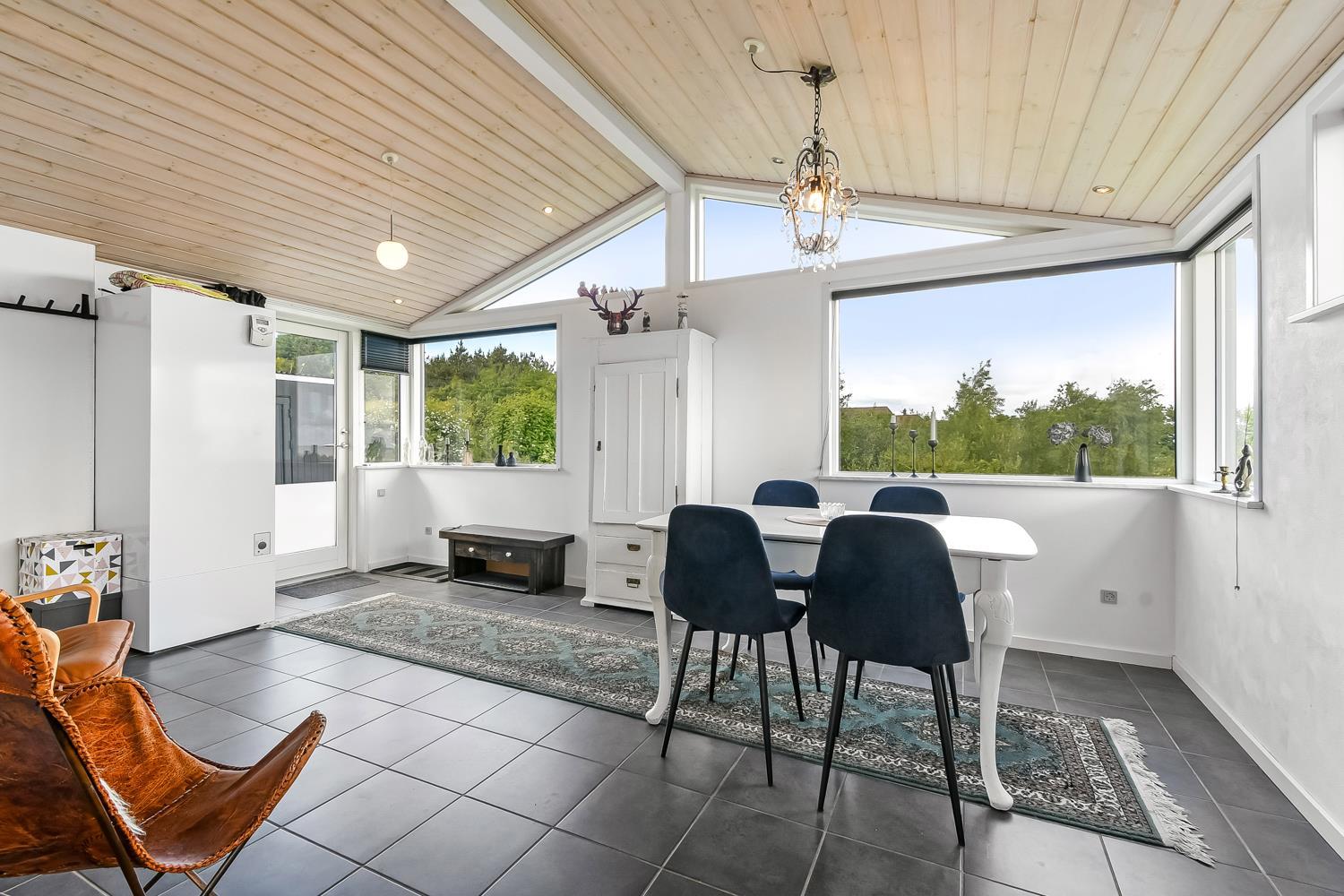 Velholdt feriehus på ca. 79 m2 og skønt indrettet med bl.a pæne møbler samt tv med tyske kanaler og mulighed for streaming. Huset rummer et kombineret opholdsstue og køkkenhjørne med keramiske kogeplader, indbygningsovn, emhætte, mikroovn, opvaskemaskine og køleskab. Der er 2 soveværelser med gulvtæppe -en 3/4 og to enkeltsenge. Fra opholdsstuen er der gennem de store fløjdøre adgang til en tilbygget spisestue med spiseplads, hvor en pragtfuld udsigt over landskabet med Limfjorden i baggrunden kan nydes. Herfra er der også adgang til husets badeværelse indeholdende toilet, håndvask, nedsænket bruser, vaskemaskine samt klinkegulv med gulvvarme. Rygning er ikke tilladt i huset. Max 1 lille hund tilladt. Et rigtig dejlig sommerhus som er utroligt hyggeligt og til at overskue.