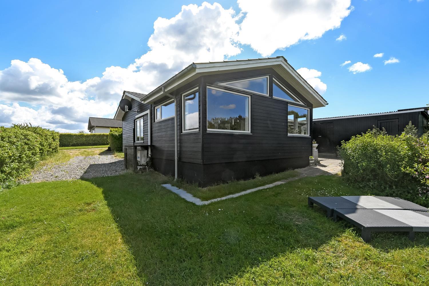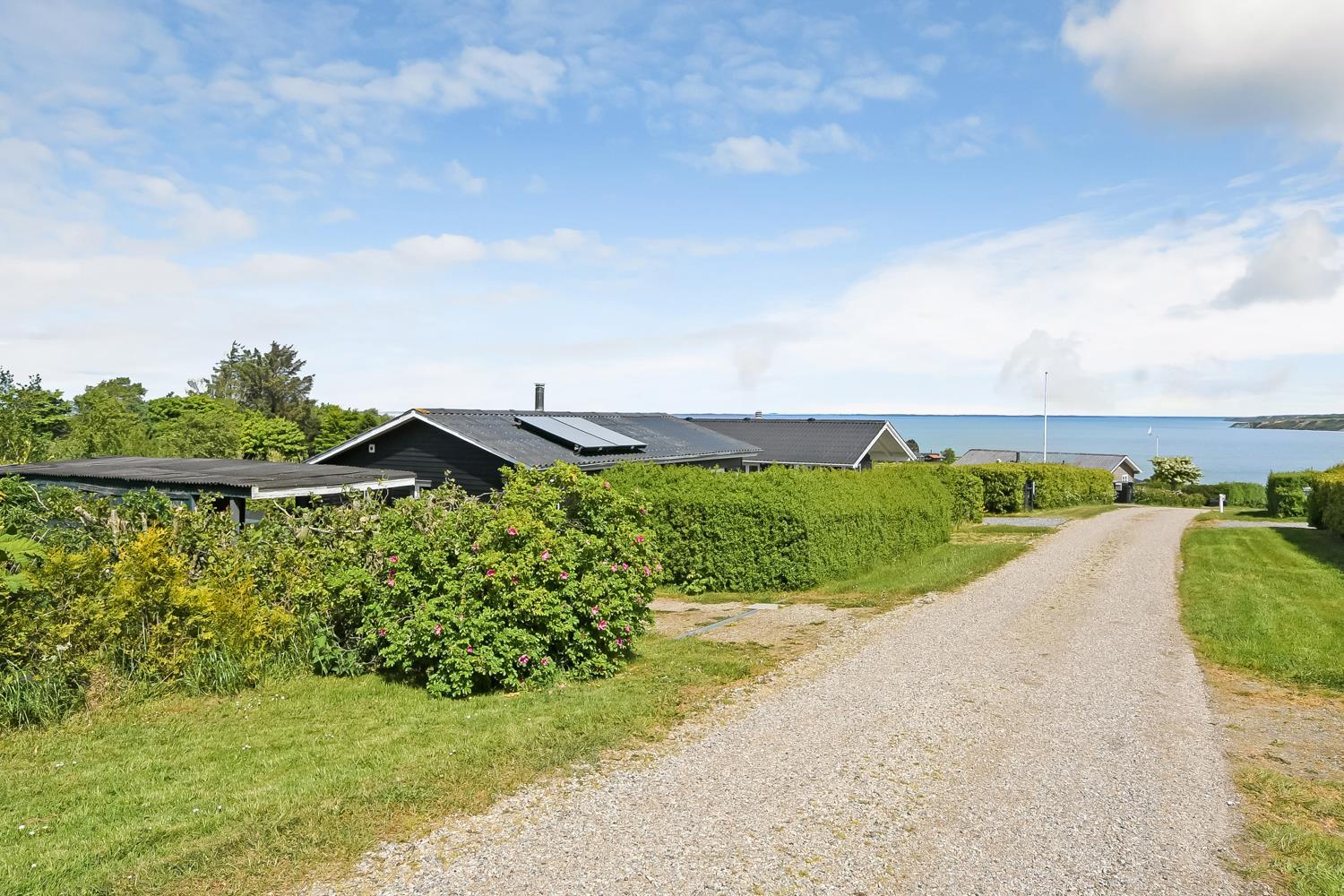 Huset er beliggende på en ca. 972 m2 stor, kuperet naturgrund. Fra spisestuen er der udgang til en terrasse med havemøbler og solvogne. Via en lille trappesti på den fra terrassen er der adgang til en udsigtsplatform, hvorfra man kan nyde den flotte panorama udsigt over landskabet og Limfjorden. Ved huset er det flere muligheder for parkering, bla. i husets carport. Fra huset findes der er et dejligt stisystem, som på få minutter fører direkte ned til vandet samt badebro. Her er der mulighed for at dyrke forskellige vandaktiviteter såsom paddelboard og kajak. Ca. 300 m fra huset ligger den nye flotte naturlegeplads i træ med fodboldbane og rutsjebane og der er heller ikke langt til golfbane, indkøb eller til stranden.
