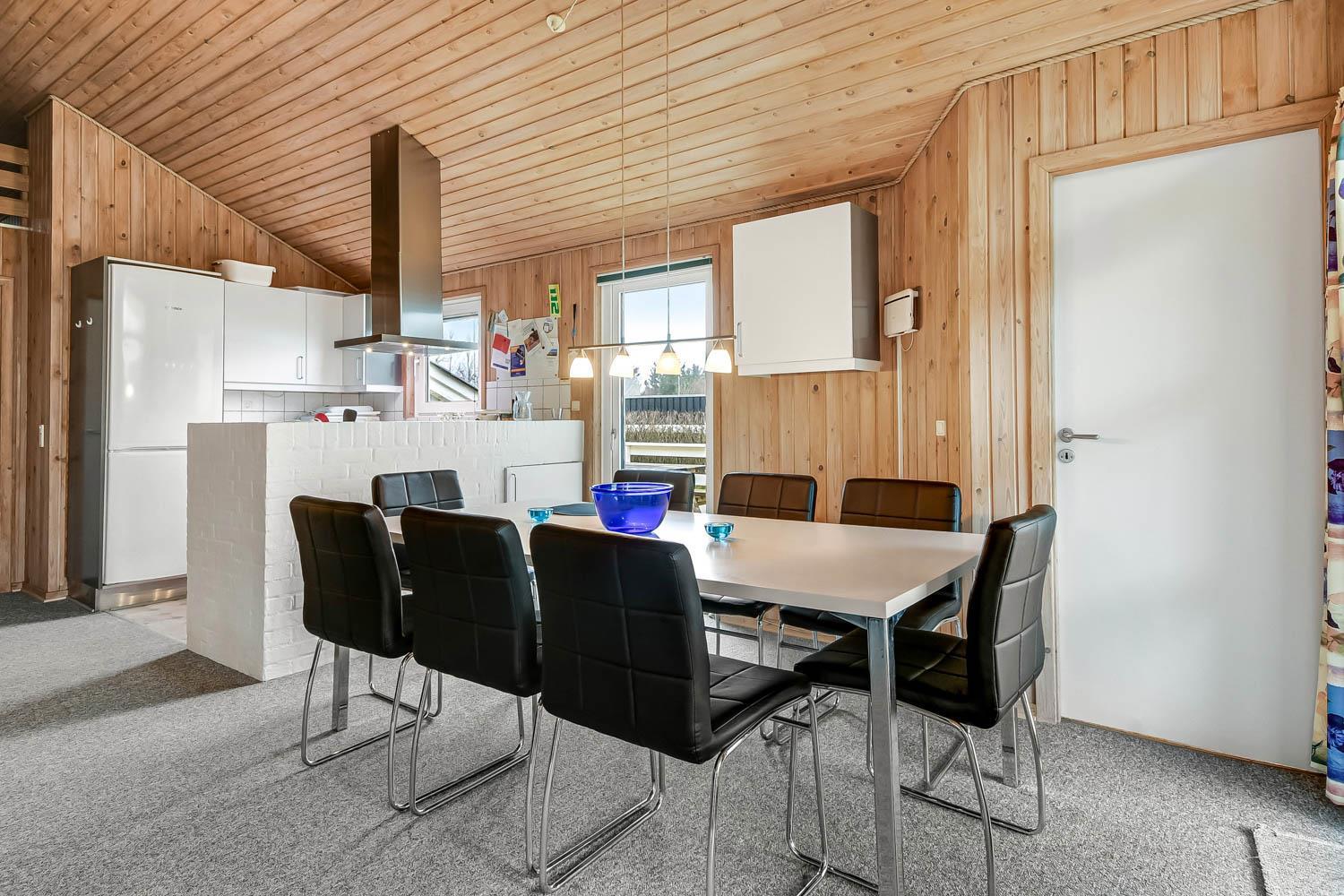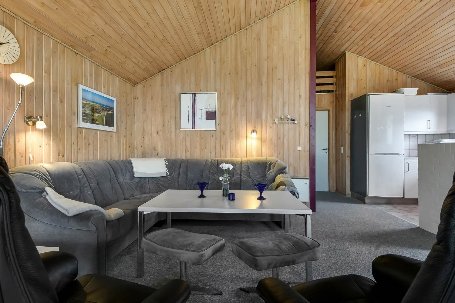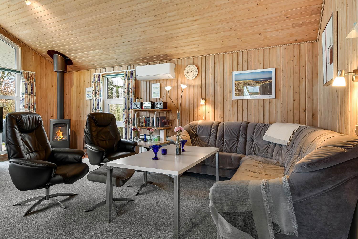 Huset har en dejlig stor lys rummelig stue som er kombineret med køkkenet. Køkkenet har glaskeramisk komfur, køleskab med frostboks, mikrobølgeovn og opvaskemaskine. Der er ligeledes en separat fryser på 85 liter i huset. I stuen er der brændeovn, varmepumpe, CD-afspiller, DVD-afspiller og fjernsyn med DR1, TV2 og parabol med tyske kanaler. Hertil er der i stuen også et spisebord hvor alle husets beboere kan nyde maden. Der hører også en barnestol og barneseng med i huset. Der er 3 soveværelser i huset 1 med dobbeltseng , 2 med hver 2 enkeltsenge og hertil er der 2 liggemuligheder oppe på hemsen. Her skal man dog kravle op af en stige for at kunne benytte denne. Der er to badeværelser og det store badeværelse har både sauna og boblebad i tillæg til bruser, håndvask og toilet. Her befinder også husets tørretumbler og vaskemaskine. Det andet badeværelse har toilet, bruser og håndvask.