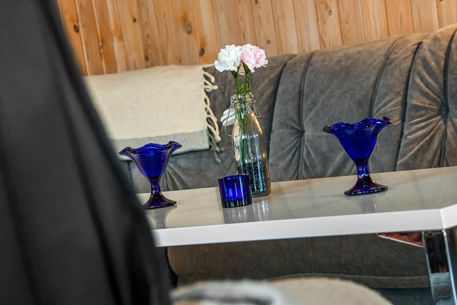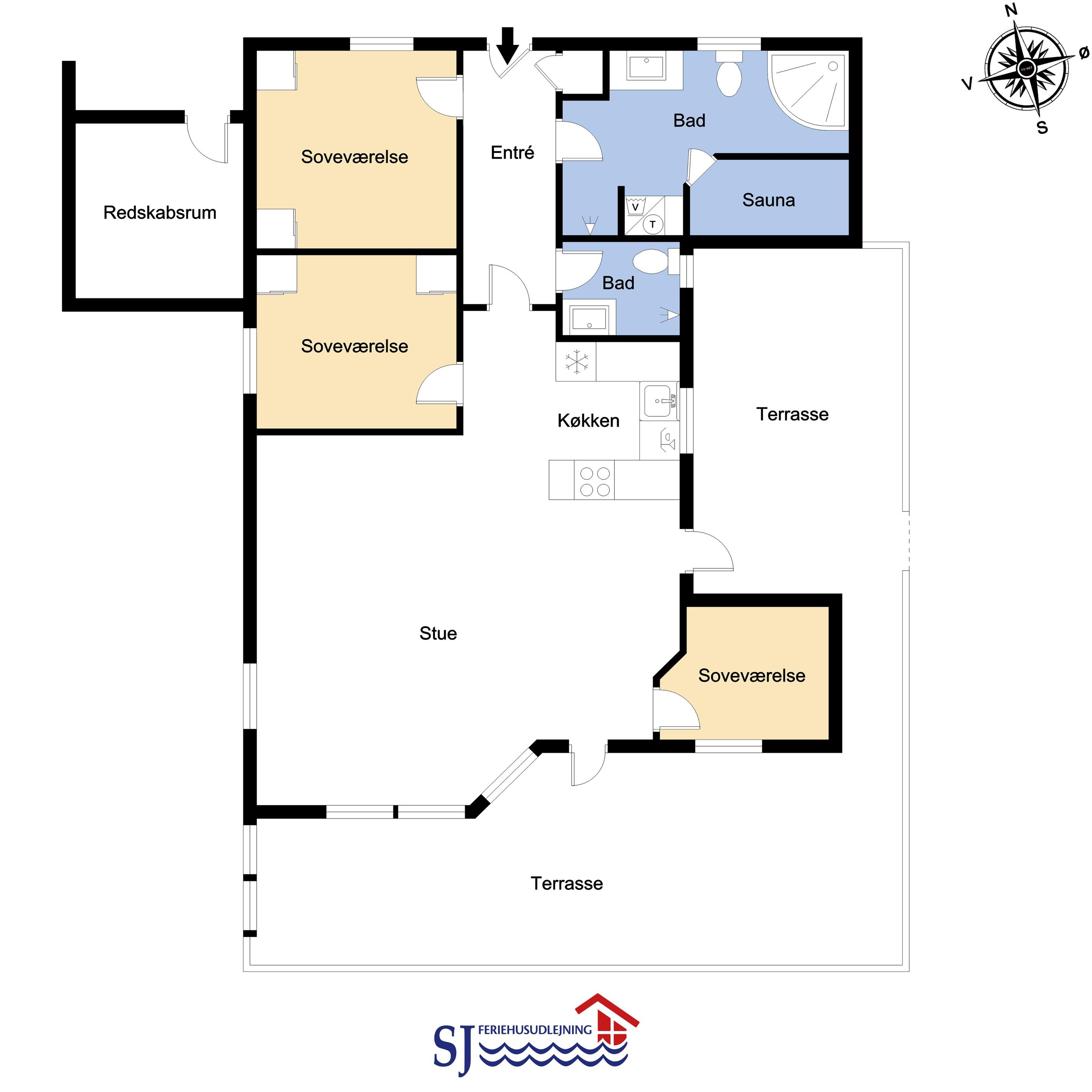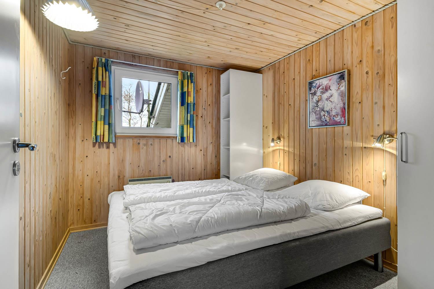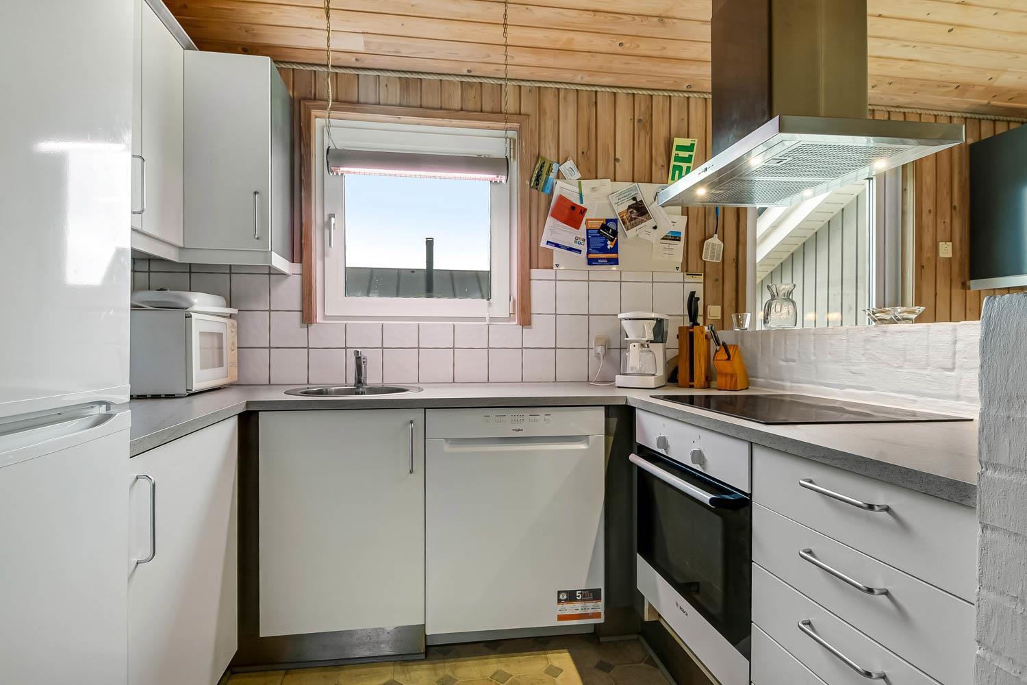Huset har en dejlig stor lys rummelig stue som er kombineret med køkkenet. Køkkenet har glaskeramisk komfur, køleskab med frostboks, mikrobølgeovn og opvaskemaskine. Der er ligeledes en separat fryser på 85 liter i huset. I stuen er der brændeovn, varmepumpe, CD-afspiller, DVD-afspiller og fjernsyn med DR1, TV2 og parabol med tyske kanaler. Hertil er der i stuen også et spisebord hvor alle husets beboere kan nyde maden. Der hører også en barnestol og barneseng med i huset. Der er 3 soveværelser i huset 1 med dobbeltseng , 2 med hver 2 enkeltsenge og hertil er der 2 liggemuligheder oppe på hemsen. Her skal man dog kravle op af en stige for at kunne benytte denne. Der er to badeværelser og det store badeværelse har både sauna og boblebad i tillæg til bruser, håndvask og toilet. Her befinder også husets tørretumbler og vaskemaskine. Det andet badeværelse har toilet, bruser og håndvask.