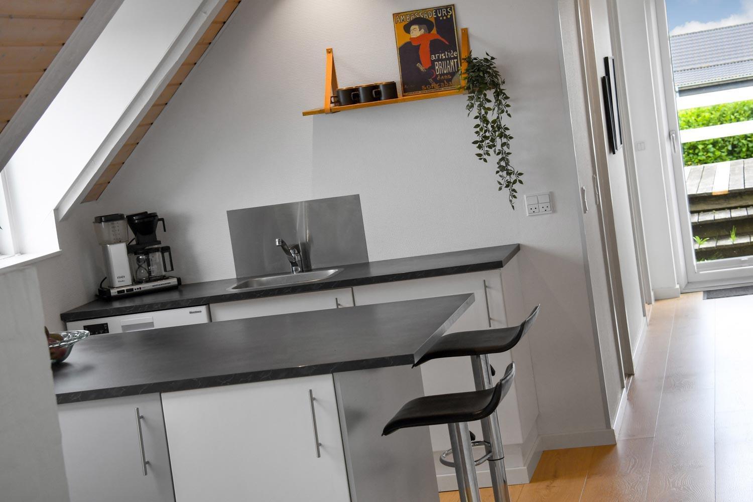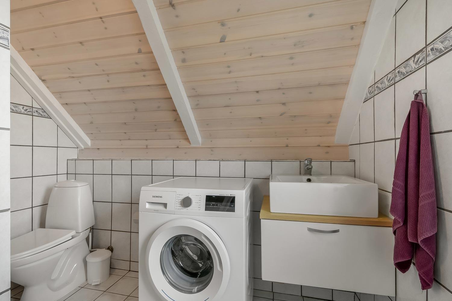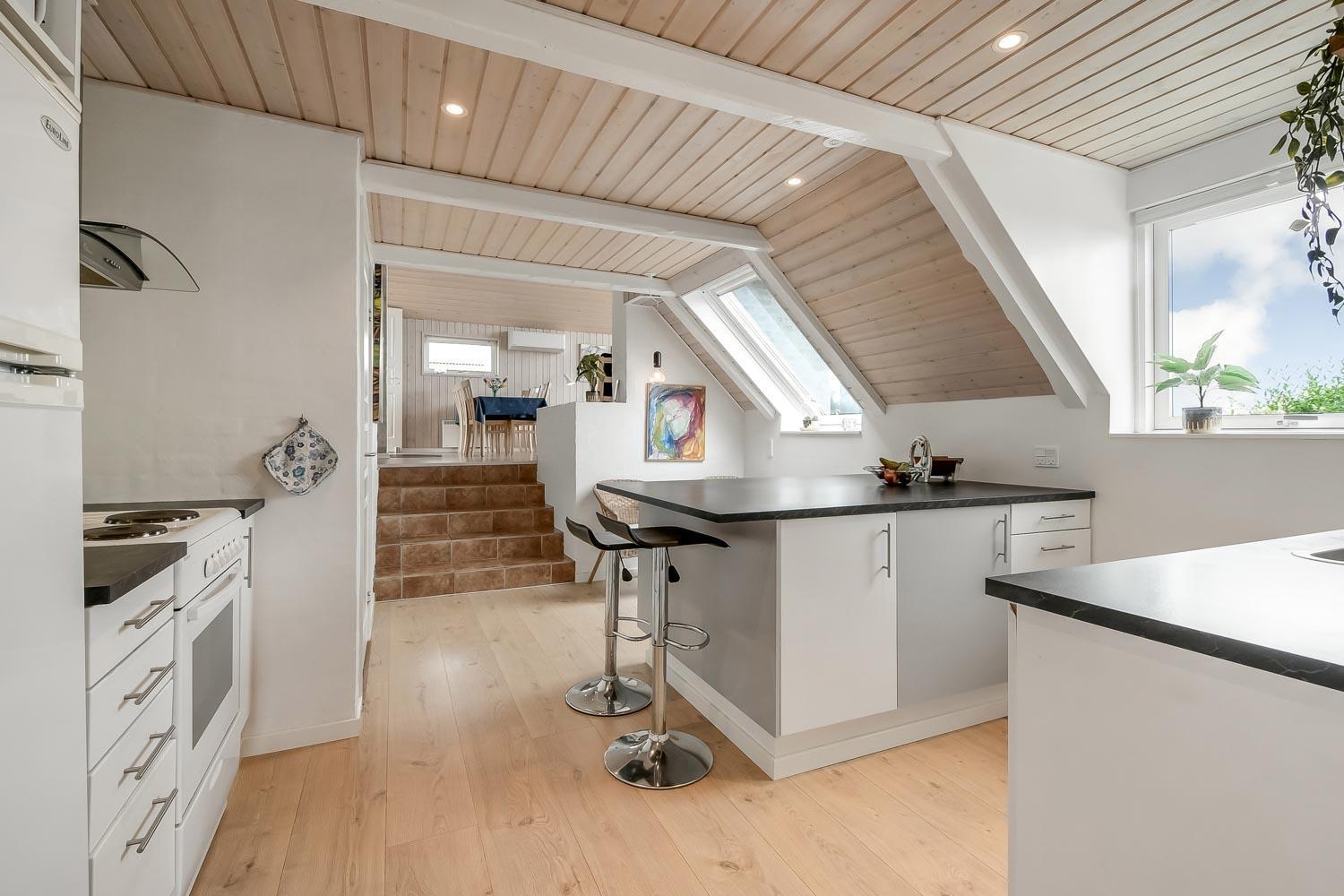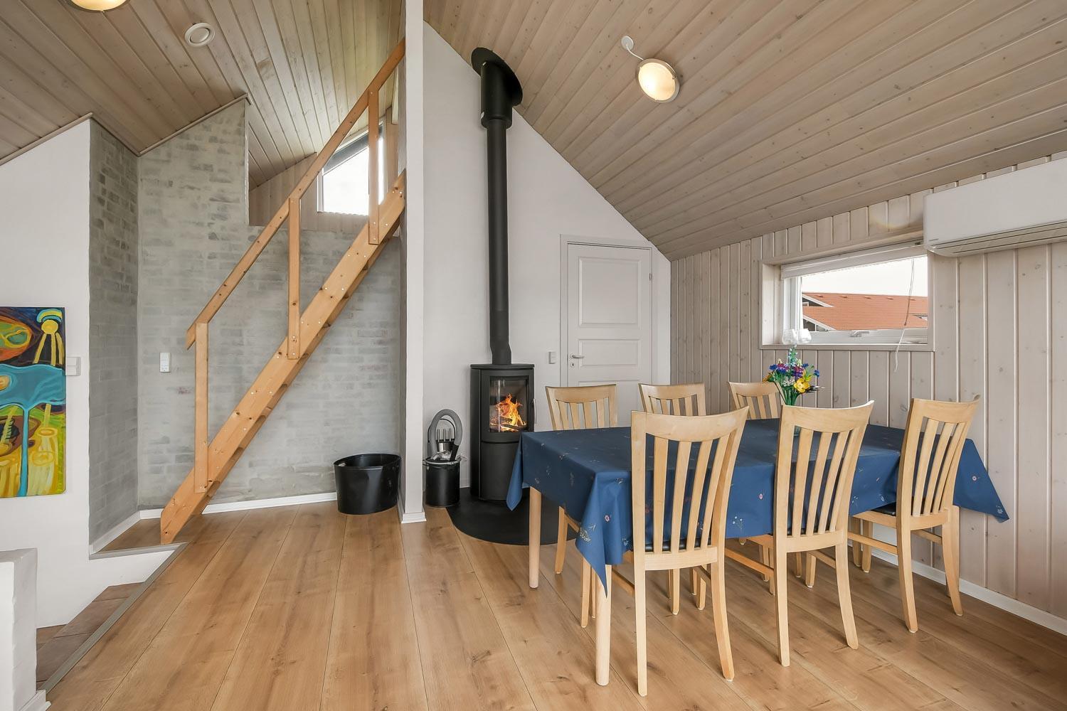 Træferiehus på ca. 90 m2. En entre byder jer velkommen til. Opholdsstuen er hyggeligt indrettet med nye møbler og smart-TV med DR-tvkanaler og tyske programmer samt Chromecast som giver mulighed for streaming af TV / radio / Apps, så har du en mobiltelefon eller et andet device med kan du streame hvad du nu har abonnement, bluetooth højtaler og spisebord. Slap af foran den knitrende brændeovn som sammen med varmepumpen hjælper med at reducere udgiften til varmeregningen. Fra stuen er der via trappe afgang til en dejlig hems som er indrette med flere muligheder for leg til begejstring for mange børn og barnlige sjæle. Via en trappe går man ned en nyere tilbygning hvor huset køkken er placeret. 3 soveværelser (1DS, 1DS, 2ES). Køkkenet har elektrisk komfur, emhætte, opvaskemaskine, mikroovn, køleskab med lille fryseboks. 2 Badeværelser med toilet, håndvask, bruser og klinkegulv. Det ene badeværelse har også gulvvarme. Der er praktiske hårde gulve i hele huset. Rygning er ikke tilladt i huset. Max 1 husdyr tilladt. Det er den oplagte feriebolig med flot udsigt.
