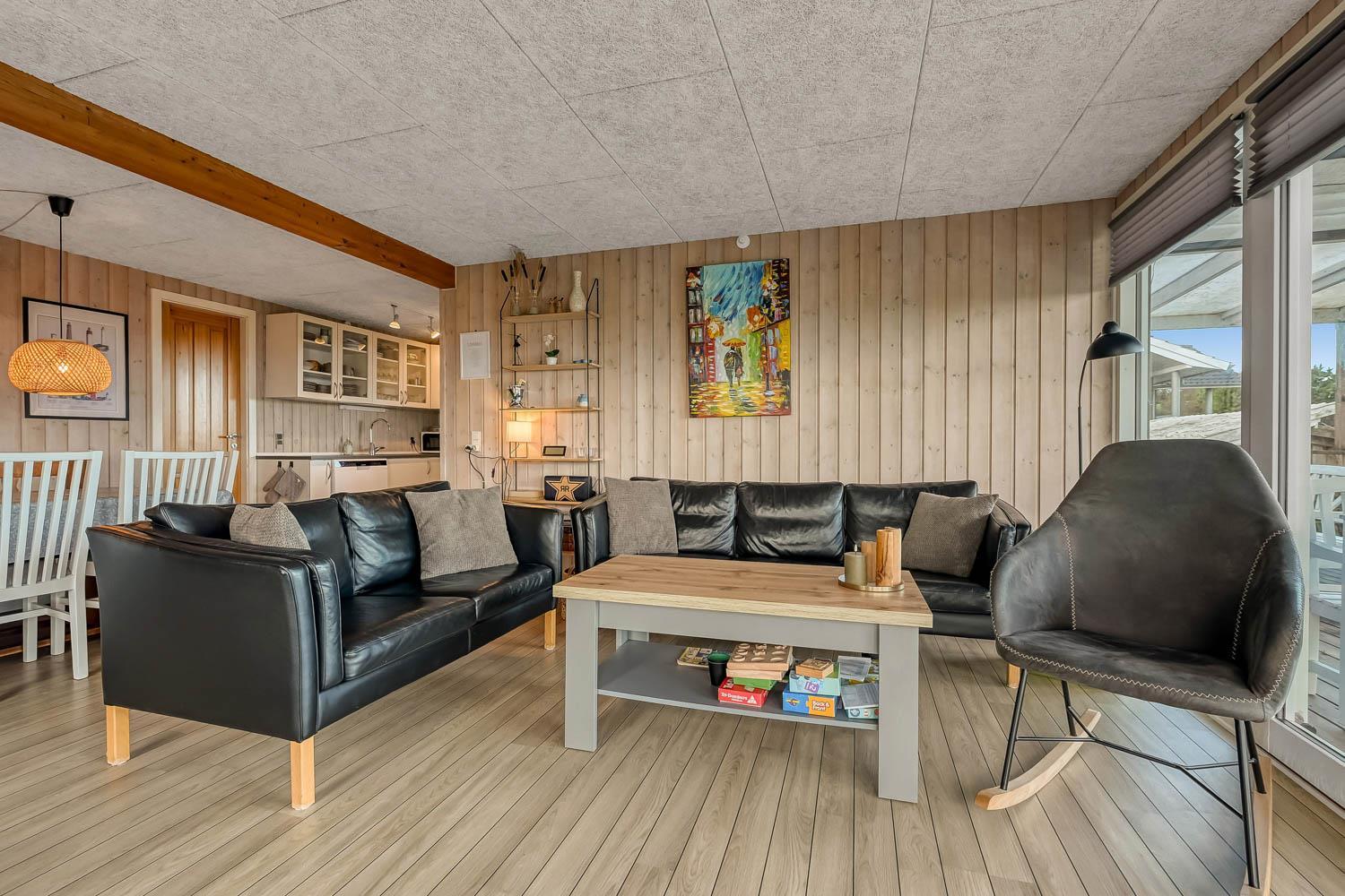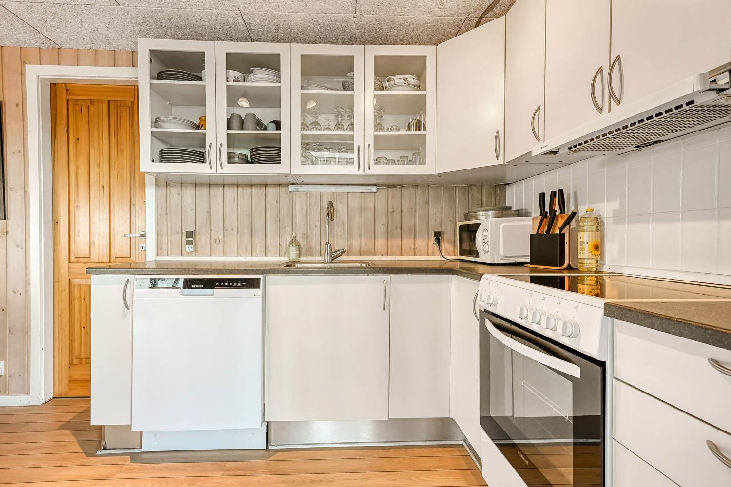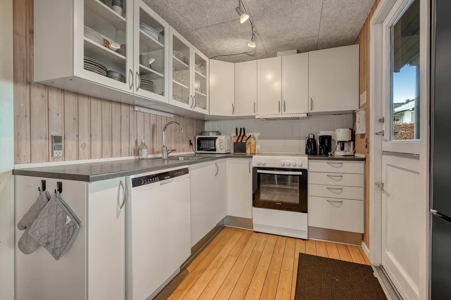 Køkkenhjørnet er veludstyret med alt i service og køkkengrej samt komfur med glaskeramiske kogeplader, emhætte, mikrobølgeovn, opvaskemaskine, køleskab og fryser. I opholdsstuen findes komfortable lædermøbler, spisebord, radio, TV med danske og tyske programmer, Chromecast og mulighed for streaming af egne abonnementer.