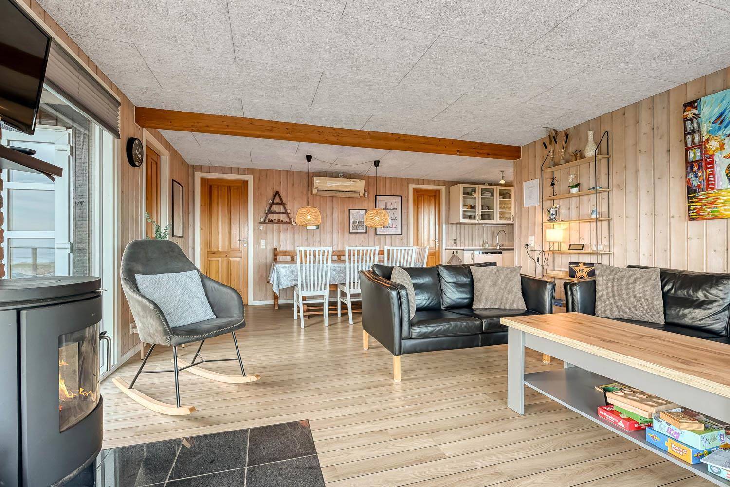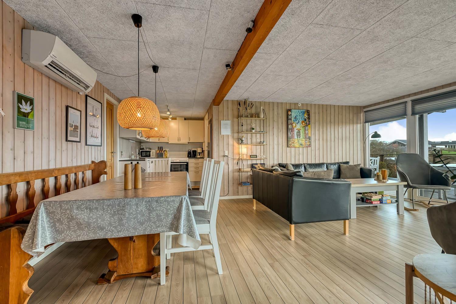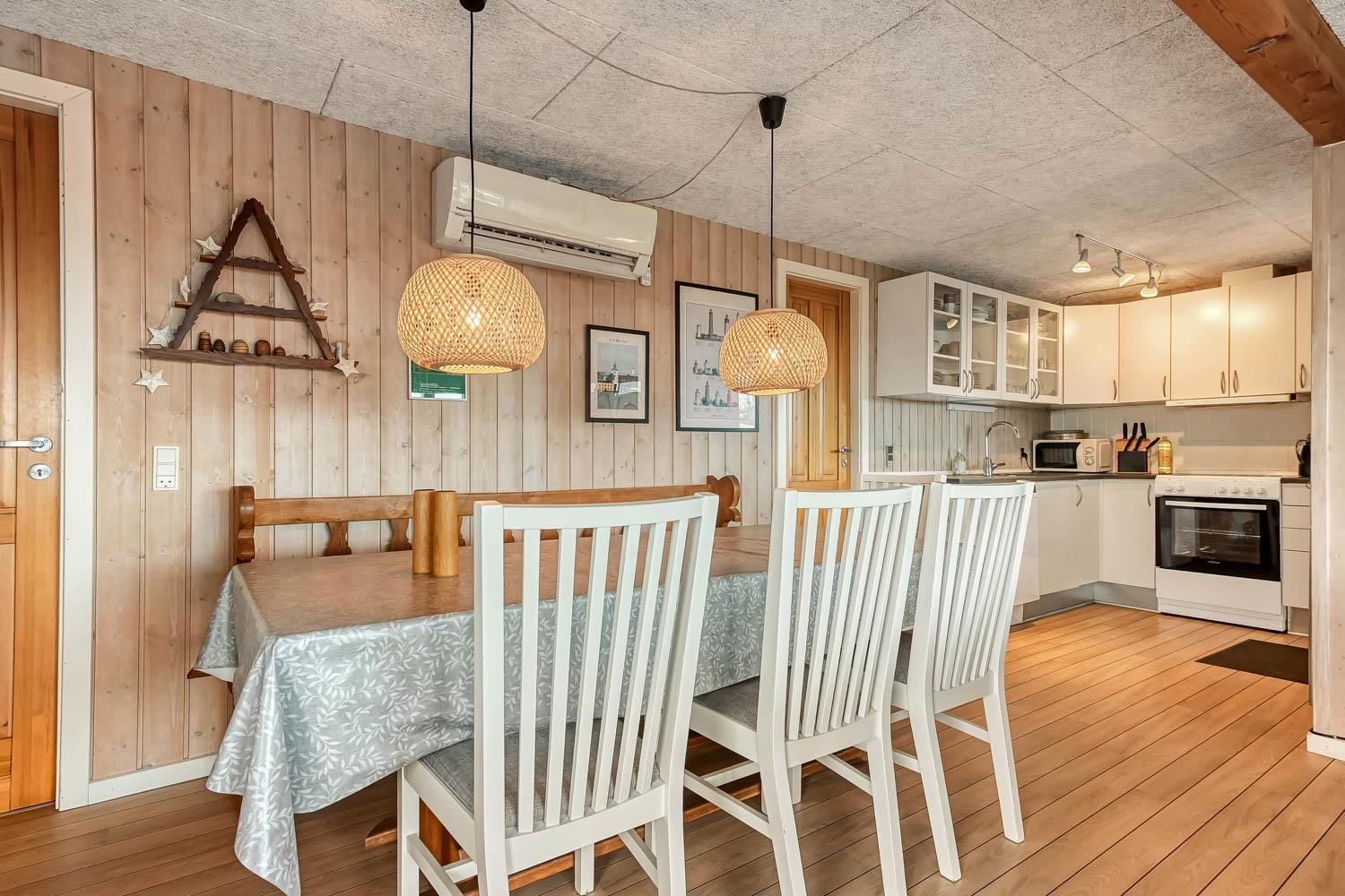 Køkkenhjørnet er veludstyret med alt i service og køkkengrej samt komfur med glaskeramiske kogeplader, emhætte, mikrobølgeovn, opvaskemaskine, køleskab og fryser. I opholdsstuen findes komfortable lædermøbler, spisebord, radio, TV med danske og tyske programmer, Chromecast og mulighed for streaming af egne abonnementer.