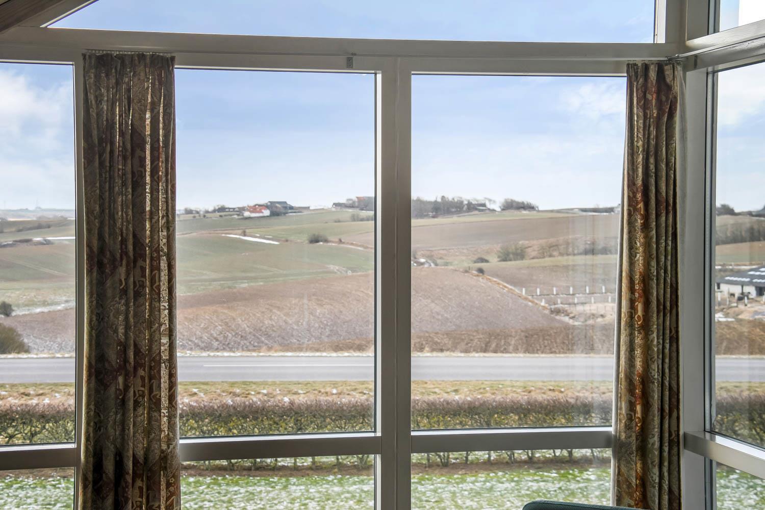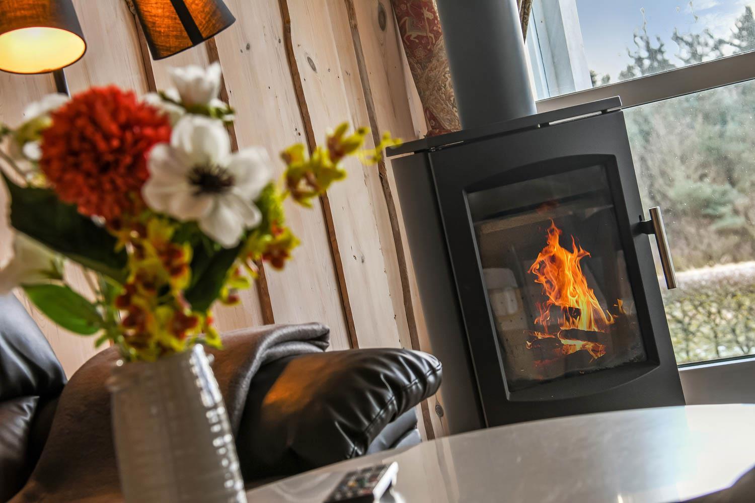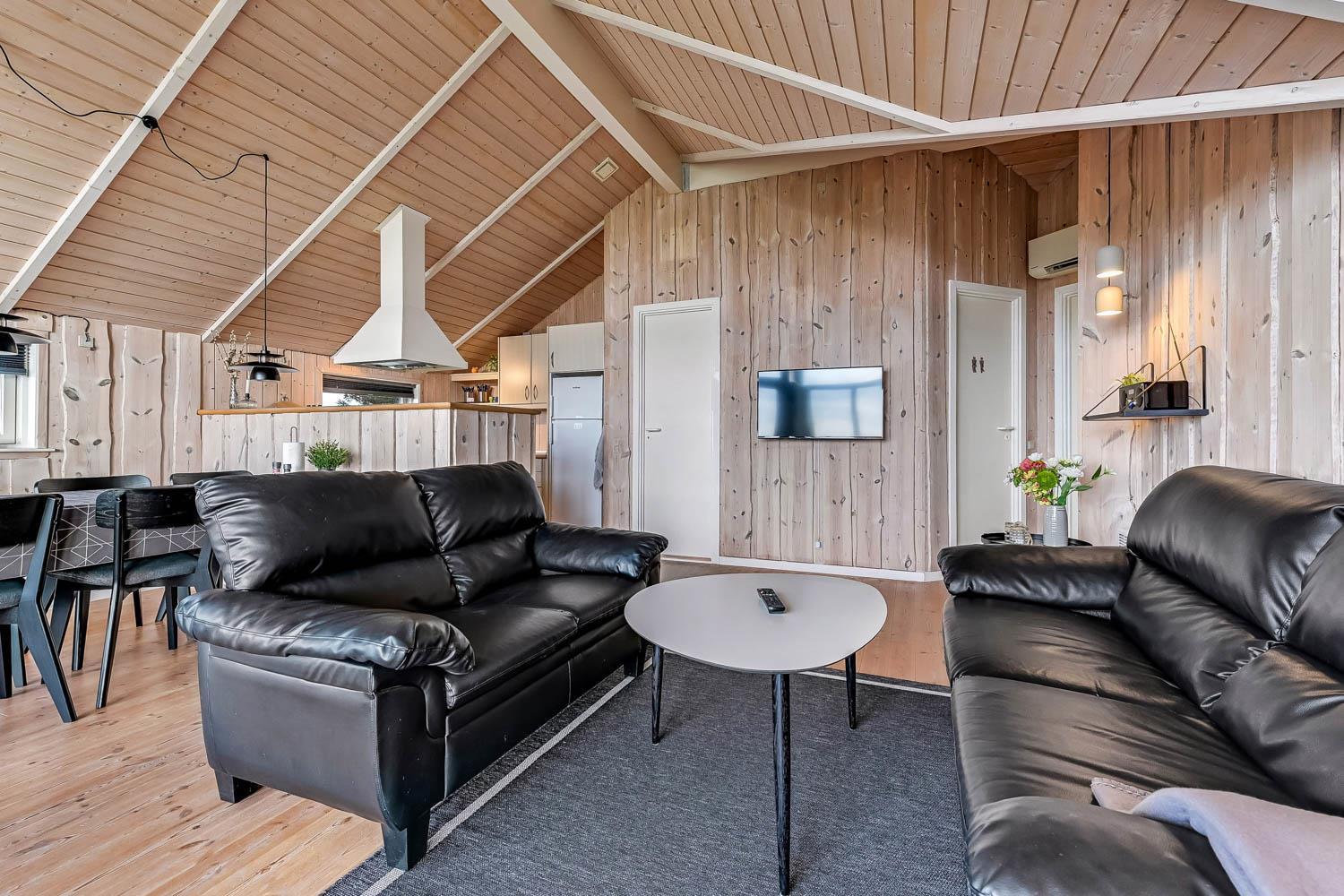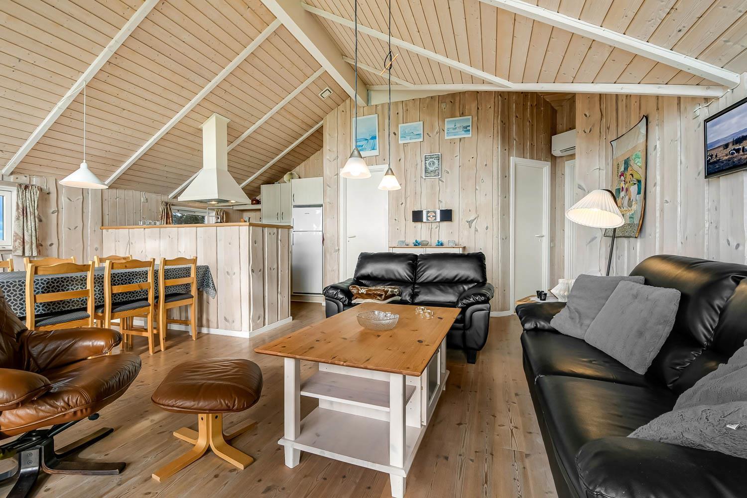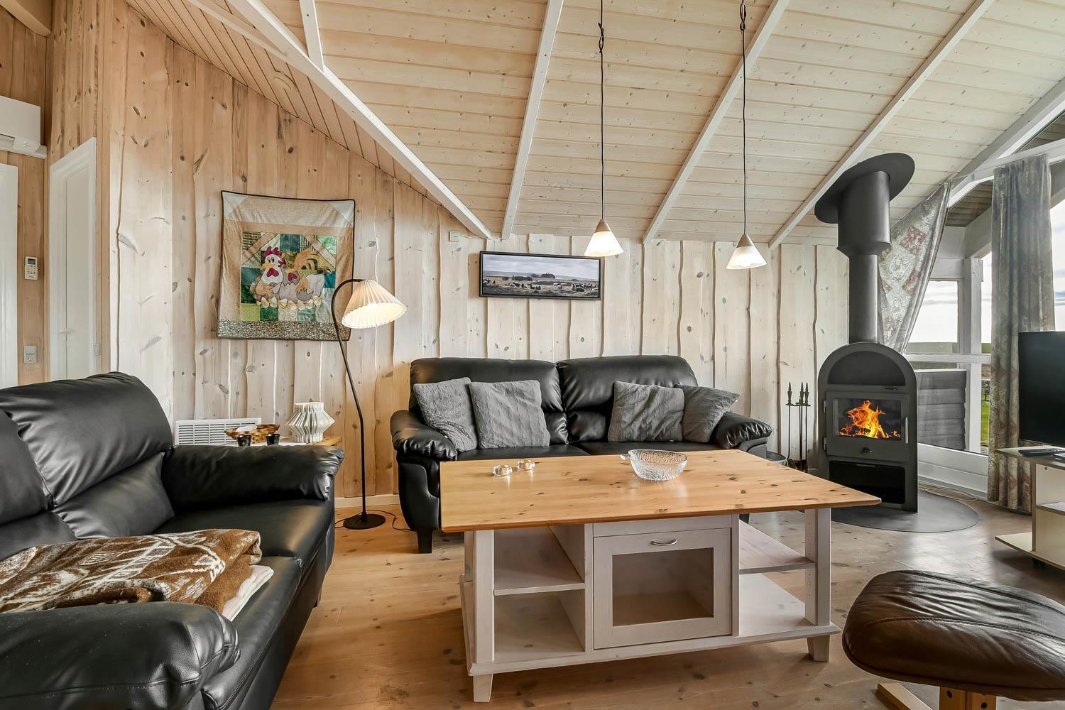 Indretningen er lys og indbydende med store vinduer, der fremhæver den imponerende udsigt. Loft til kip, moderne møbler, vægge og lofter i ludbehandlet træ samt trægulve overalt skaber en varm og hyggelig atmosfære. Køkkenafdeling med glaskeramisk komfur, køle-/fryseskab, opvaskemaskine og miniovn.