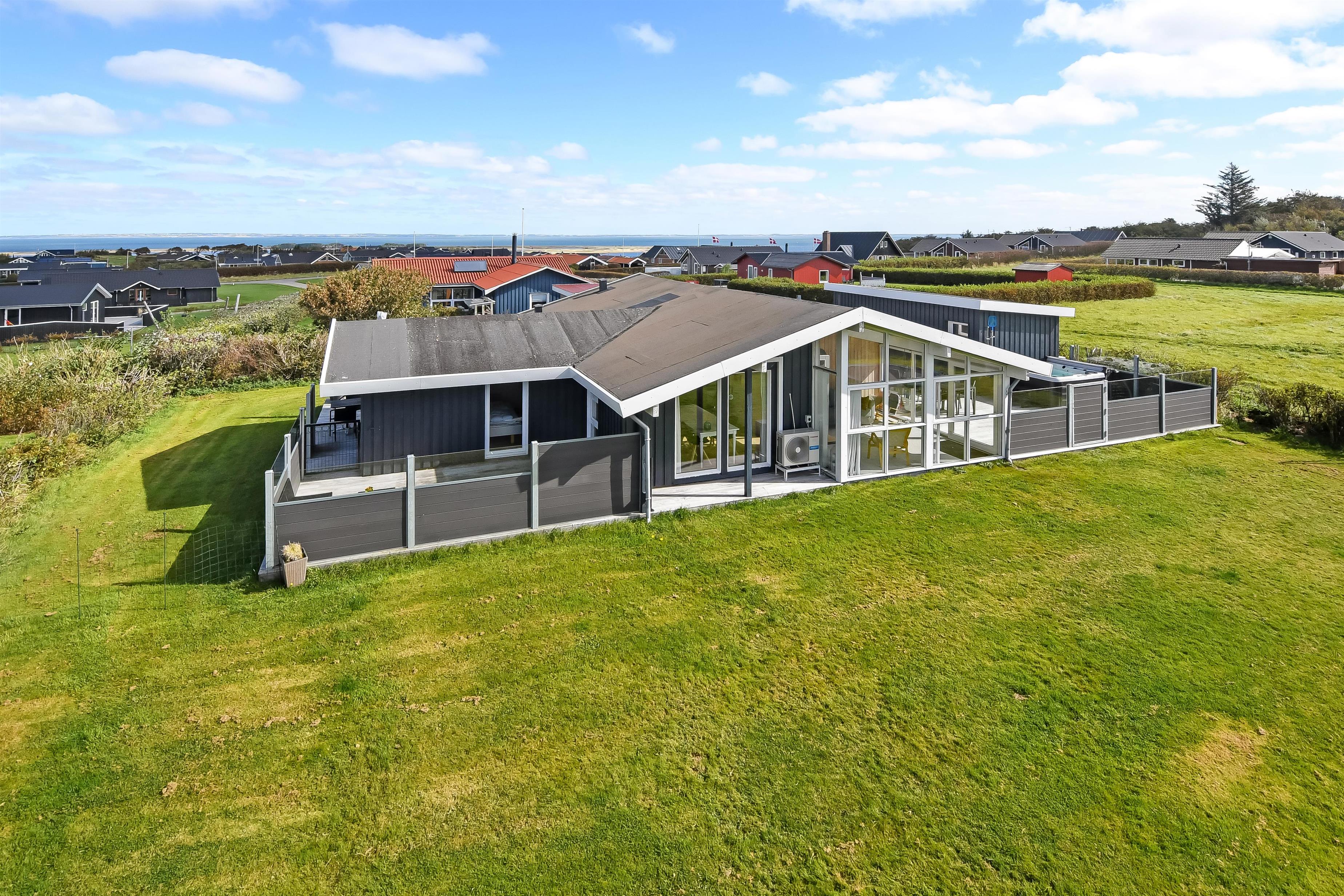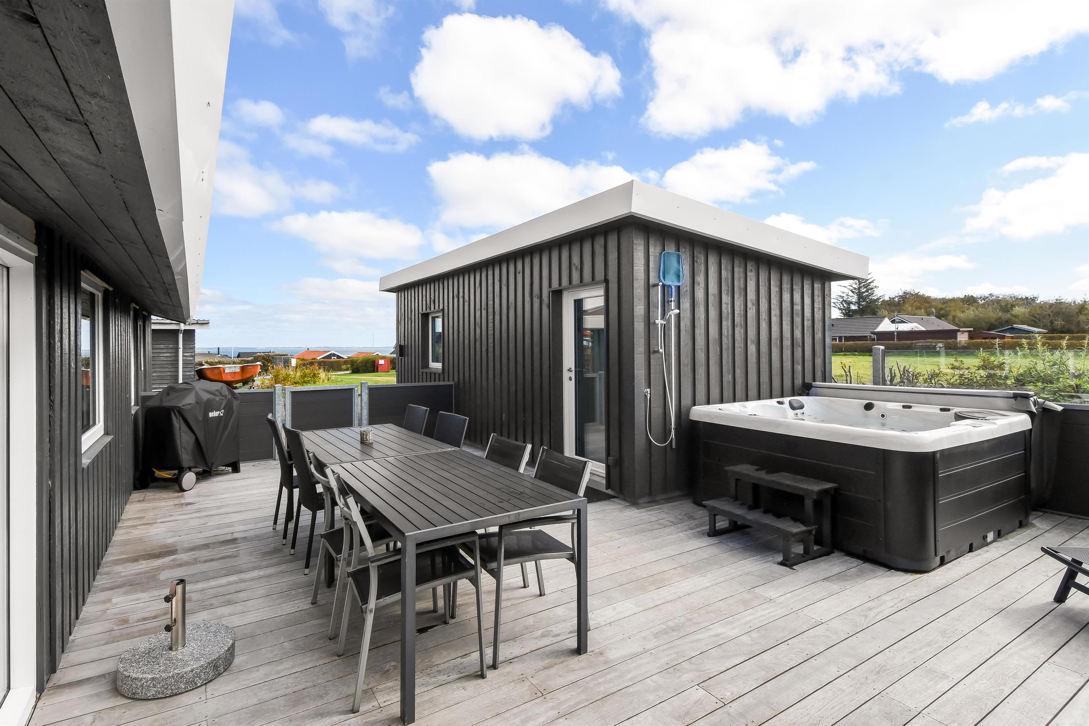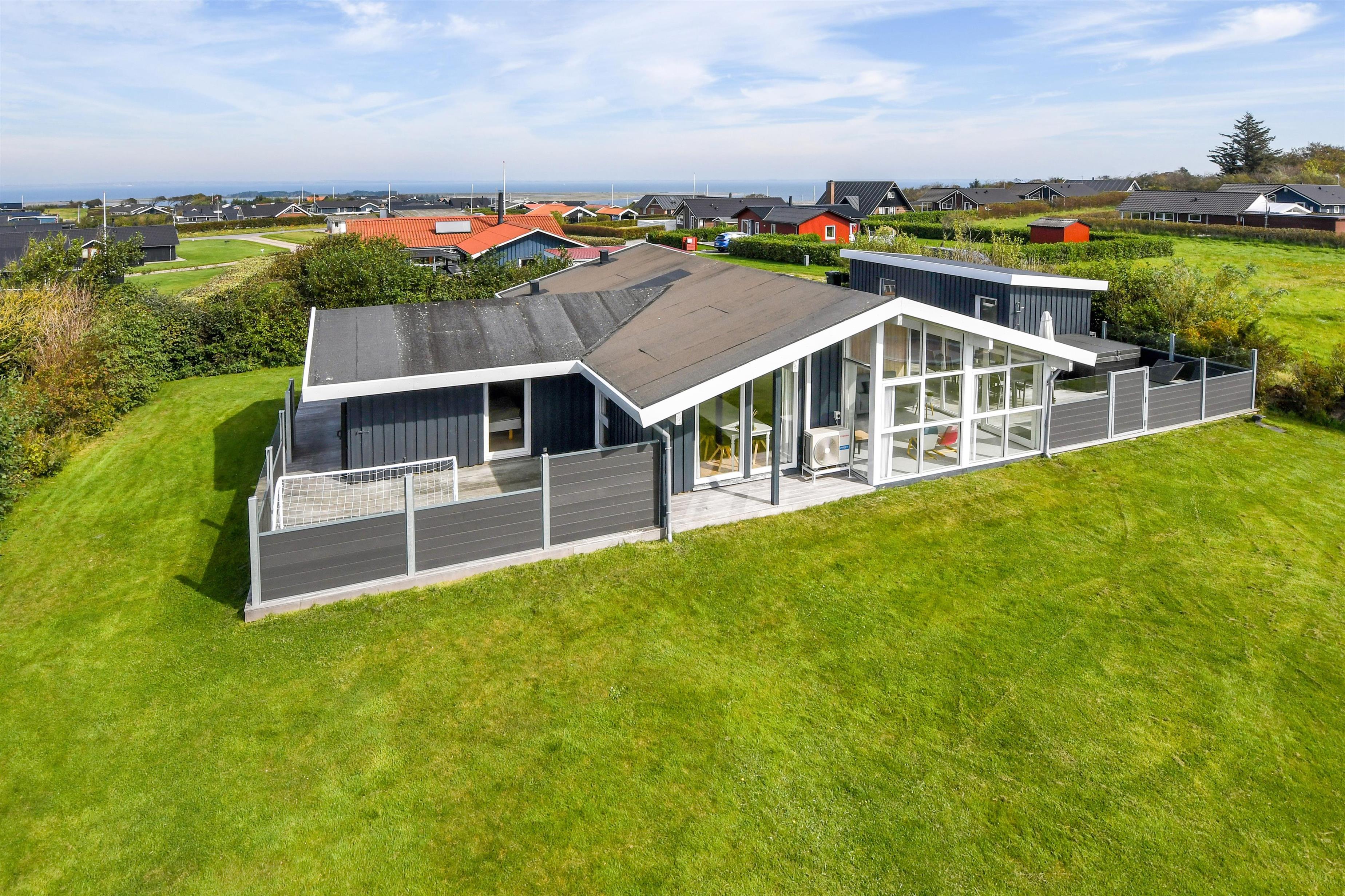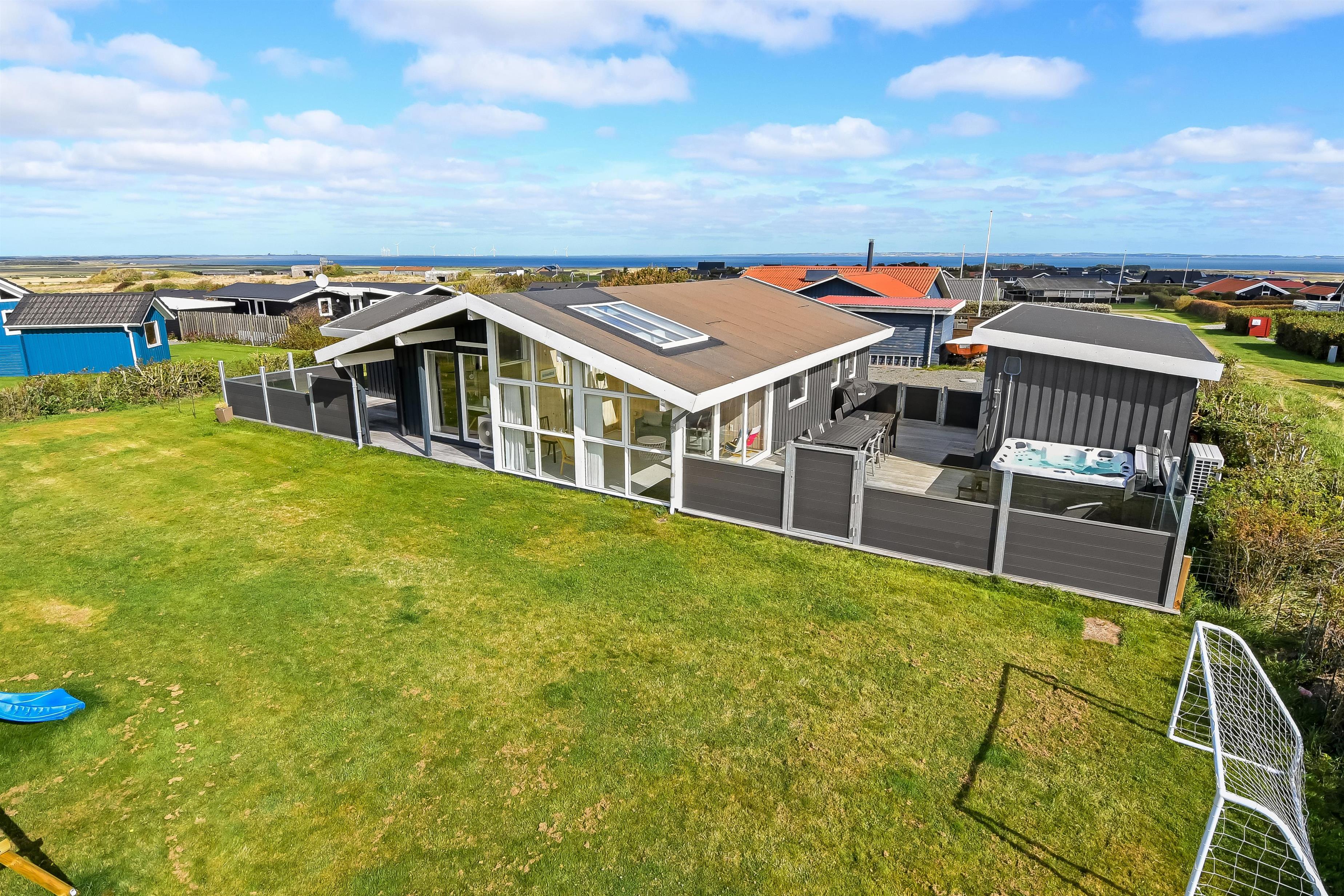 Huset ligger på en ca. 865 m² stor indhegnet grund, højt og ugeneret beliggende på en rolig stikvej. Velholdt indehegnet grund med trampolin, gynge og kun 700 meter fra stranden. Fantastisk, delvist overdækket og indhegnet terrasseanlæg med havemøbler, grill og liggestole. Her er også et skønt udendørs spabad, hvor man i al slags vejr kan sidde og nyde udsigten og om aftenen den stjerneklare himmel. Her kan der altid findes en plads i solen samt pragtfuldt kig til Limfjorden. Havemøbler, solvogn og grill kan flyttes rundt på terrassen efter behag. Også på bagsiden af huset er der en dejlig terrasse med havemøbler og udsigt over landskabet. Fra huset findes der stisystemer, som på få minutter fører direkte ned til fjord, badestrand og badebroer. Nær ved huset ligger også den nye flotte naturlegeplads, som er lavet i naturmaterialer og hvor der bl.a. er rutsjebaner, gynger og meget andet. Her findes også iskiosk og restaurant, som har åbent i sæsonen. Der er i øvrigt kun ca. fire km til Lemvig by, som er en livlig handelsby med mange butikker, fiskerestaurant, biograf, skaterbane, museum mm.
