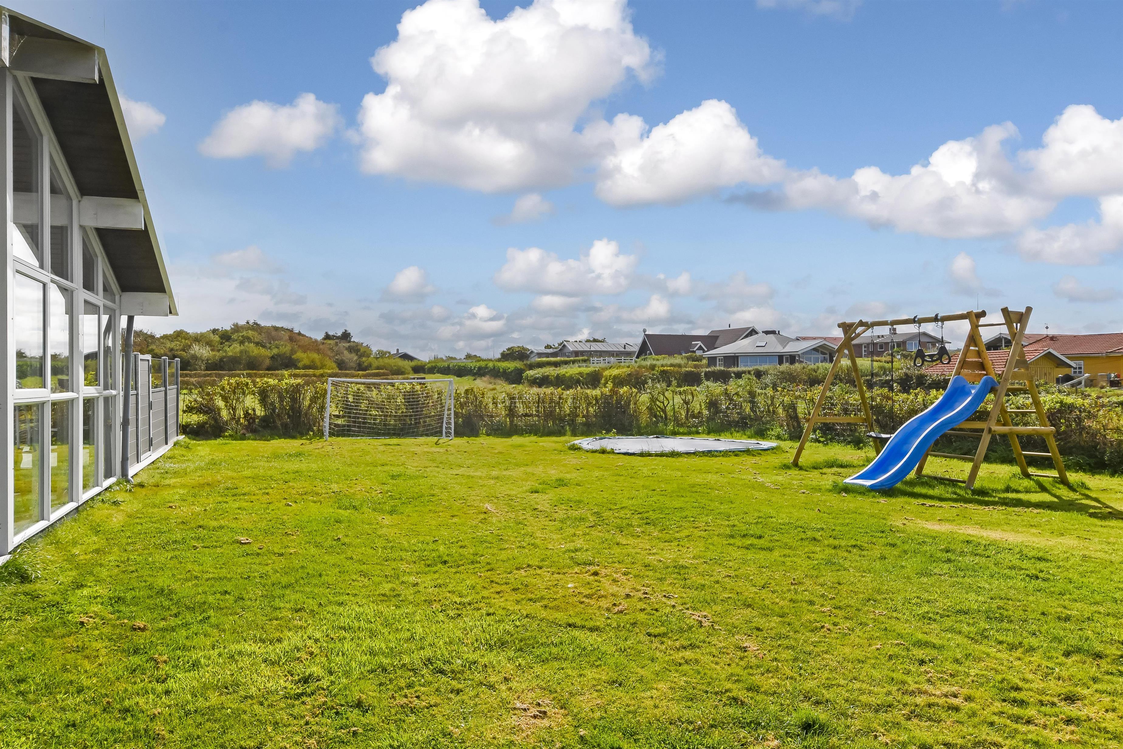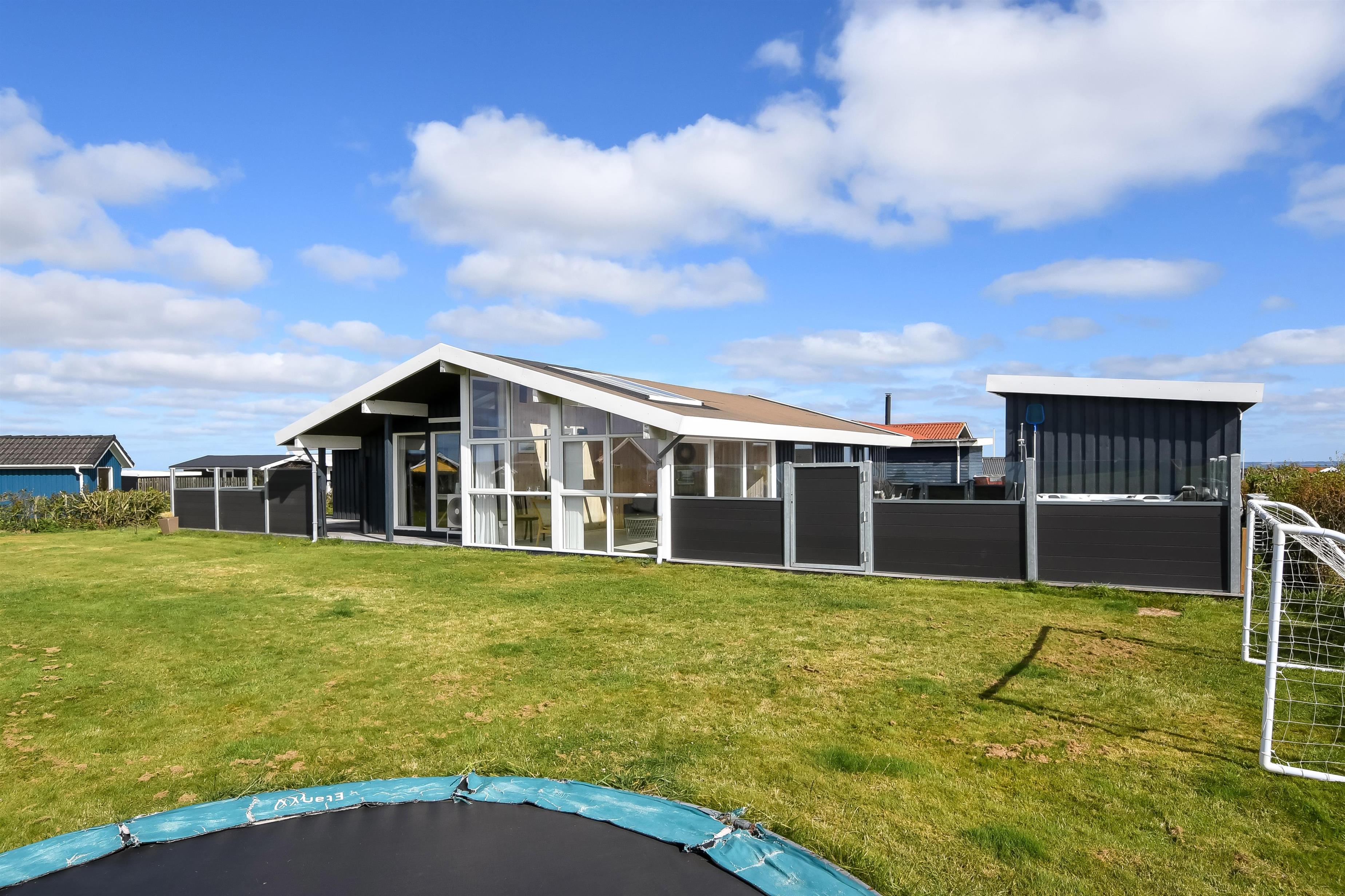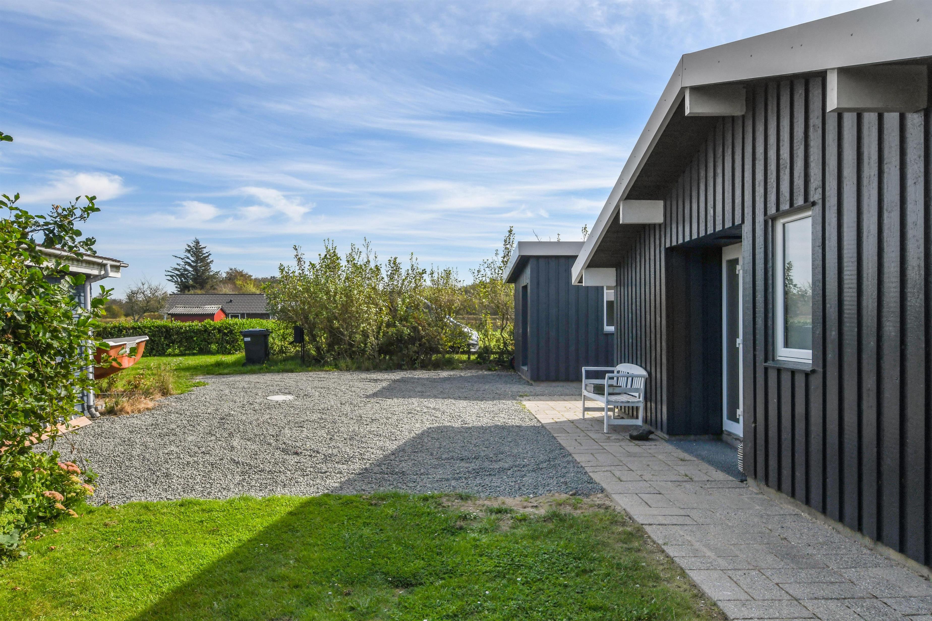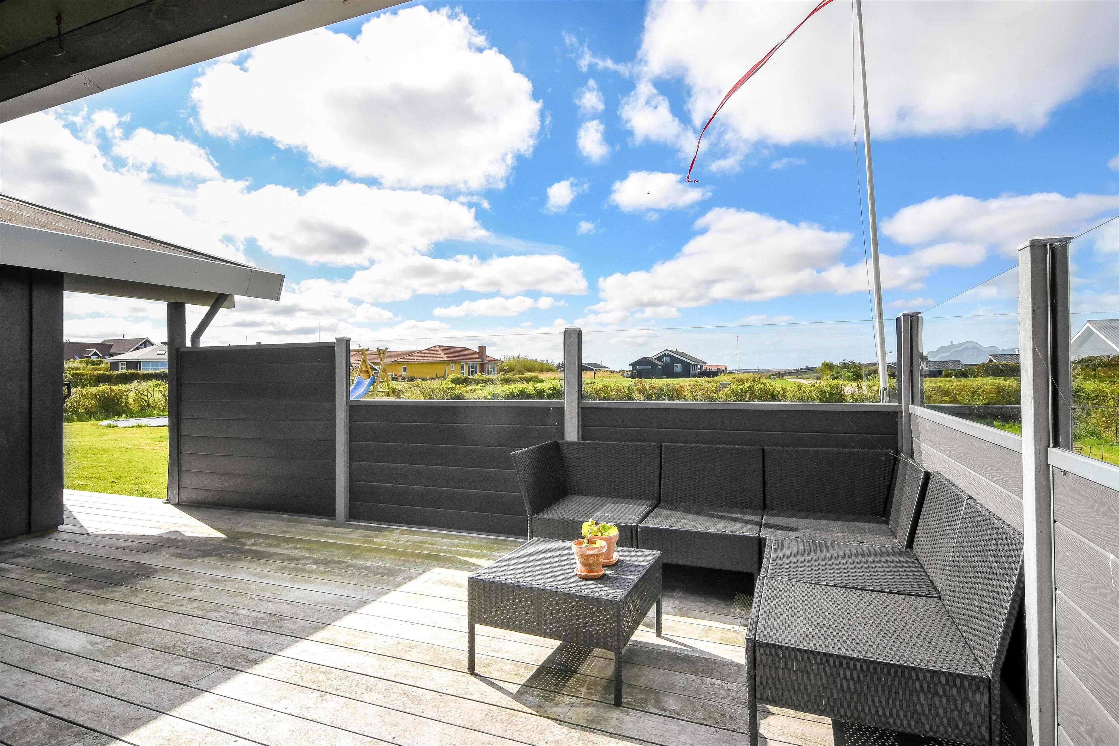Huset ligger på en ca. 865 m² stor indhegnet grund, højt og ugeneret beliggende på en rolig stikvej. Velholdt indehegnet grund med trampolin, gynge og kun 700 meter fra stranden. Fantastisk, delvist overdækket og indhegnet terrasseanlæg med havemøbler, grill og liggestole. Her er også et skønt udendørs spabad, hvor man i al slags vejr kan sidde og nyde udsigten og om aftenen den stjerneklare himmel. Her kan der altid findes en plads i solen samt pragtfuldt kig til Limfjorden. Havemøbler, solvogn og grill kan flyttes rundt på terrassen efter behag. Også på bagsiden af huset er der en dejlig terrasse med havemøbler og udsigt over landskabet. Fra huset findes der stisystemer, som på få minutter fører direkte ned til fjord, badestrand og badebroer. Nær ved huset ligger også den nye flotte naturlegeplads, som er lavet i naturmaterialer og hvor der bl.a. er rutsjebaner, gynger og meget andet. Her findes også iskiosk og restaurant, som har åbent i sæsonen. Der er i øvrigt kun ca. fire km til Lemvig by, som er en livlig handelsby med mange butikker, fiskerestaurant, biograf, skaterbane, museum mm.
