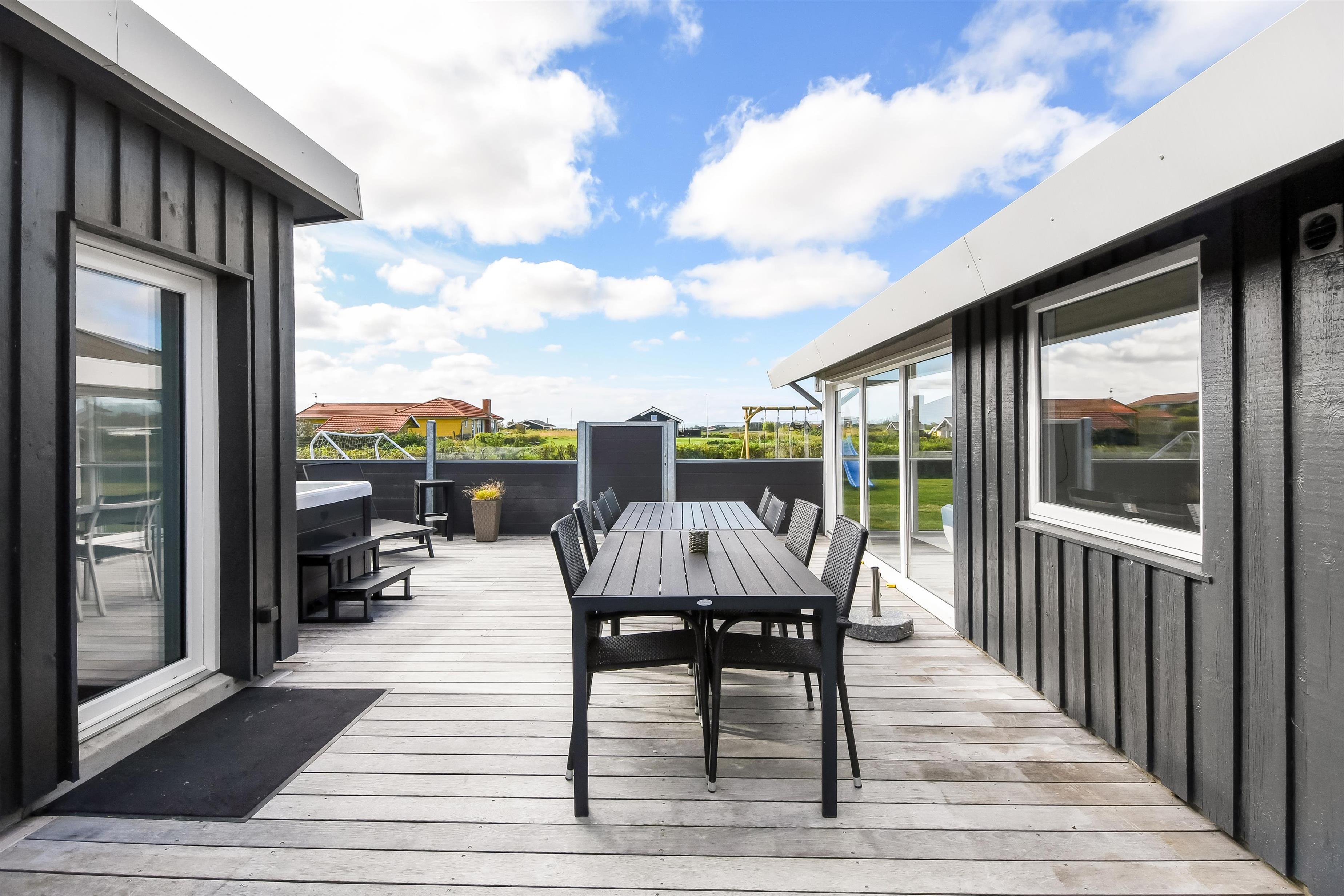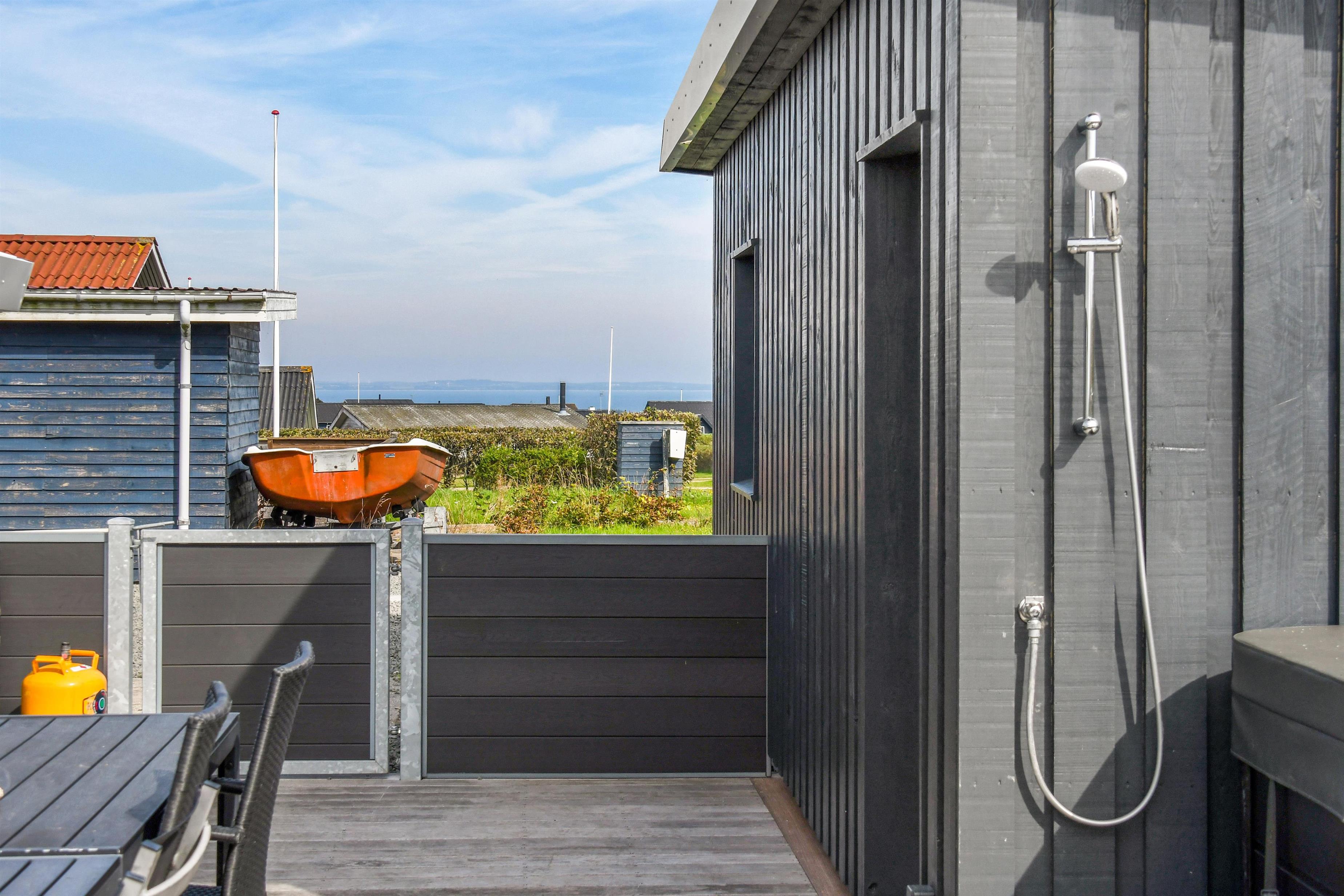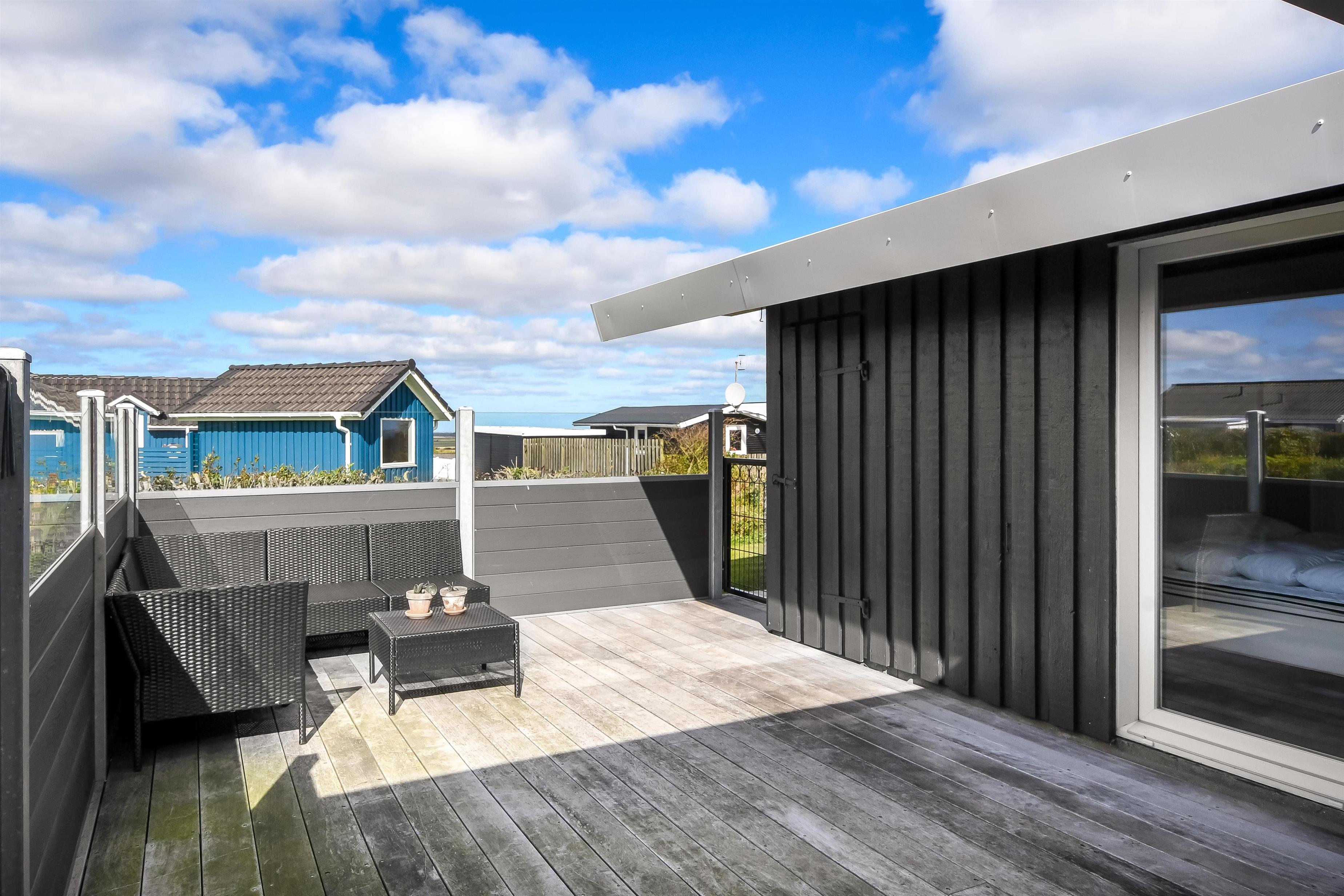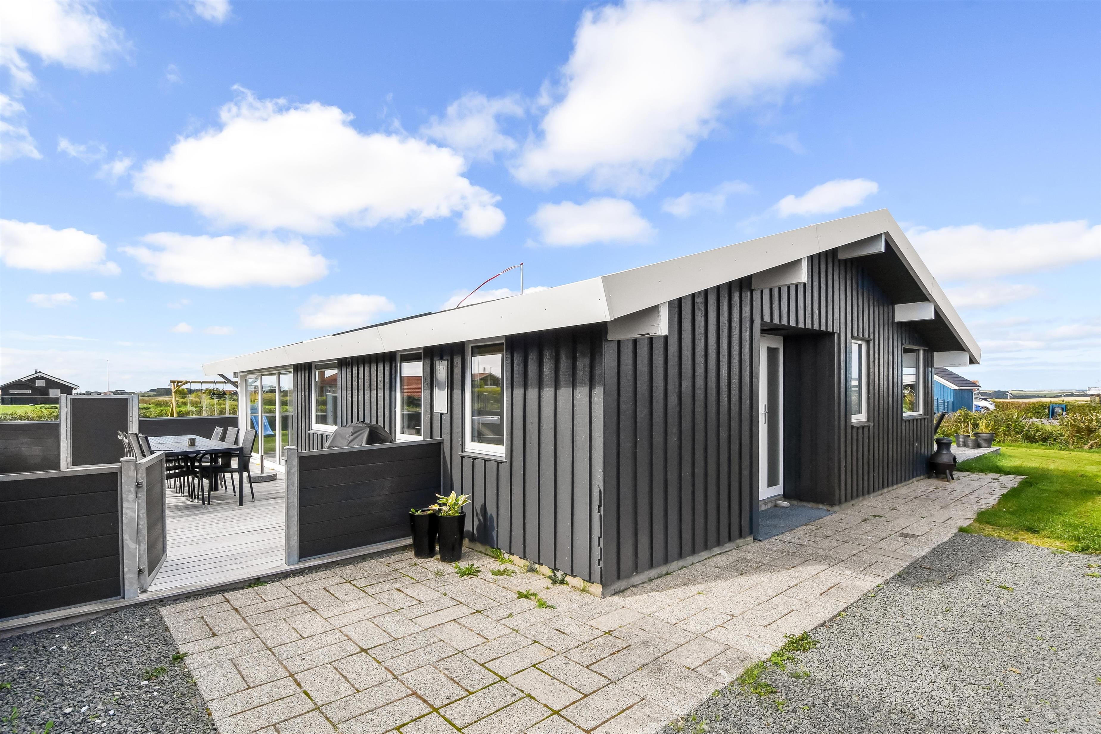 Huset ligger på en ca. 865 m² stor indhegnet grund, højt og ugeneret beliggende på en rolig stikvej. Velholdt indehegnet grund med trampolin, gynge og kun 700 meter fra stranden. Fantastisk, delvist overdækket og indhegnet terrasseanlæg med havemøbler, grill og liggestole. Her er også et skønt udendørs spabad, hvor man i al slags vejr kan sidde og nyde udsigten og om aftenen den stjerneklare himmel. Her kan der altid findes en plads i solen samt pragtfuldt kig til Limfjorden. Havemøbler, solvogn og grill kan flyttes rundt på terrassen efter behag. Også på bagsiden af huset er der en dejlig terrasse med havemøbler og udsigt over landskabet. Fra huset findes der stisystemer, som på få minutter fører direkte ned til fjord, badestrand og badebroer. Nær ved huset ligger også den nye flotte naturlegeplads, som er lavet i naturmaterialer og hvor der bl.a. er rutsjebaner, gynger og meget andet. Her findes også iskiosk og restaurant, som har åbent i sæsonen. Der er i øvrigt kun ca. fire km til Lemvig by, som er en livlig handelsby med mange butikker, fiskerestaurant, biograf, skaterbane, museum mm.