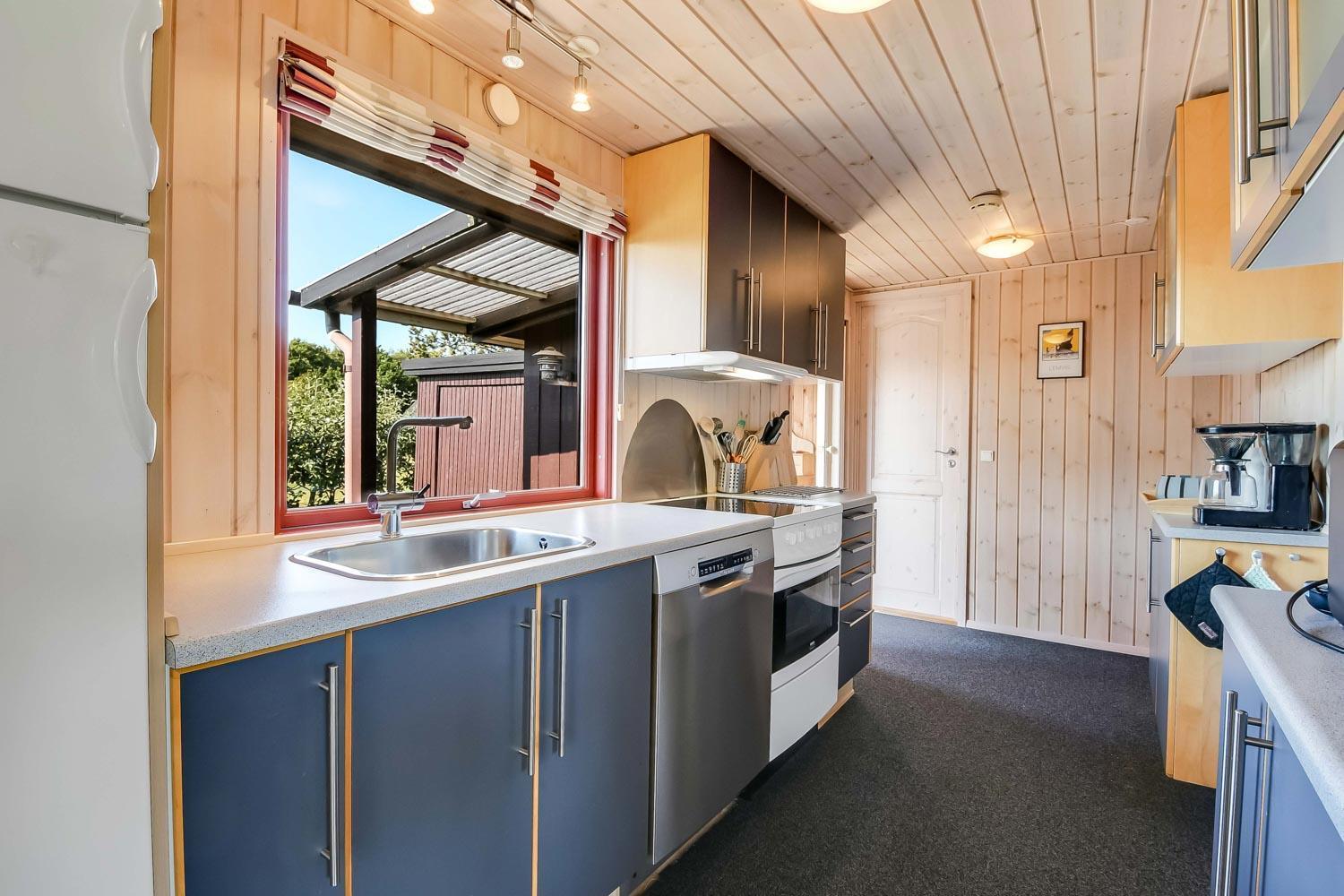 Køkkenet har glaskeramisk komfur, opvaskemaskine, køleskab og en separat fryser på 20 liter.