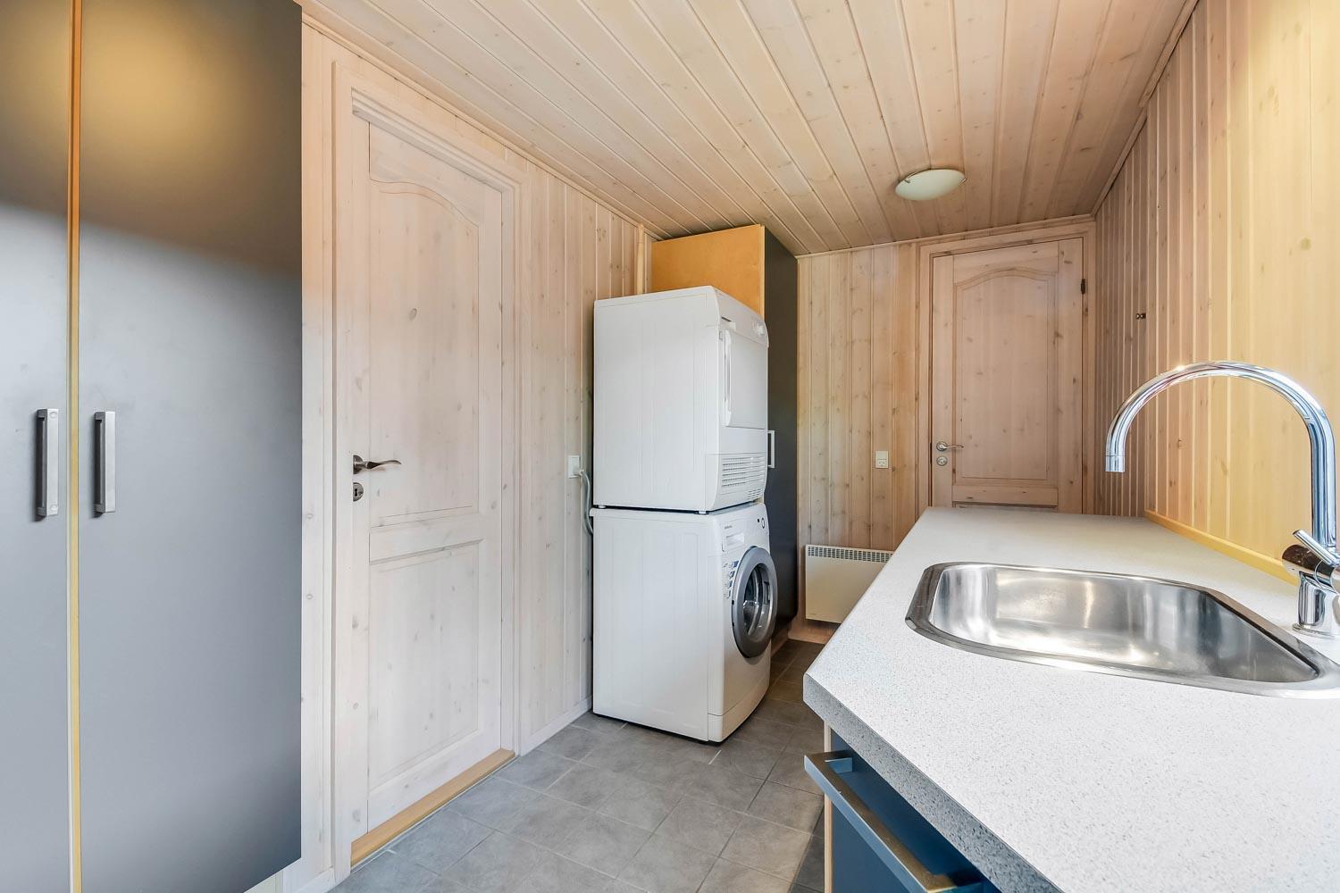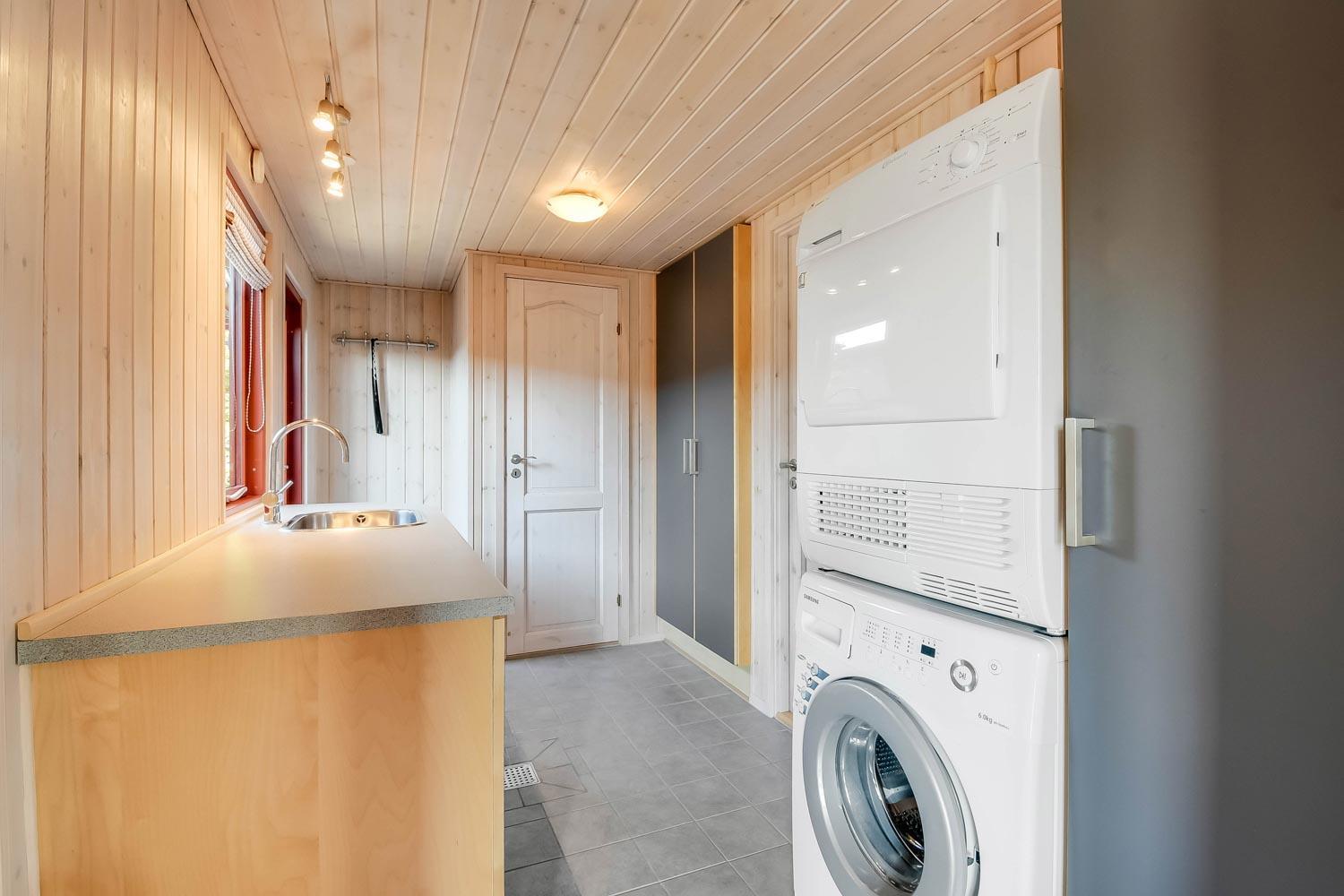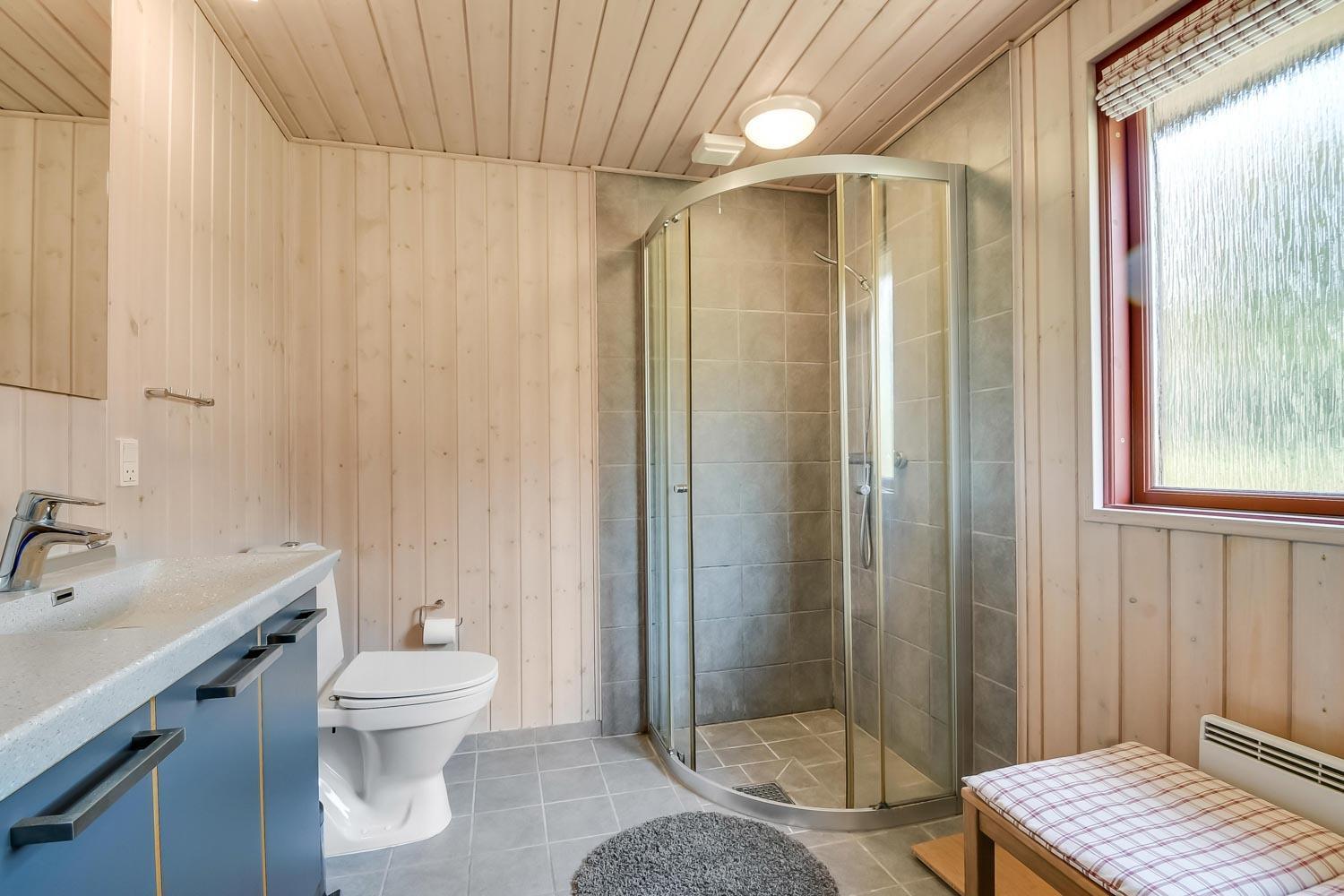 Huset har 3 soveværelser (1DS, 1DS 1KS). Badeværelser med håndvask, bruser, toilet og gulvvarme samt god skabsplads. Ekstra toilet med håndvask og toilet. I bryggers er der vaskemaskine og tørretumbler samt en ekstra vask og god skabsplads.