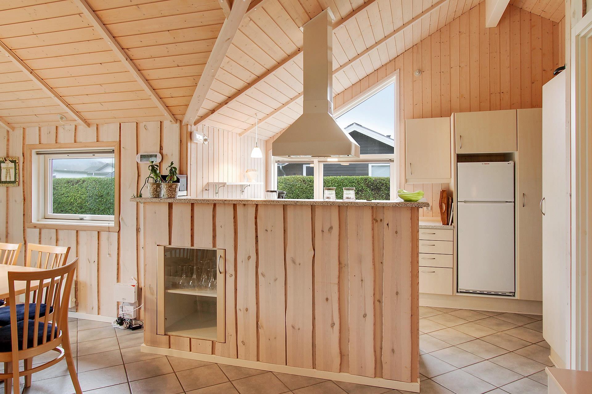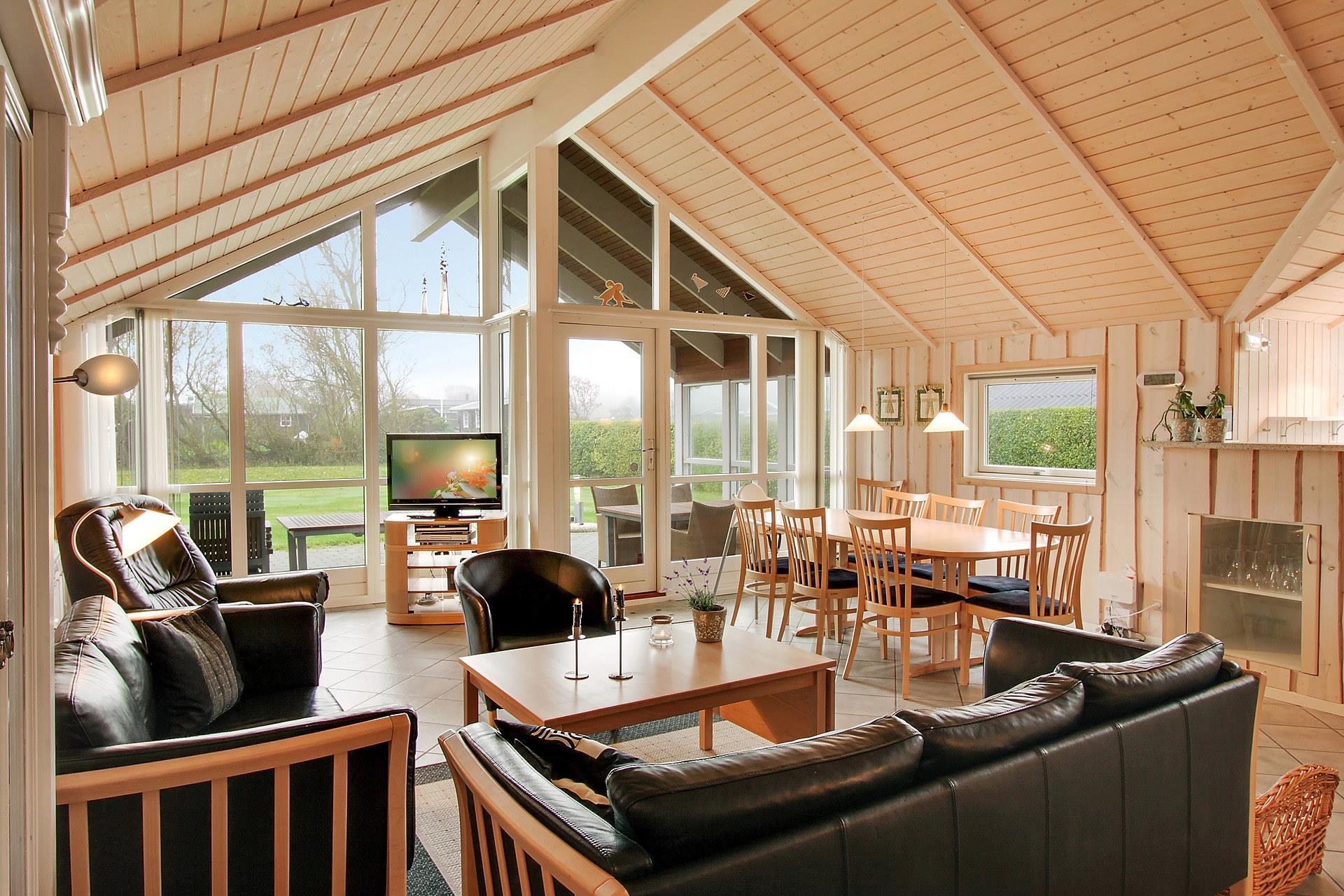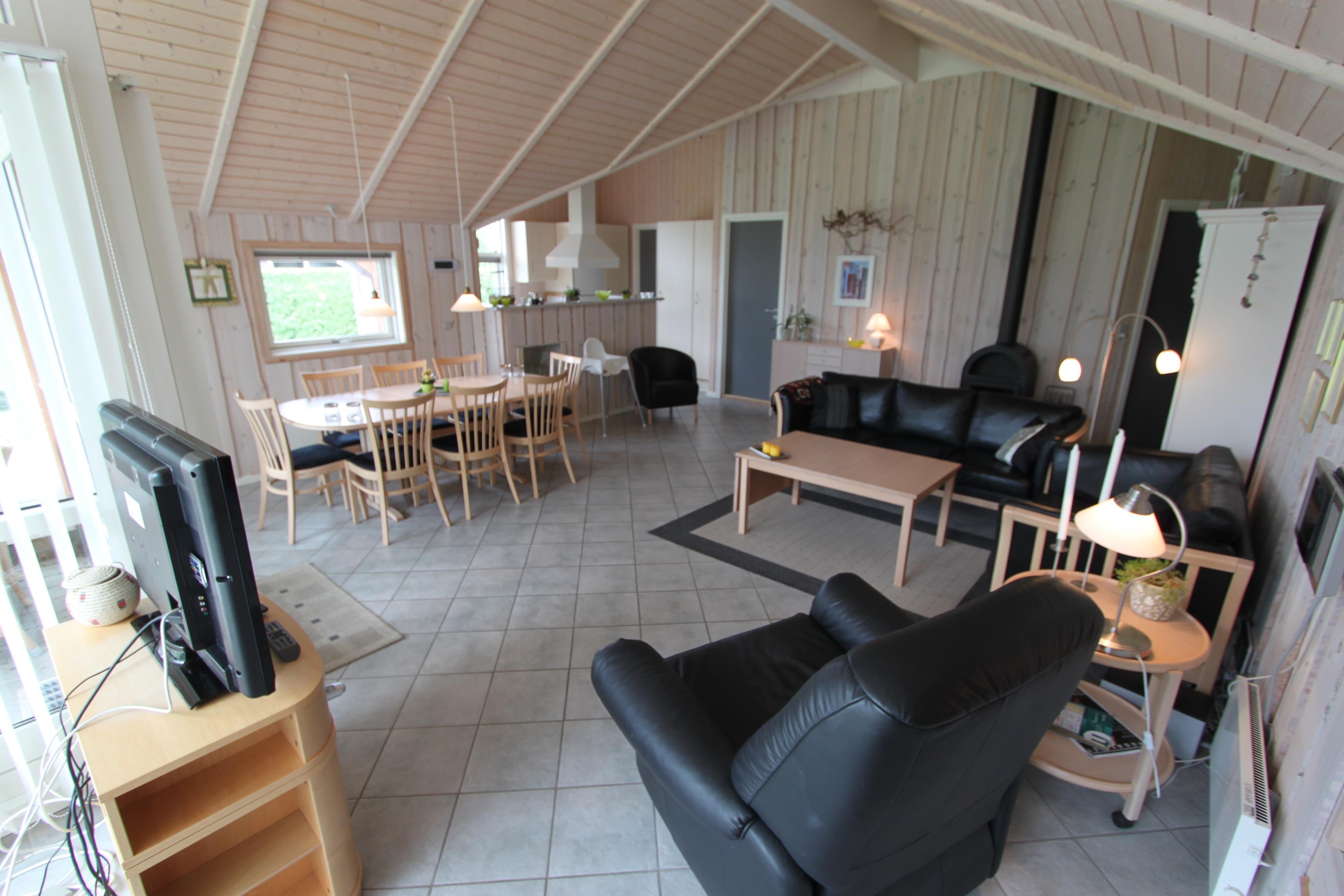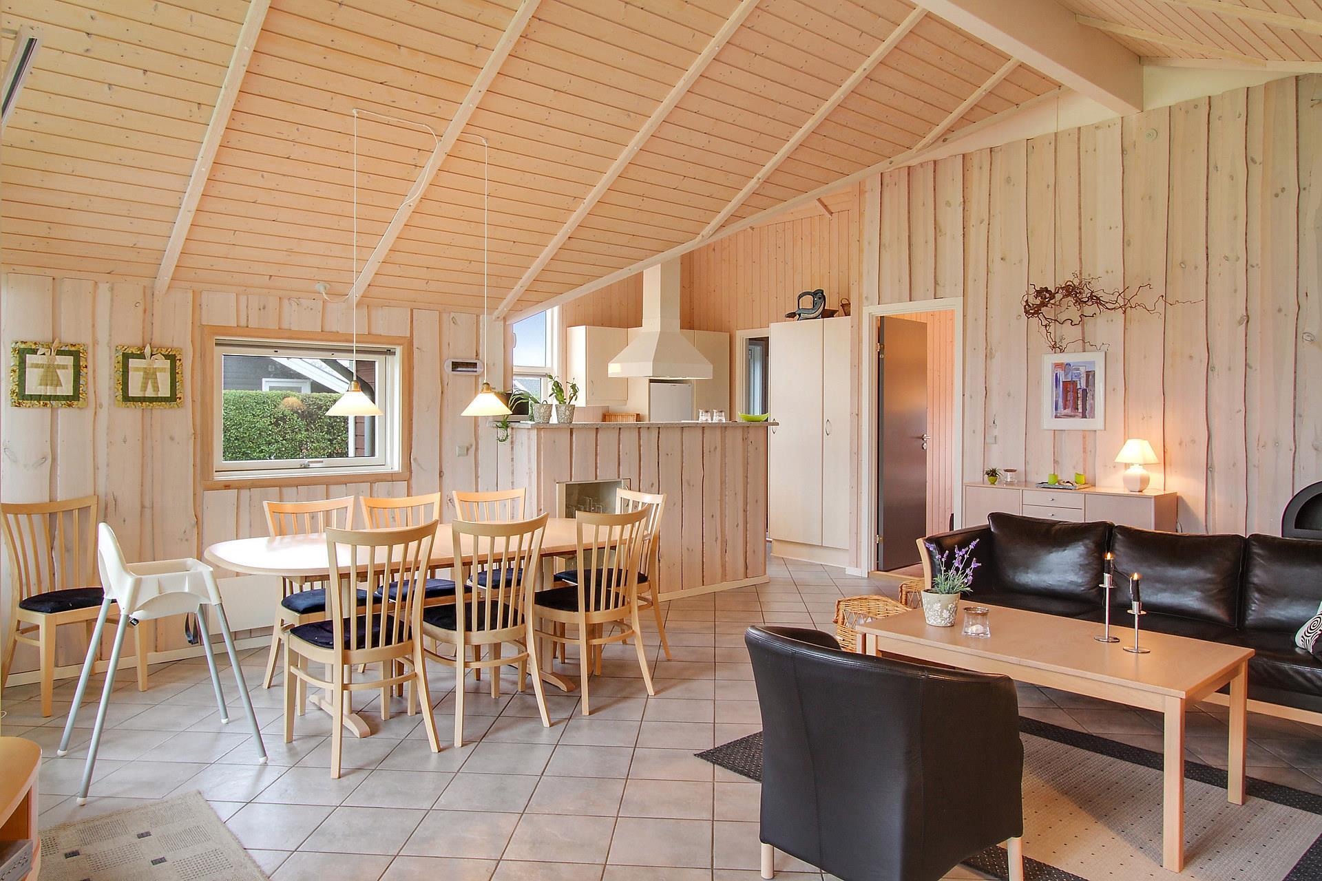 Køkken og stue er i samme rum og her er rigeligt plads til at hygge sig. Her er nemlig gulvvarme på klinkegulv som giver en dejlig ren og varm atmosfære. Huset fremtræder lyst og venligt med store vinduer. Her er flotte møbler, brændeovn, fladskærm med DR1 og parabol med tyske kanaler. Hertil er der DVD, stereoanlæg med CD. I stuen er der desuden en alkove med 2 sovemuligheder.Køkkenet byder på det man skal bruge: Glaskeramisk komfur, køle-/fryseskab, mikrobølgeovn og opvaskemaskine plus endda en børnehøjstol. Hertil er der 3 gode soveværelser hvoraf 2 af værelserne er med dobbeltsenge og så et enkelt værelse med køjeseng. Så i alt er der 3 soveværelser + alkoven med plads til 2. Huset udmærker sig med den luksus at der er 2 gulvopvarmede badeværelser. Det ene består har både boblebad, håndvask, toilet og bruser, mens det andet har en håndvask og et toilet. I det lille bryggers er der vaskemaskine og i udhuset har man tørretumbleren. Ikke rygerhus