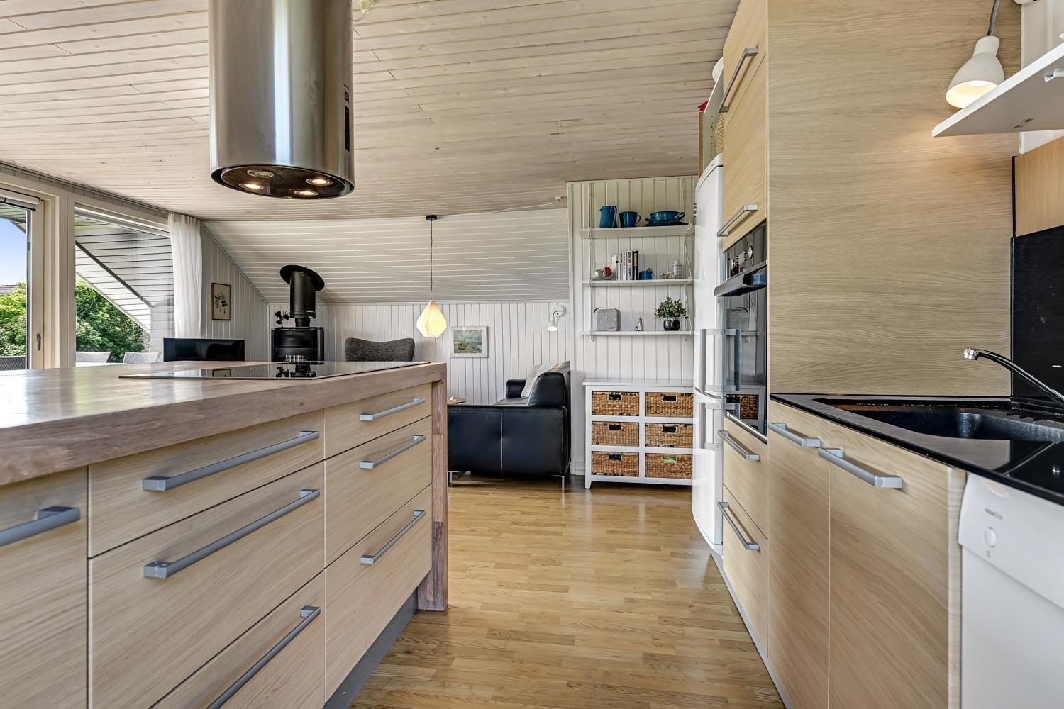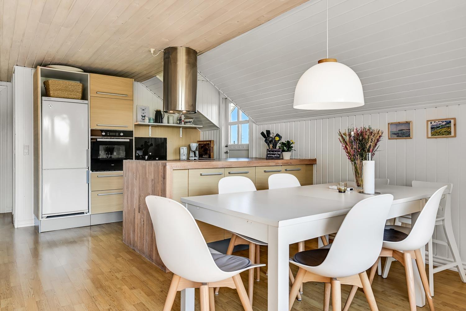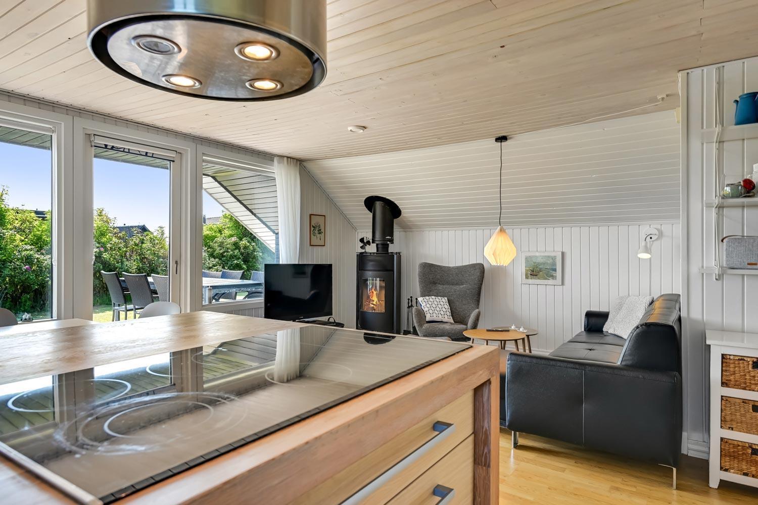 Feriehus på ca. 72 m2. fra 1979 og renoveret i 2018. Entréen byder jer velkommen og leder videre til en opholdsstue med hyggelig møblering, en brændeovn, spisebord samt TV med danske, tyske, norske og svenske kanaler. Derudover er der mulighed for streaming af egne streamingtjenester. Fra spisebordet er der flot kig til Limfjorden. Samtalekøkken med glaskeramiske kogeplader, indbygningsovn, emhætte, opvaskemaskine, mikroovn, og køleskab med fryseboks. Alt dette med praktiske trægulve. Derudover 3 mindre soveværelser med gulvtæpper. (1DS, 1DS, 1KS). Badeværelse med toilet, håndvask, bruser og linoleumsgulve. Vaskemaskine er i skuret. Der er desuden varmepumpe i huset, som gør elopvarmningen billigere.