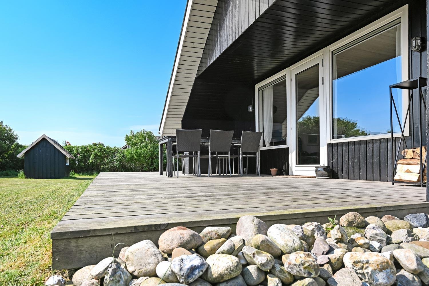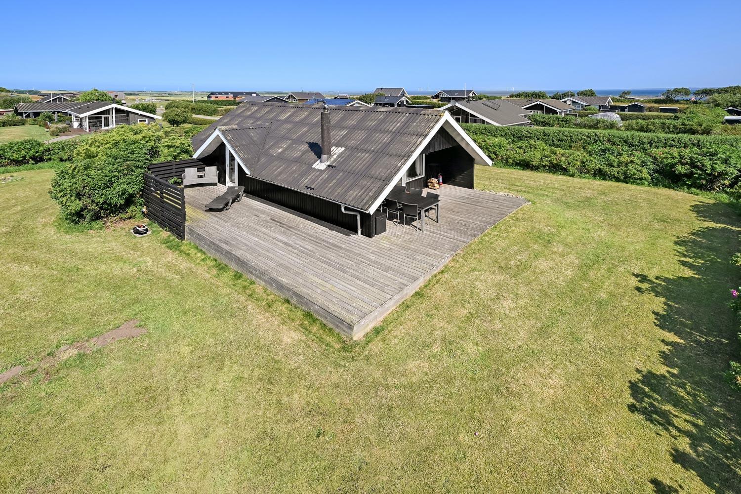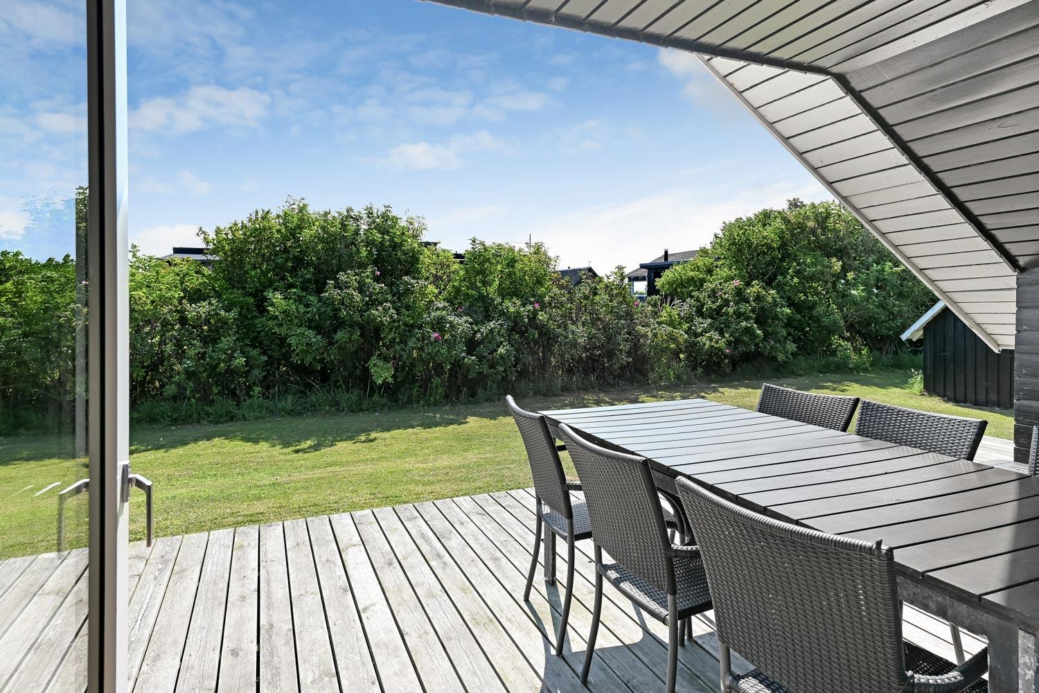 Huset har en helt ny lille træterrasse omme foran ved indgangen og en stor samt delvist overdækket træterrasse bag huset. Det er noget helt særligt og der findes der altid en plads i solen både eftermiddags- og aftensol, og ikke mindst kan man nyde en meget smuk solnedgang. Havemøbler, solvogn og grill kan flyttes rundt på terrasserne efter behag. Højt, ugeneret beliggende på en stikvej på en velholdt grund på ca. 843 m2 med legehus og kun 500 m. fra Limfjorden. Fra huset findes der stisystemer, som på få minutter fører direkte ned til fjord, badestrand og badebroer. Nær ved huset ligger også den nye flotte naturlegeplads i træ med rutsjebaner, gynger og meget andet. Her findes også iskiosk og restaurant.