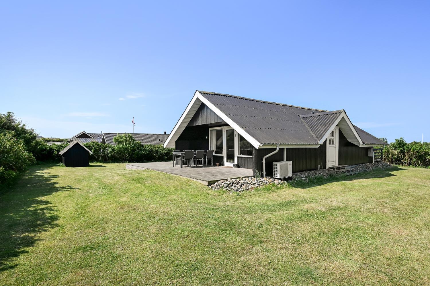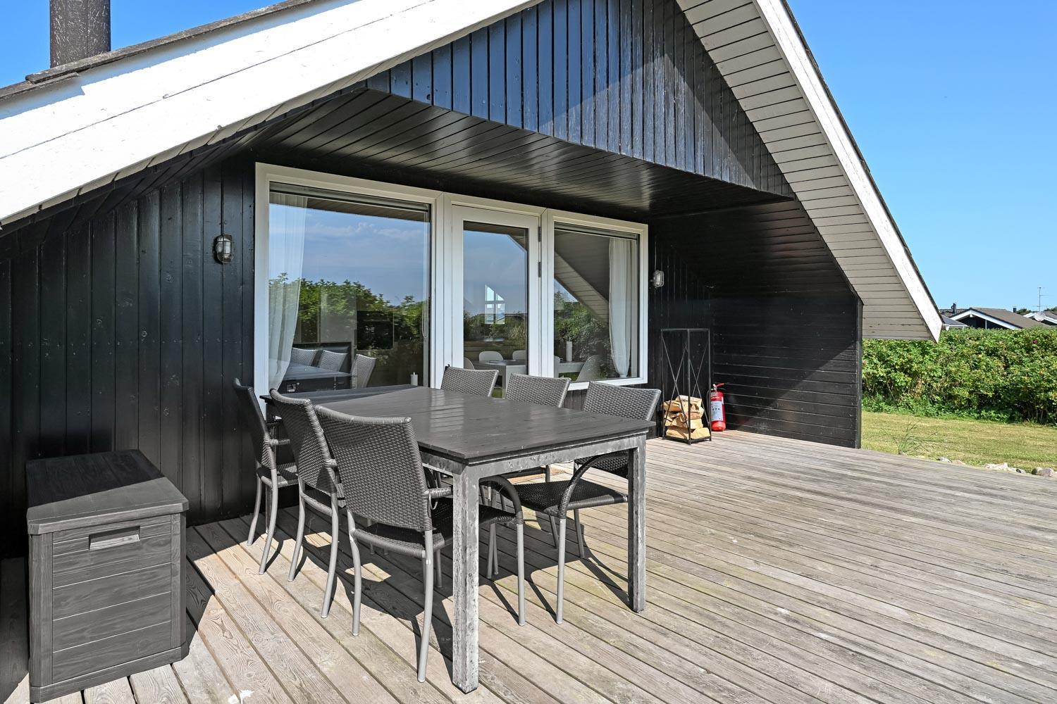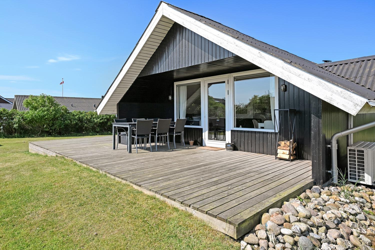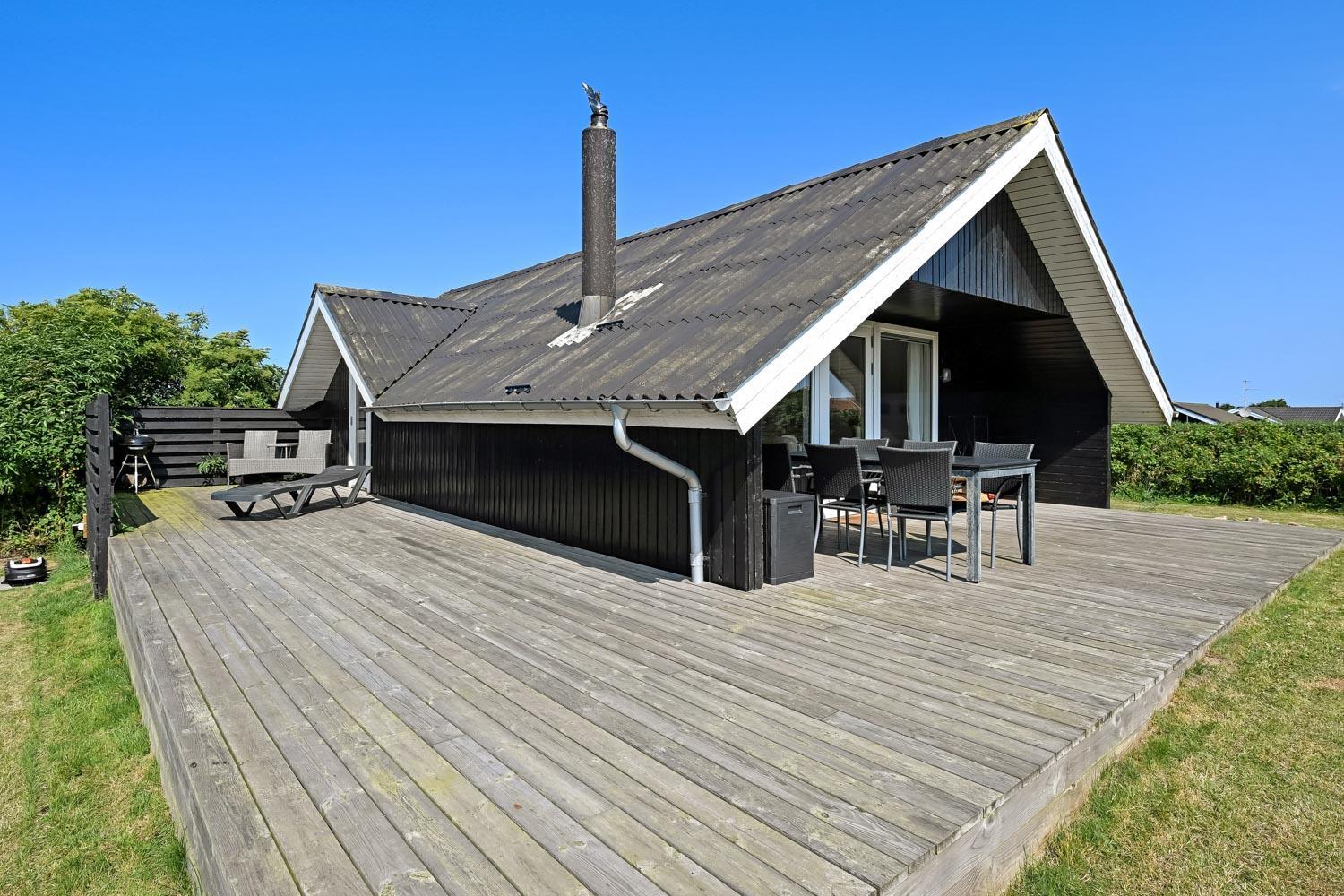 Huset har en helt ny lille træterrasse omme foran ved indgangen og en stor samt delvist overdækket træterrasse bag huset. Det er noget helt særligt og der findes der altid en plads i solen både eftermiddags- og aftensol, og ikke mindst kan man nyde en meget smuk solnedgang. Havemøbler, solvogn og grill kan flyttes rundt på terrasserne efter behag. Højt, ugeneret beliggende på en stikvej på en velholdt grund på ca. 843 m2 med legehus og kun 500 m. fra Limfjorden. Fra huset findes der stisystemer, som på få minutter fører direkte ned til fjord, badestrand og badebroer. Nær ved huset ligger også den nye flotte naturlegeplads i træ med rutsjebaner, gynger og meget andet. Her findes også iskiosk og restaurant.