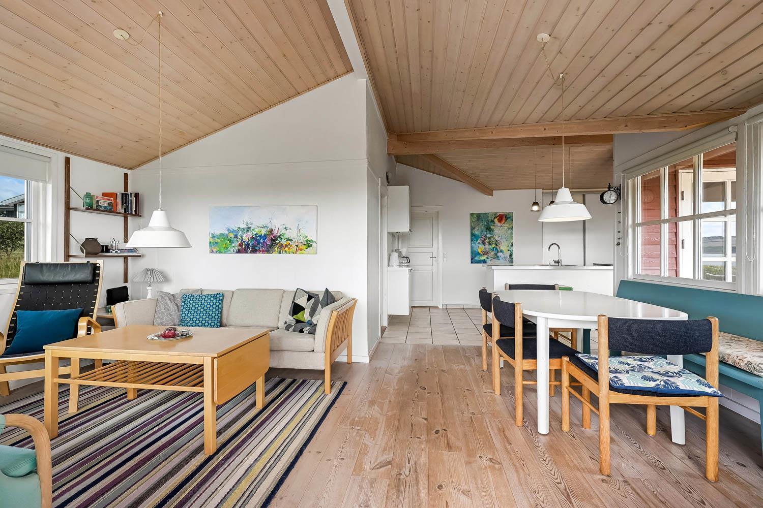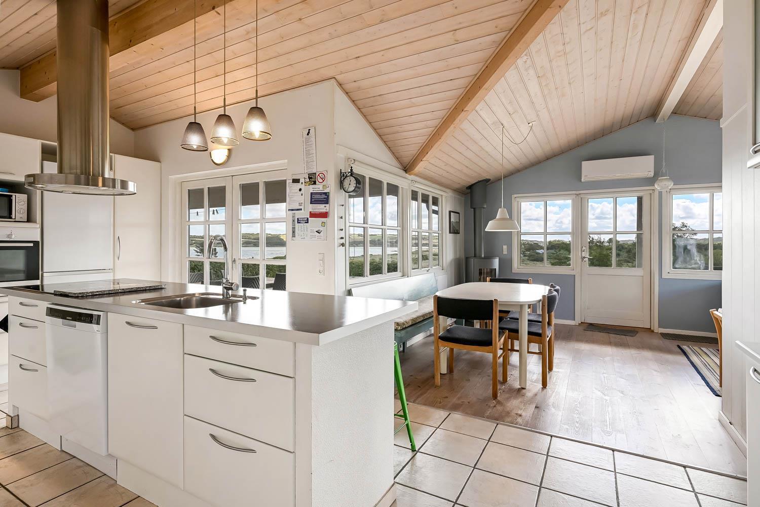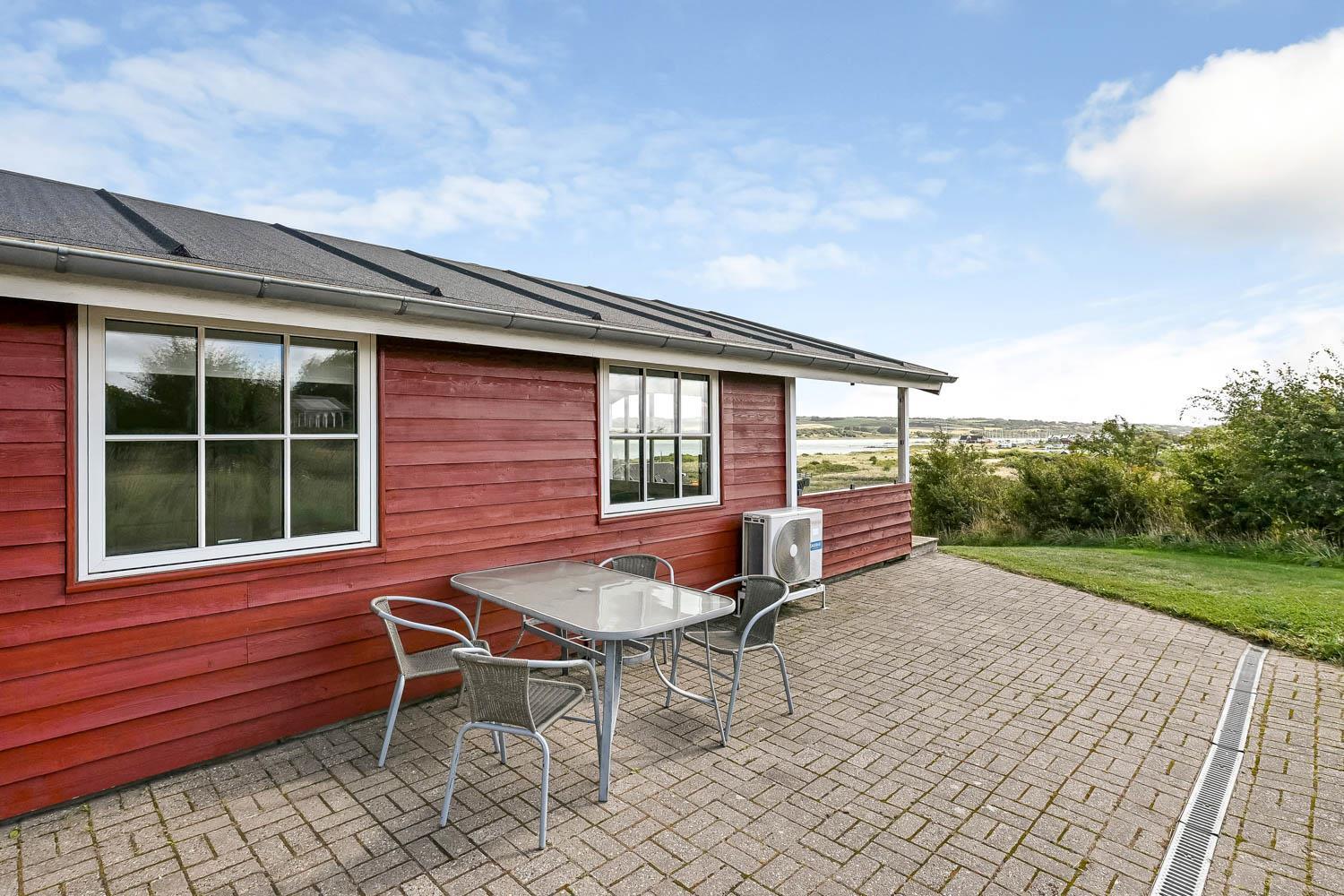 Dette flotte feriehus i træ er indrettet med store vinduespartier, og er lyst og venligt samt moderne indrettet, fra både køkken og stuen er der en skøn udsigt over Limfjorden og lystbådehavnen. I køkkenet er der klinkegulv og stuen er med trægulv. Badeværelset er indrettet med toilet, håndvask, bruser, spabad samt klinkegulv med gulvvarme. Huset er indrettet med 3 soverum: 1DS + 1DS + 2S. Køkkenafdelingen er indrettet med glaskeramisk komfur, køleskab med 90 l. separat fryser, opvaskemaskine og mikroovn. Stuen er indrettet med polstermøbler og TV med danske og tyske programmer, spisebord og stole som er placeret tæt på køkkenet, brændeovn som giver en behagelig varme uanset årstid, og sammen med varmepumpen er de begge medvirkende til at spare på forbrugsafregningen. Der er vaskemaskine og tørretumbler. Til de mindste gæster er der en barneseng. Gratis Internetadgang. 1 husdyr er tilladt. Ikke rygerhus.
