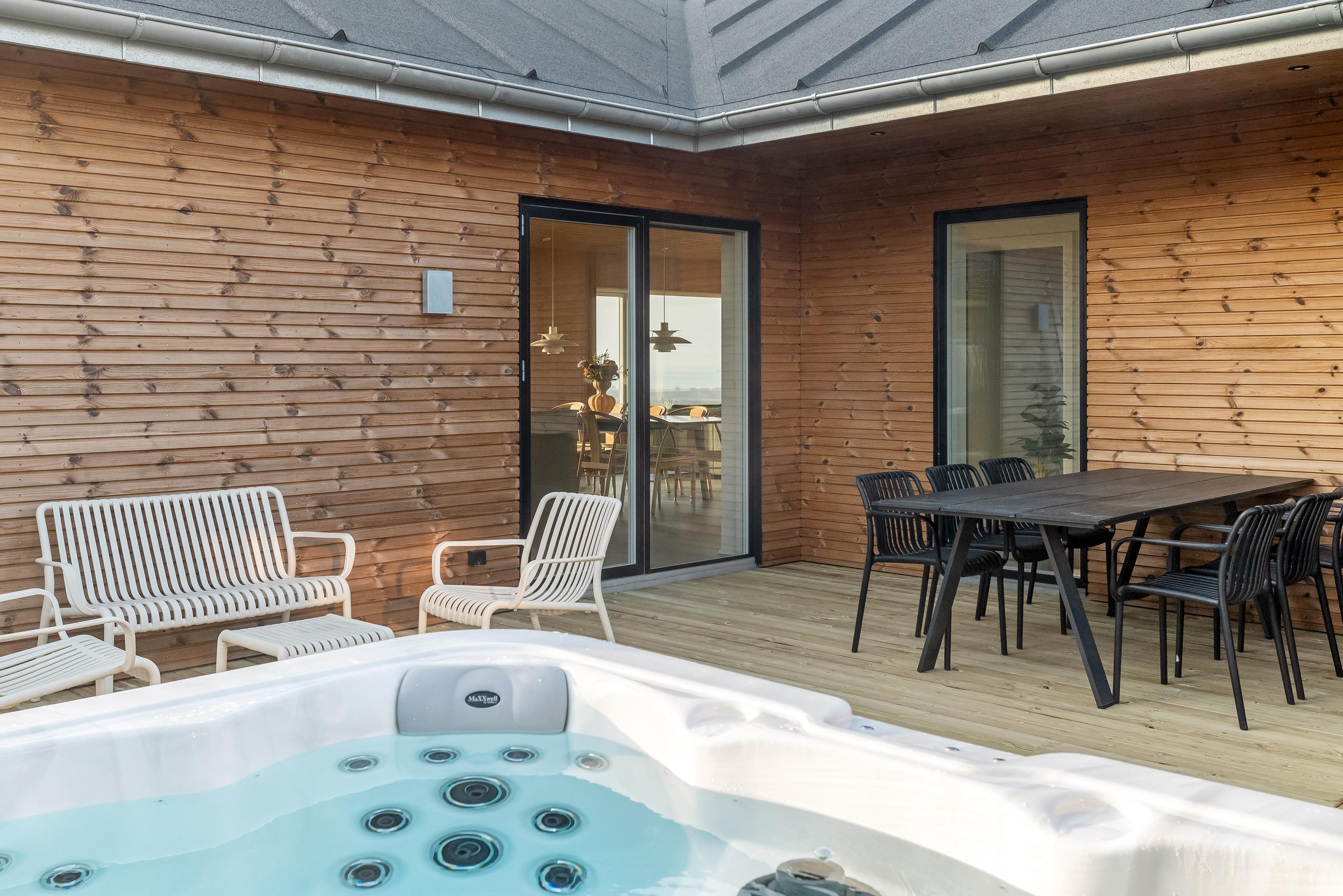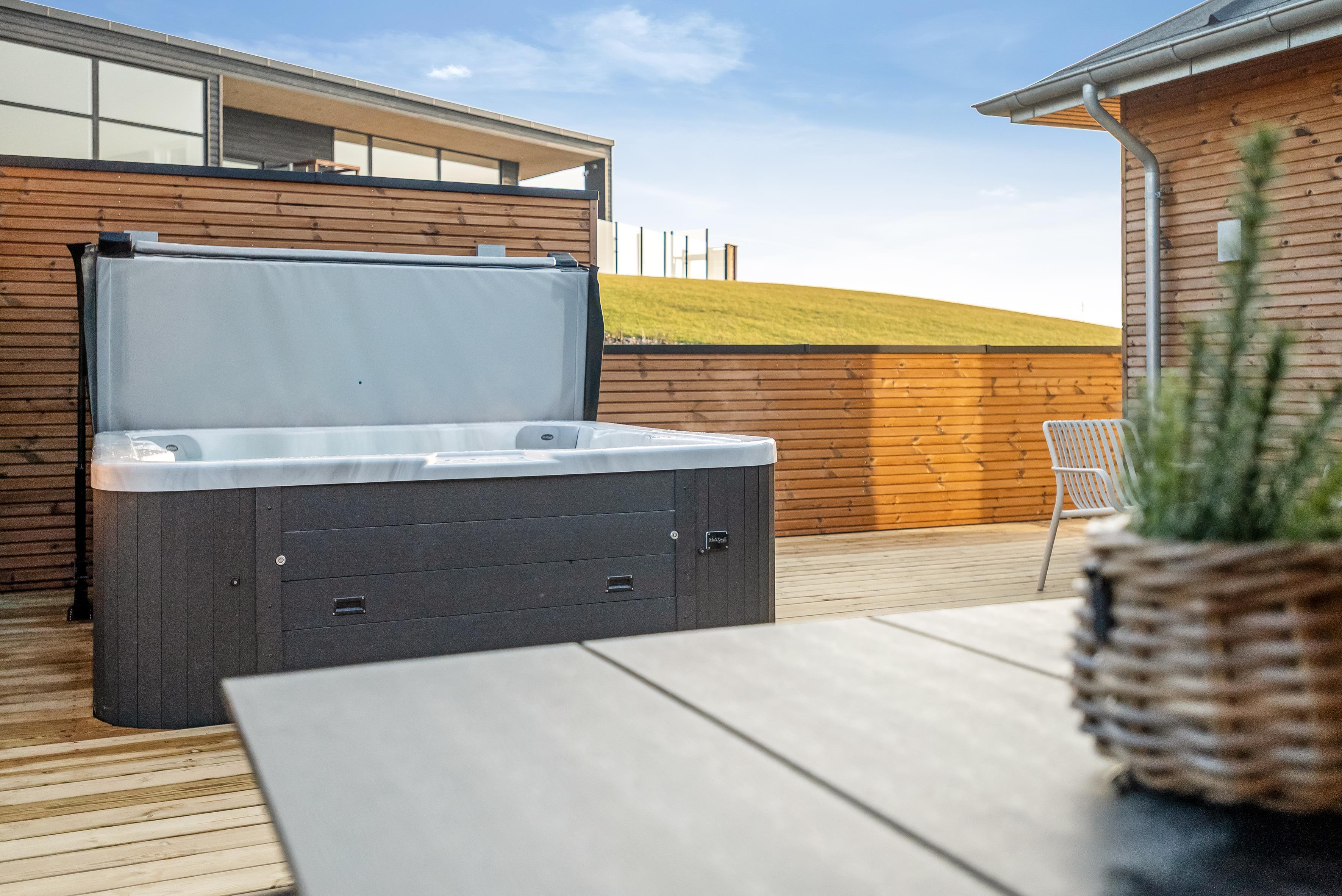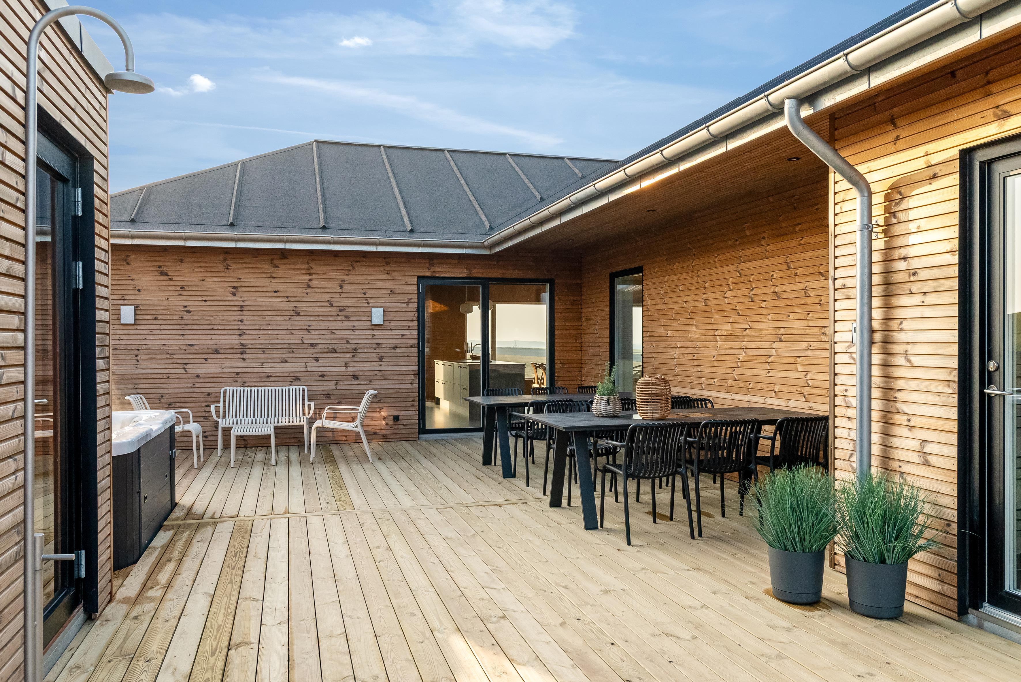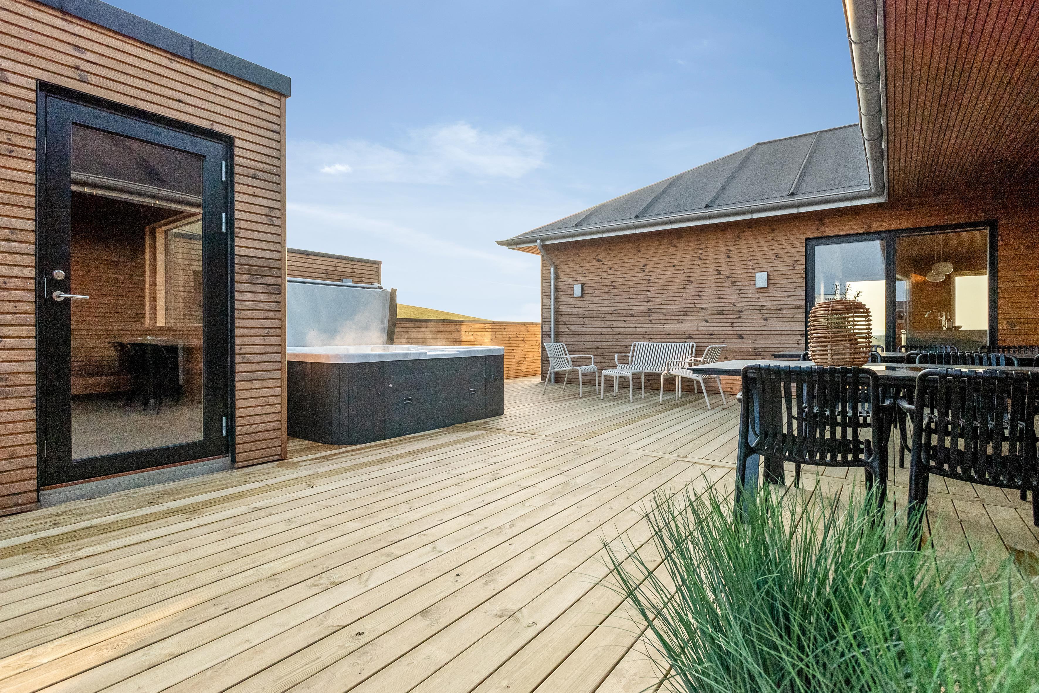 Udendørs finder du et eksklusivt wellnessområde med stort udespa og en luksuriøs sauna med plads til seks personer – perfekt til afslapning under åben himmel.