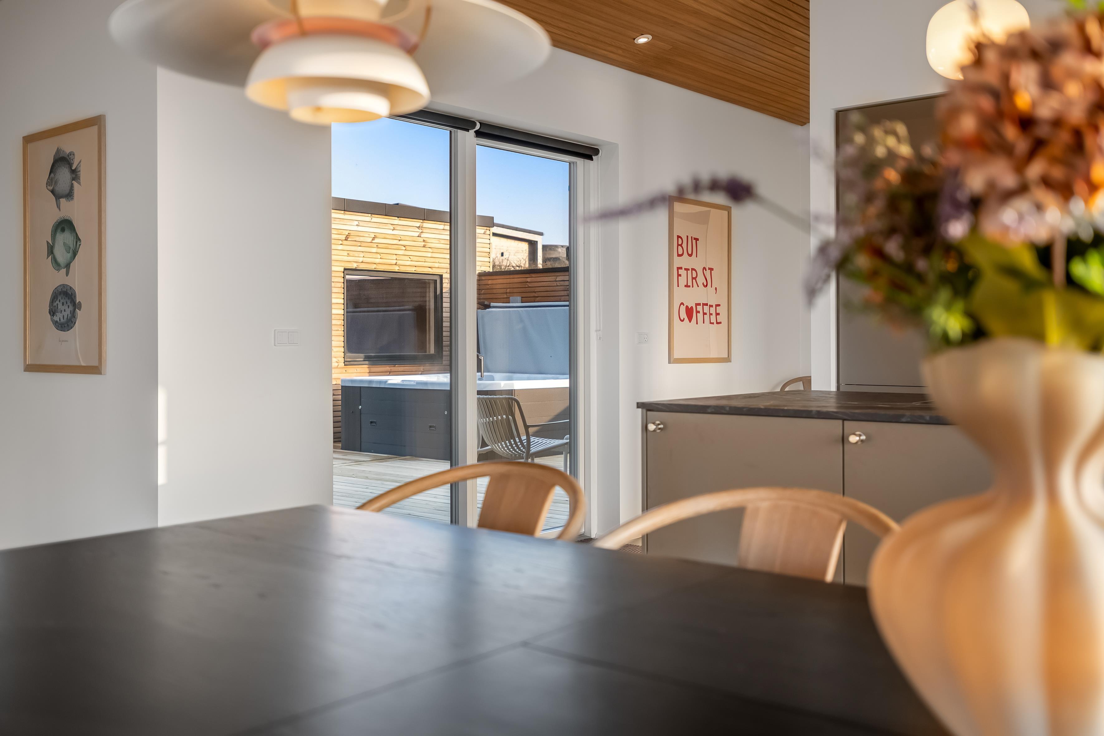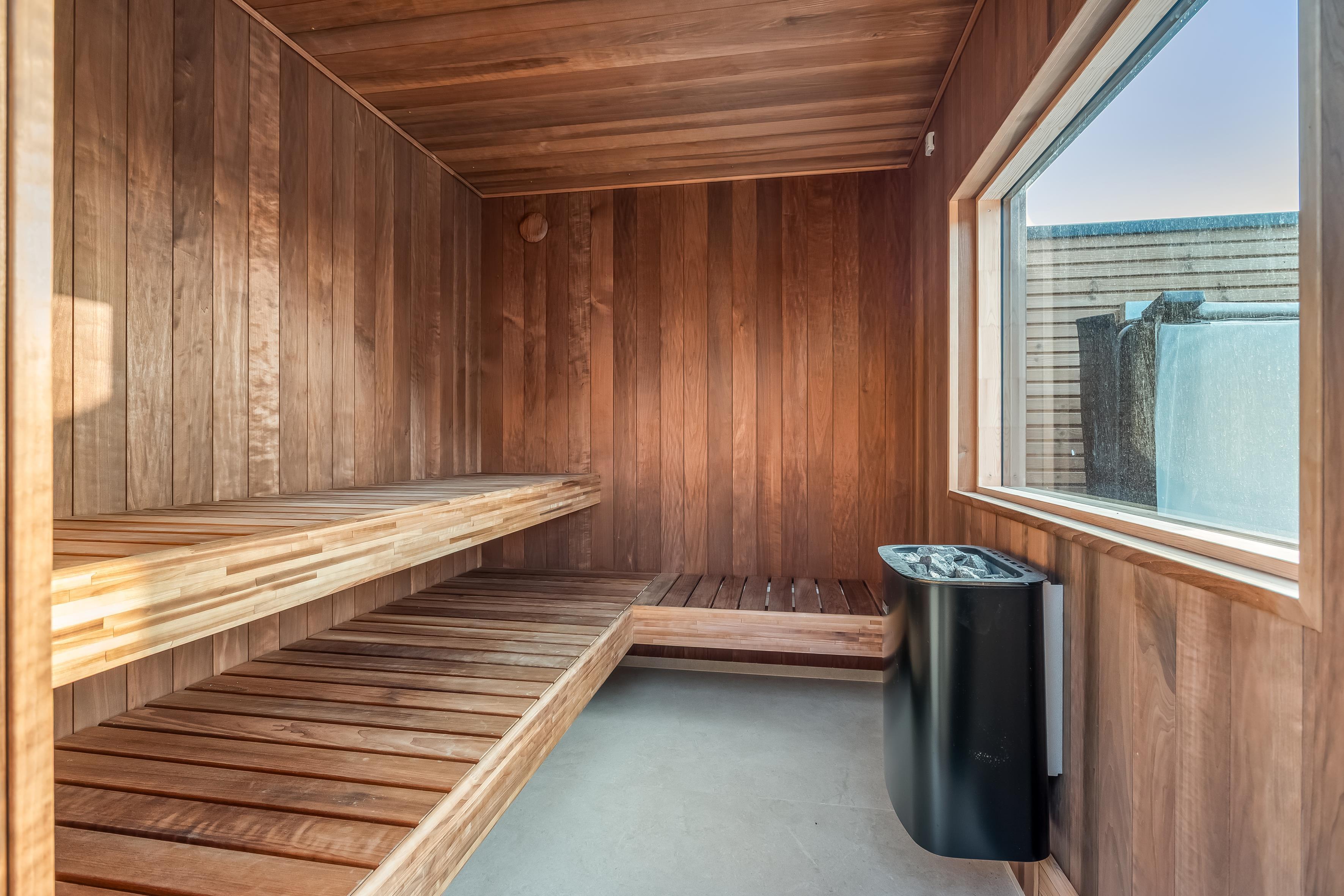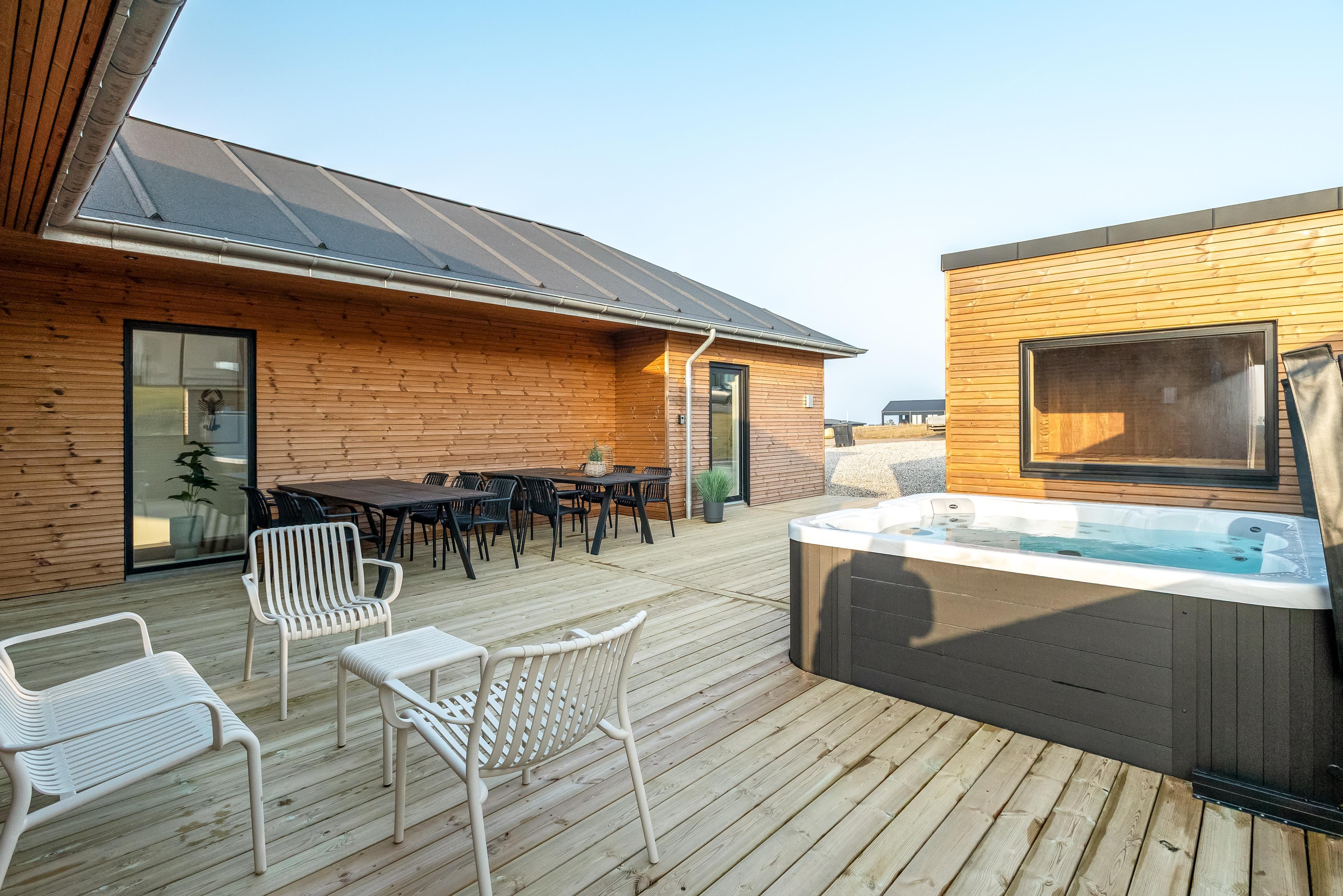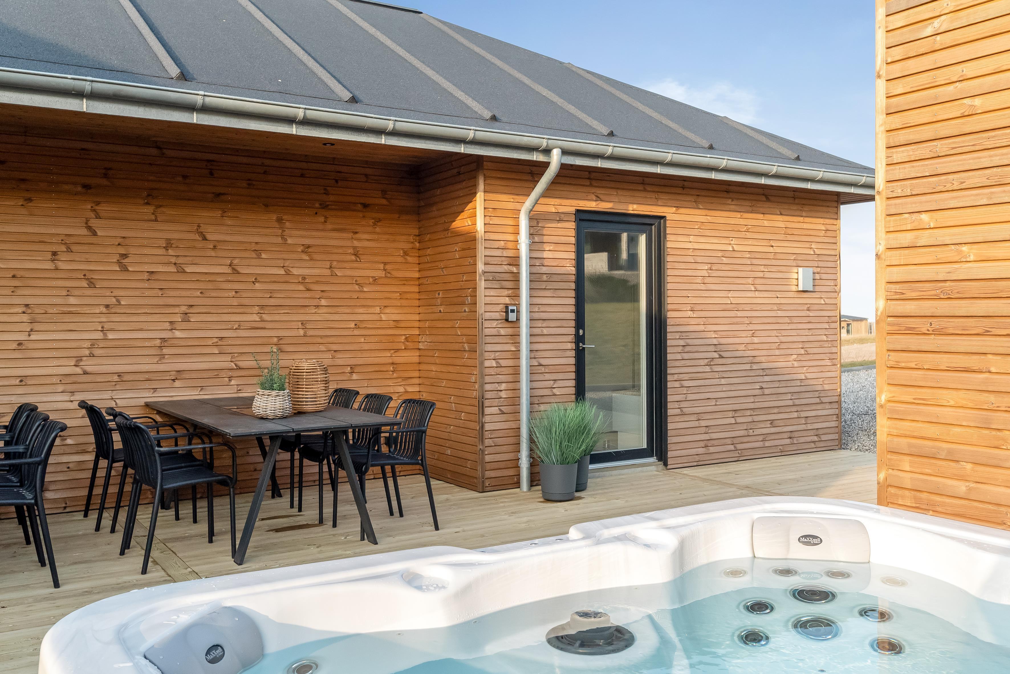 Udendørs finder du et eksklusivt wellnessområde med stort udespa og en luksuriøs sauna med plads til seks personer – perfekt til afslapning under åben himmel.