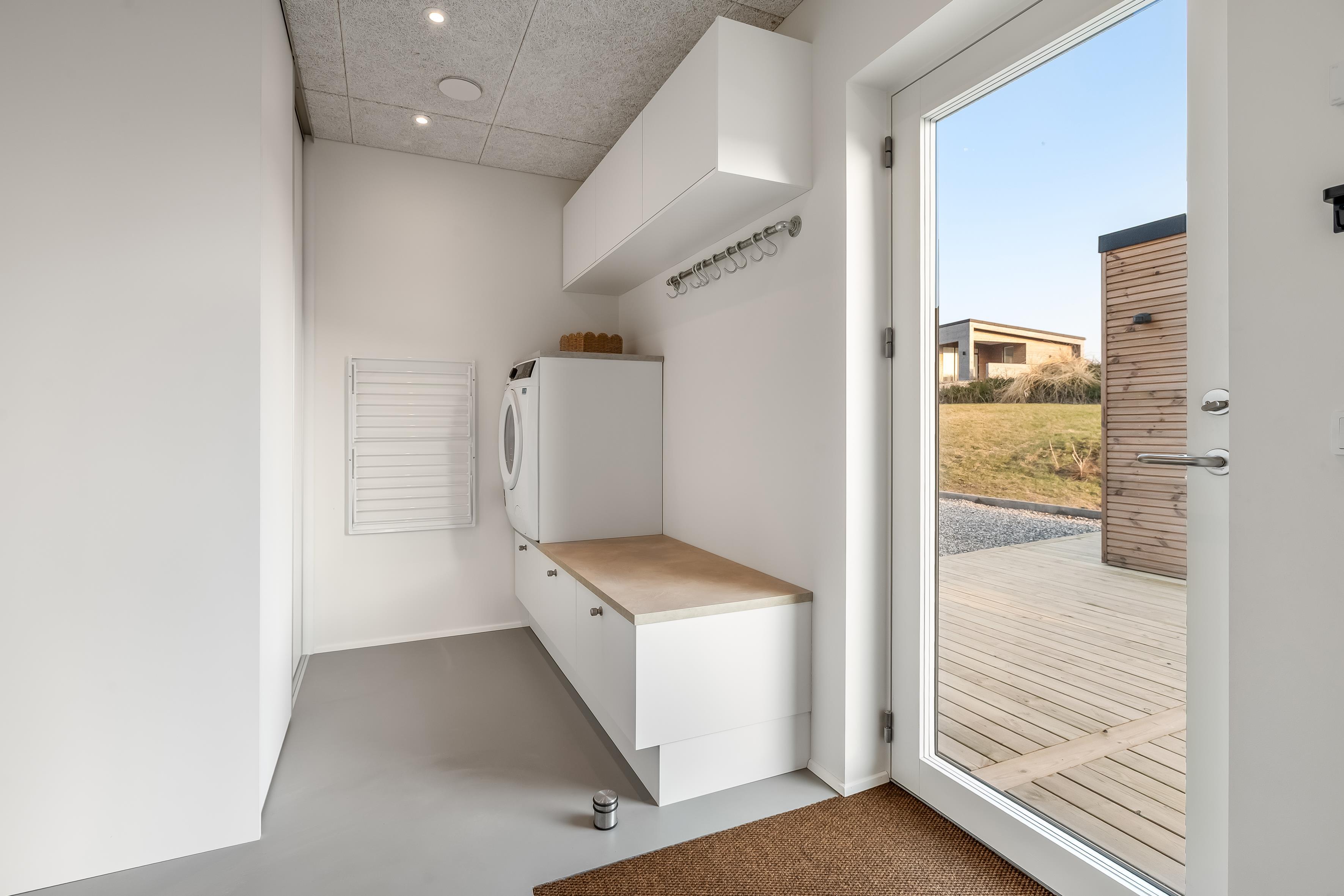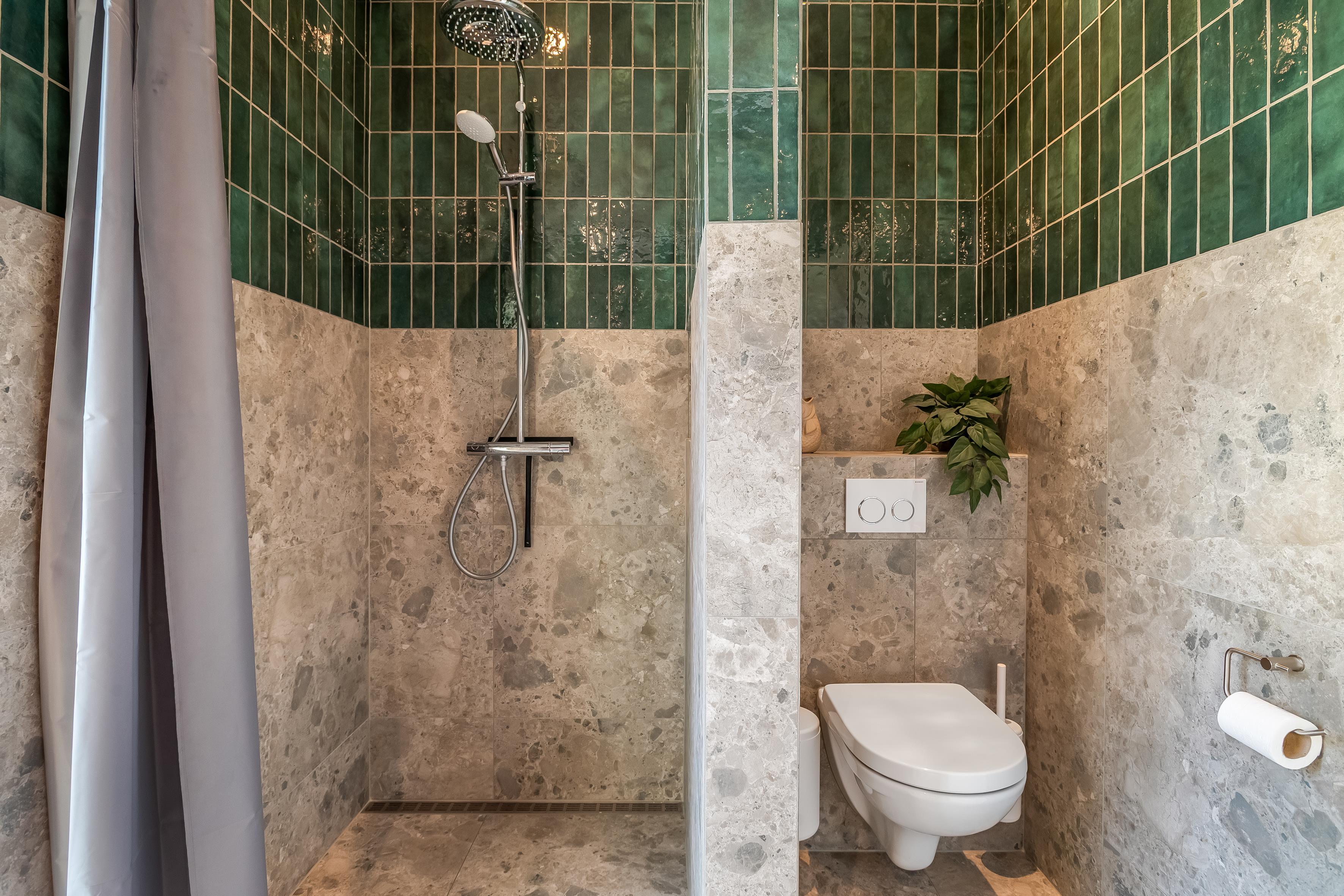 Boligen rummer desuden to eksklusive badeværelser, begge udført i lækre materialer og udstyret med bruser og toilet. Derudover er der vaskemaskine og tørretumbler til rådighed.