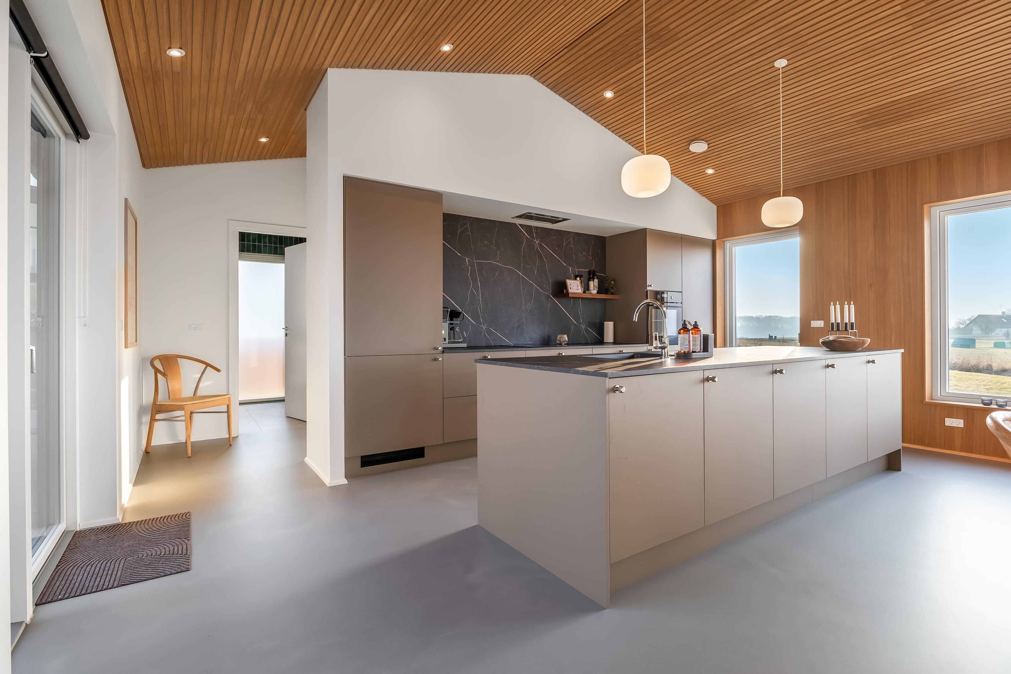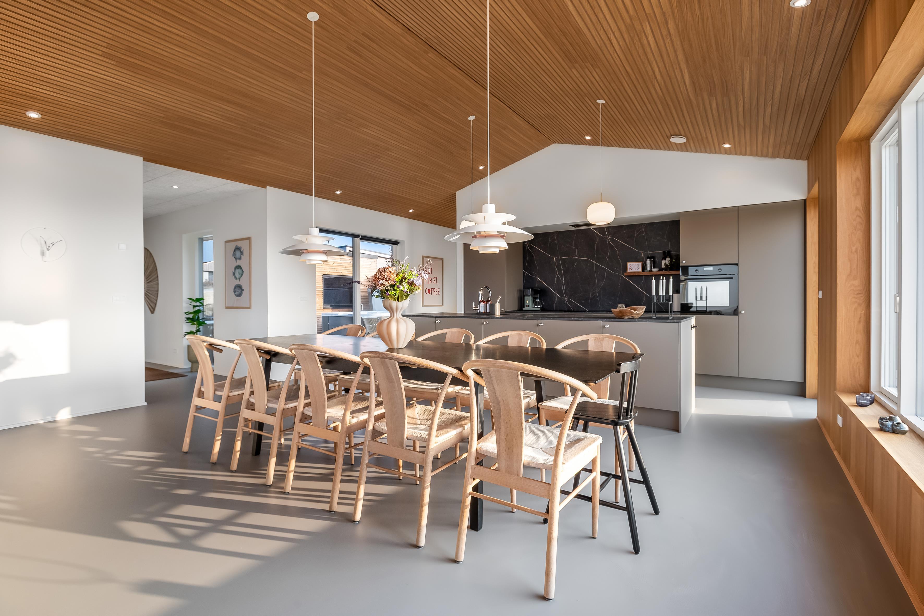 Husets naturlige samlingspunkt er det åbne køkken/alrum og stue, som fremstår lyst, stilrent og indbydende. Køkkenet er fuldt udstyret med moderne kvalitetsløsninger, herunder keramisk kogeplade, emhætte, ovn, mikroovn, opvaskemaskine, kaffemaskine samt et stort køle-/fryseskab.