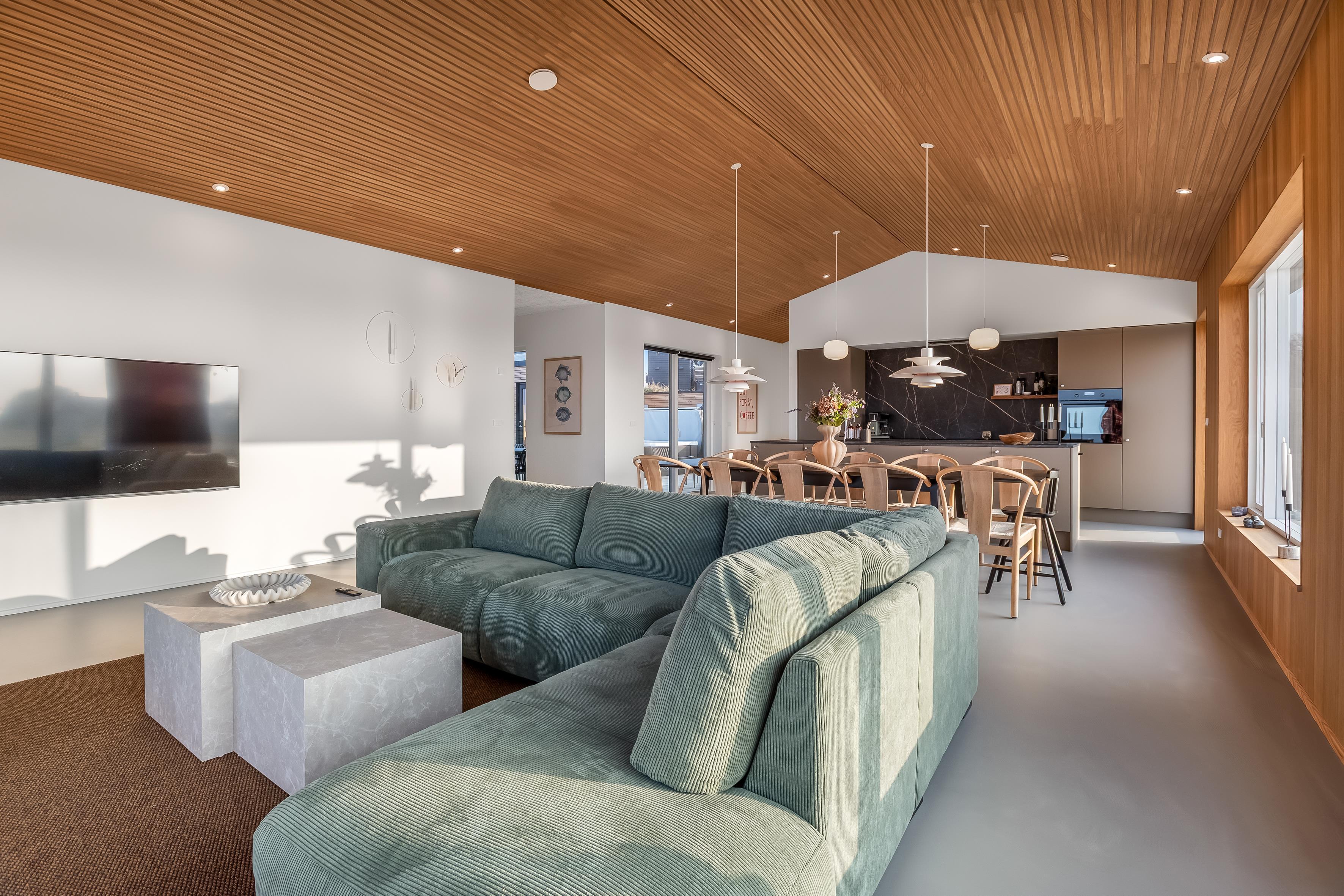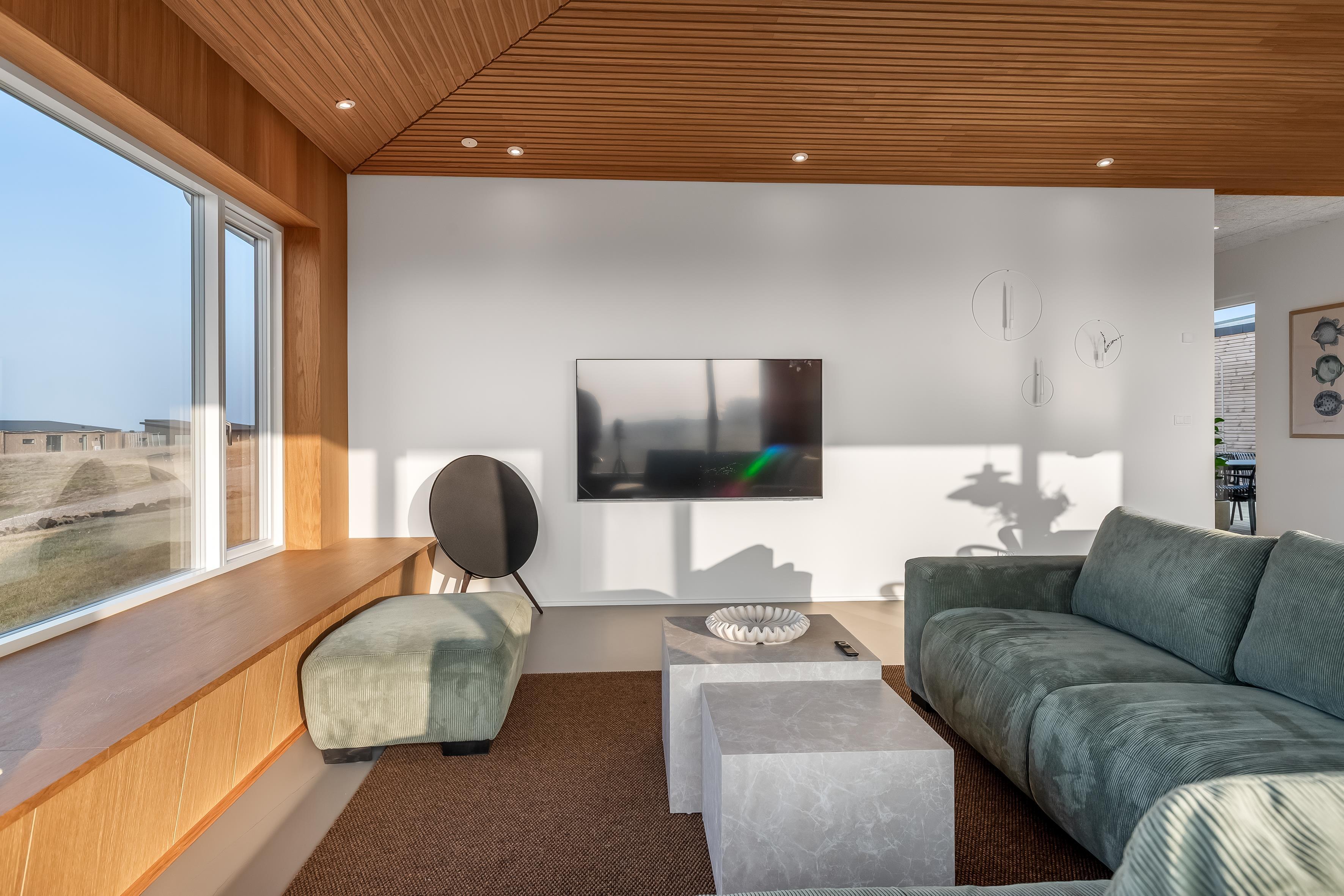 Stuen er elegant indrettet med moderne møbler og byder på Smart TV med streamingmuligheder samt hurtigt internet, hvilket gør den ideel til både afslapning og underholdning.