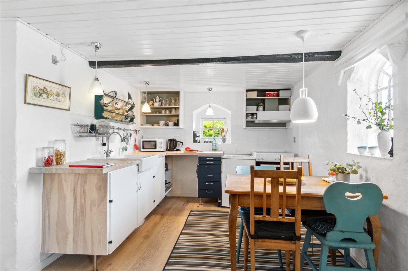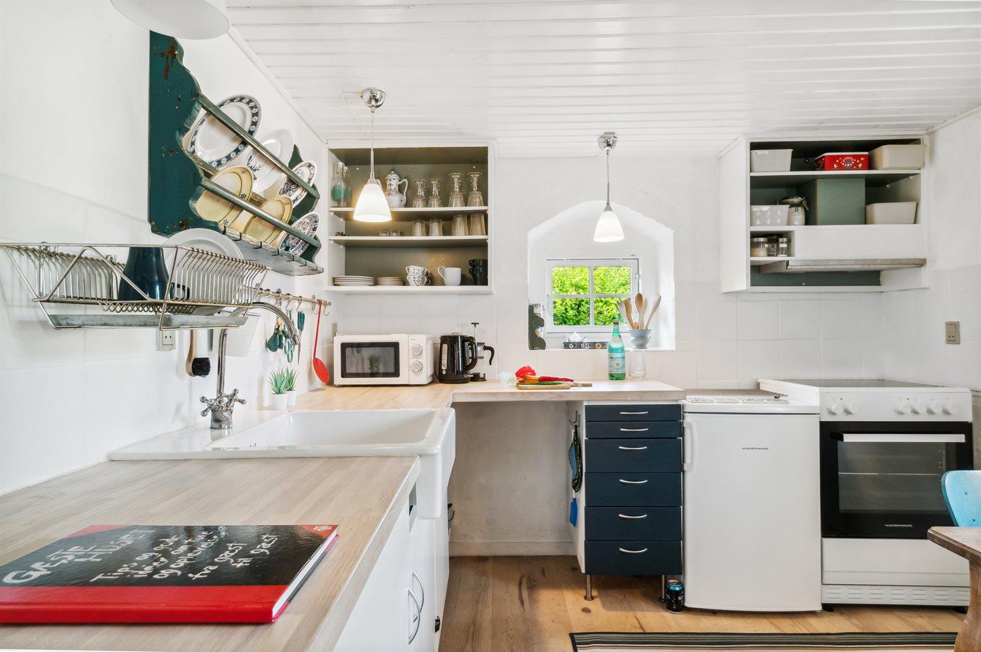 Køkkenet er udstyret med 1 køleskab. Der er 4 keramiske kogeplader, varmluftovn, mikrobølgeovn.