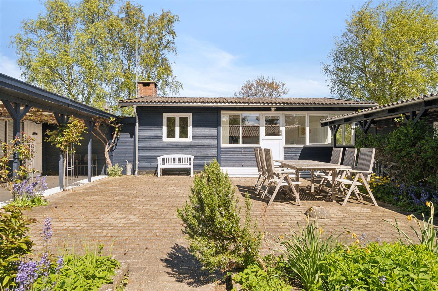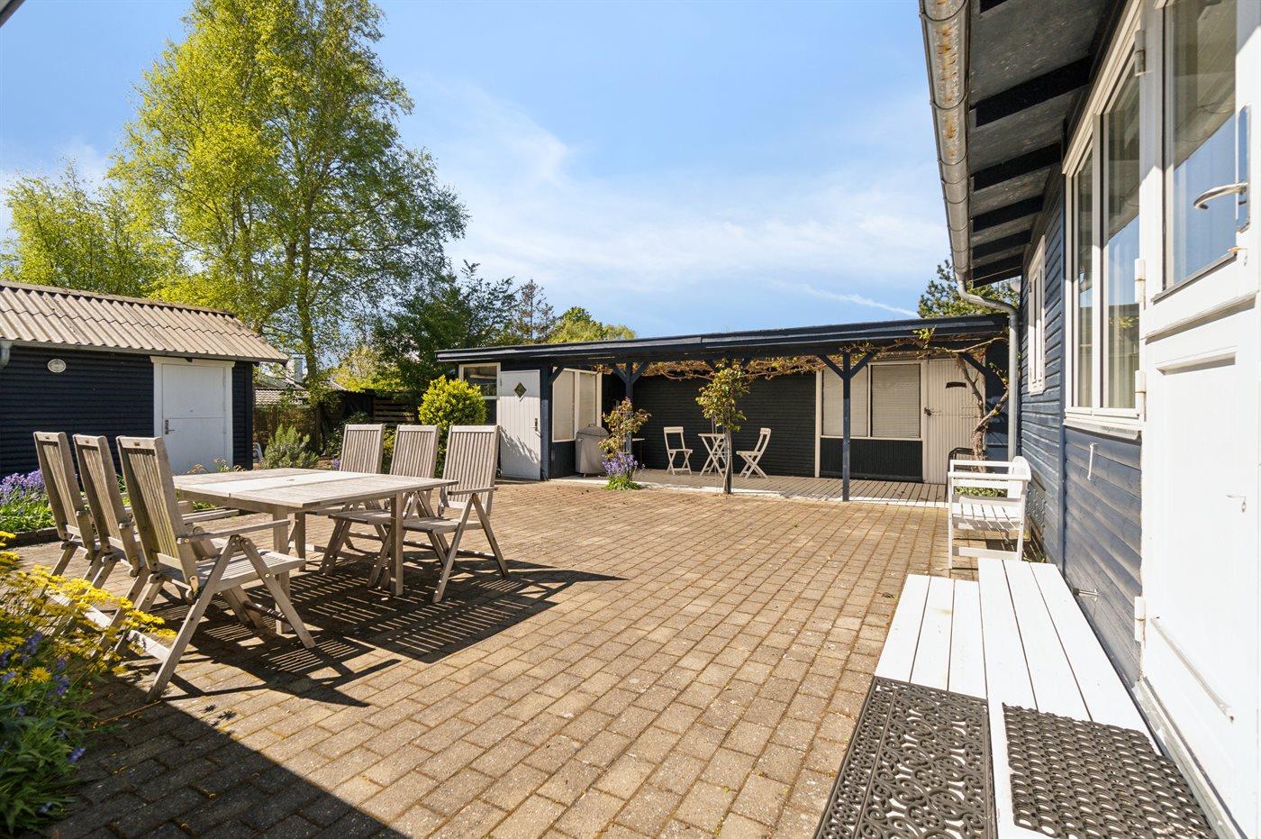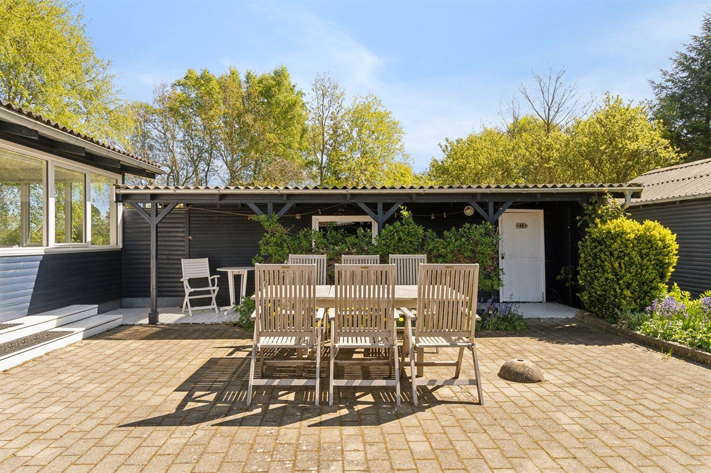 Sommerhuset ligger helt ugeneret på den dejlige grund og har nogle gode terrassearealer, som også delvist er overdækkede. Herfra kan man i særdeleshed nyde de skønne omgivelser med en kop kaffe eller et glas vin, og det er altid muligt at finde en lækrog at nyde solen i.