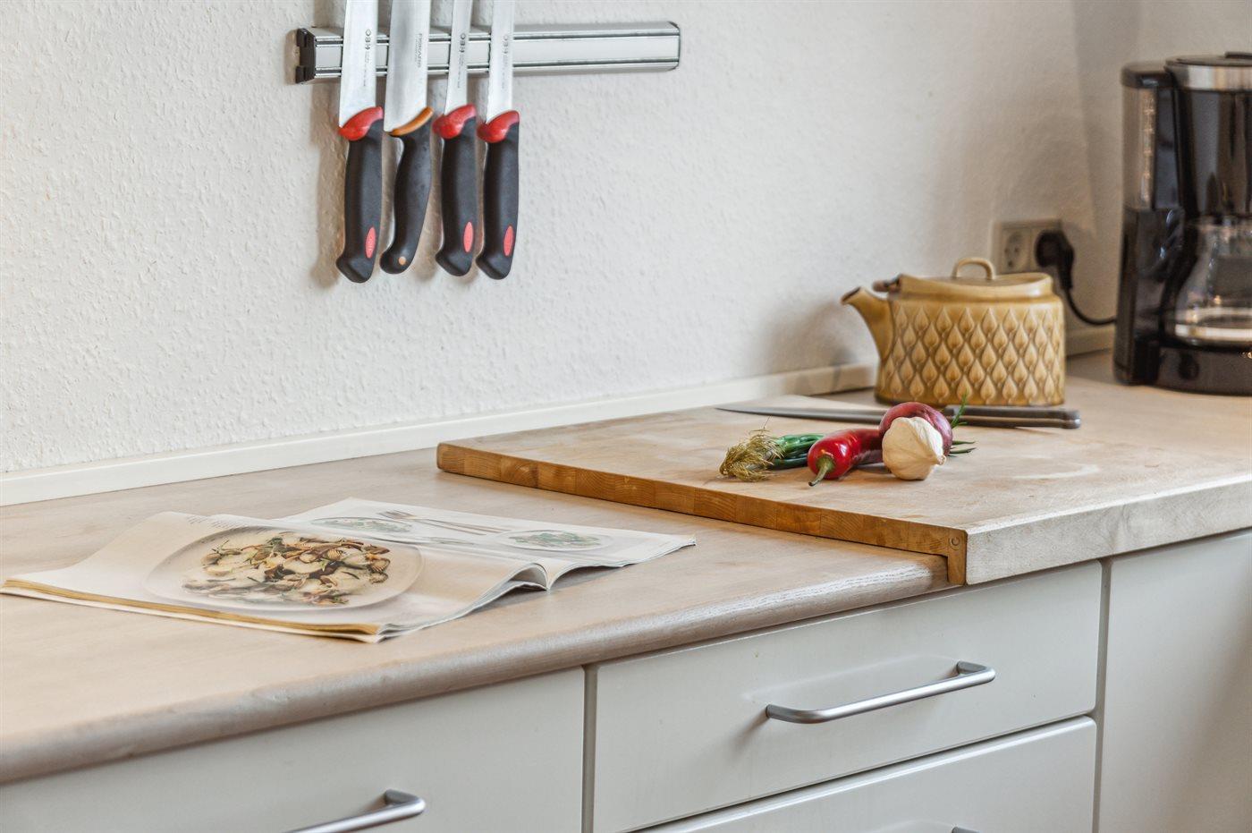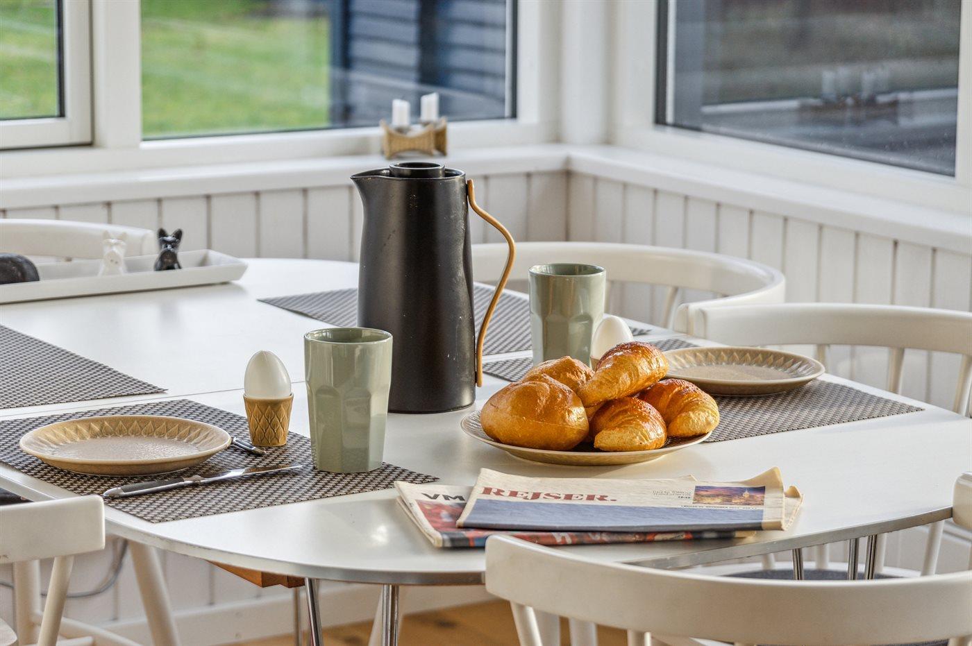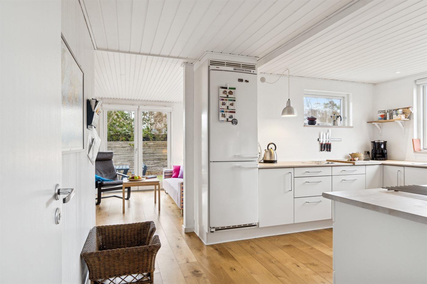 Køkkenet er udstyret med 1 køleskab. Der er 4 keramiske kogeplader, varmluftovn samt opvaskemaskine.