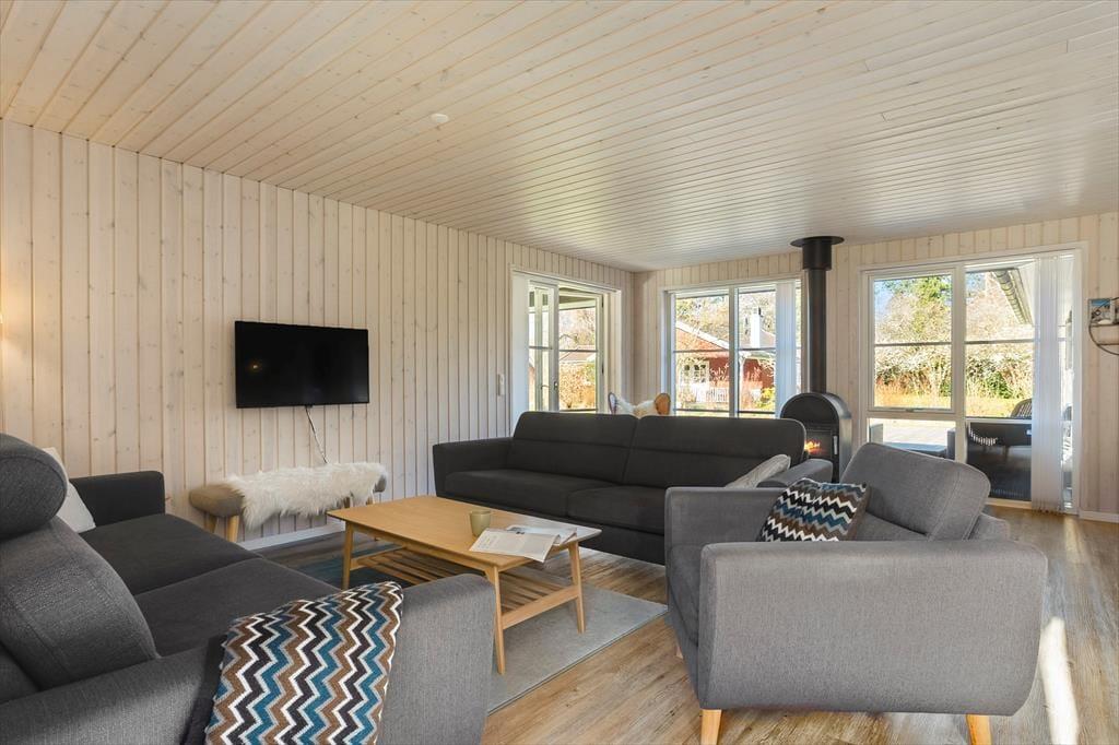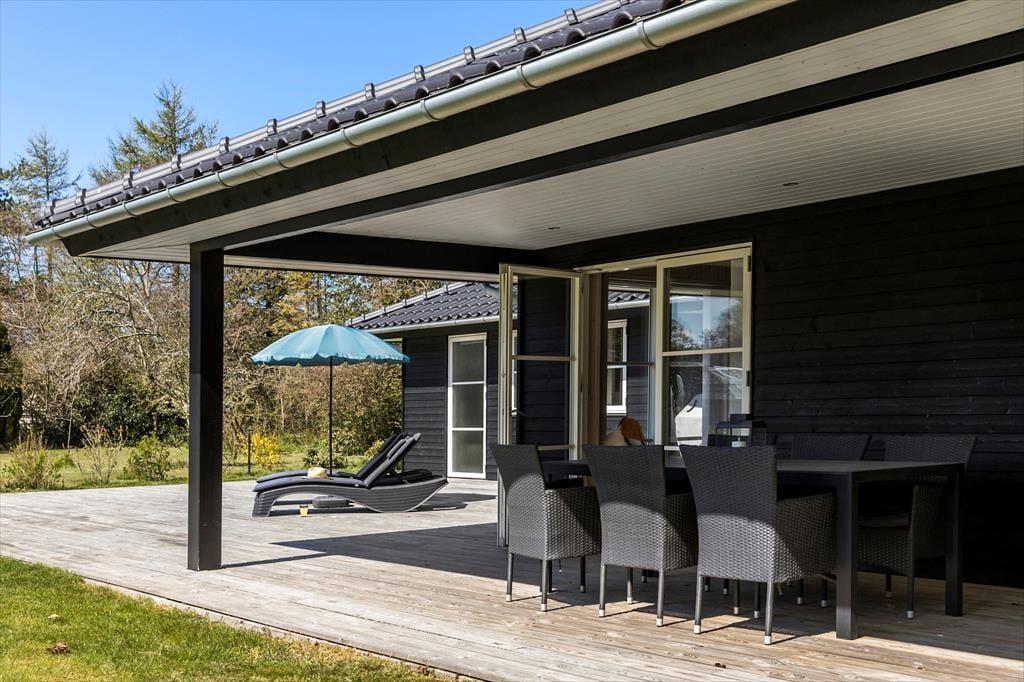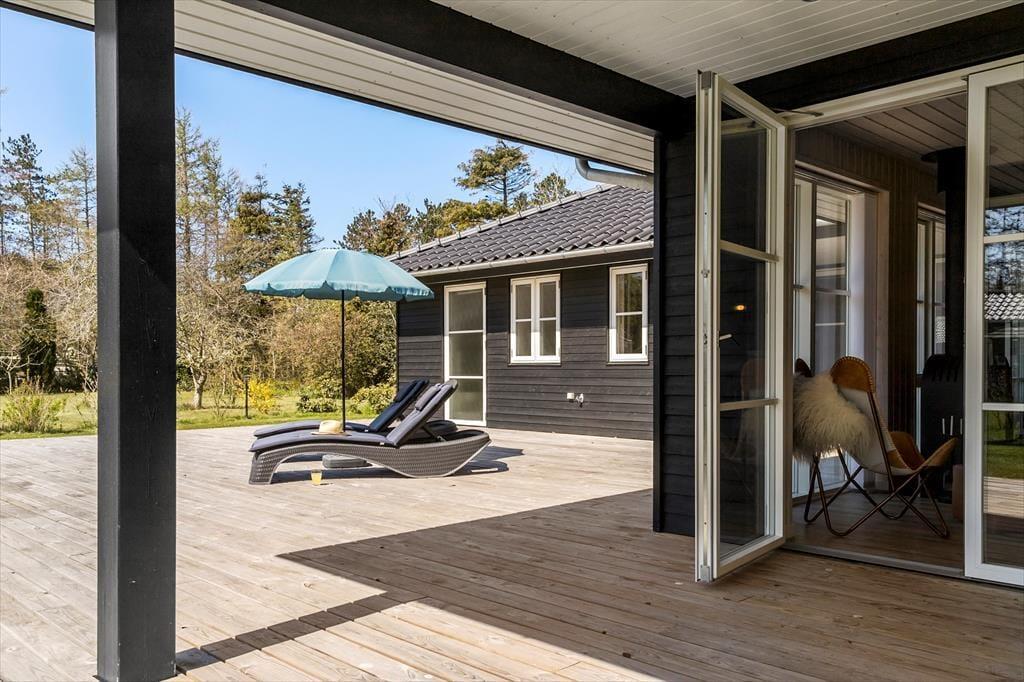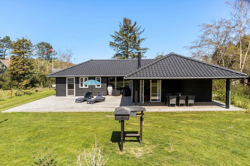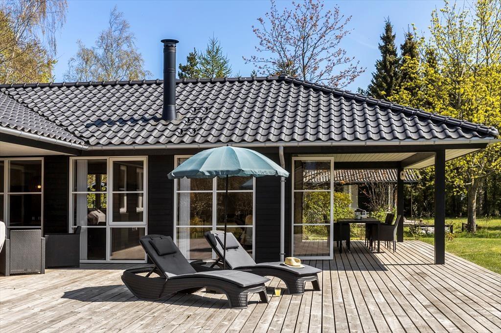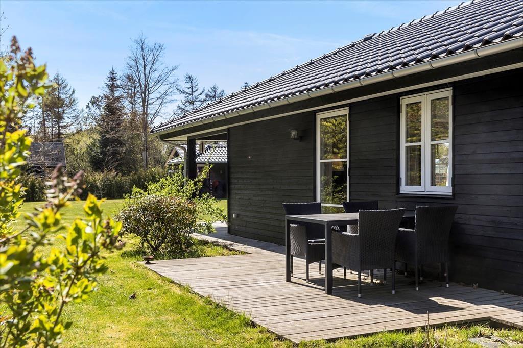 Udenfor finder du en dejlig, plan have, som næsten er lukket og giver dig ro til at slappe af og nyde ferien. Her er plads til både leg og afslapning, og måske får du endda besøg af et rådyr, der står og nyder morgensolen på græsplænen. Terrassen løber hele vejen rundt om huset og byder på mange solkroge, hvor du kan finde et hyggeligt hjørne at slappe af i. Liggestolene står klar til at tage imod dig, når du vil lade lidt op, og med grillen lige ved hånden er det let at tilberede et dejligt feriemåltid.