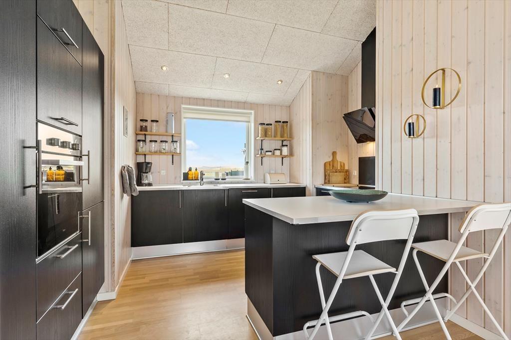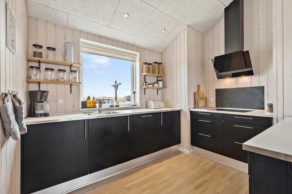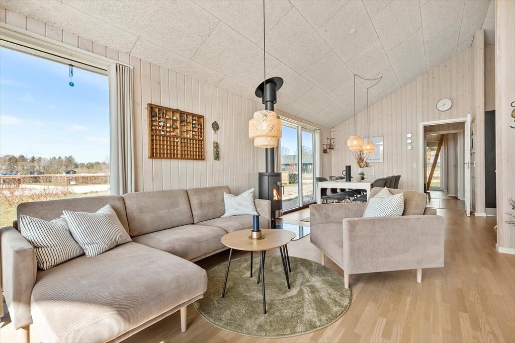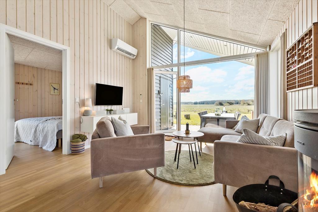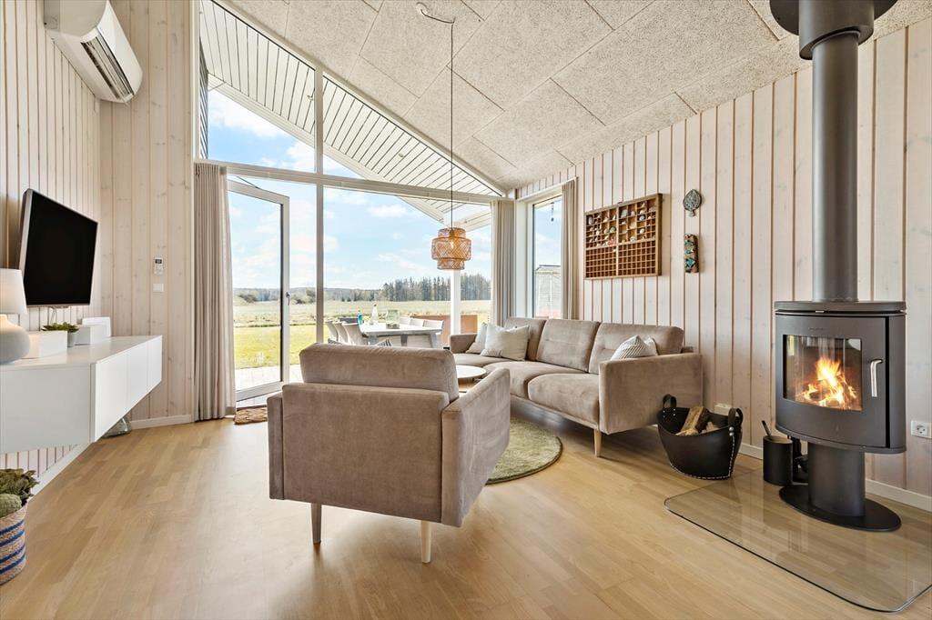 Denne moderne perle tilbyder en perfekt kombination af stil, komfort og funktionalitet. Huset fremstår i topform med en gennemført indretning, der emmer af kvalitet og elegance. Her kan du slappe af i lyse, velholdte rammer og nyde en ferie uden kompromiser. Med både brændeovn og varmepumpe er du sikret en behagelig temperatur året rundt, uanset om du nyder en vinterferie eller en sommeruge. Det åbne køkken-alrum er indrettet med alt, hvad du har brug for til at tilberede lækre måltider – lige fra en praktisk opvaskemaskine til moderne hårde hvidevarer, der gør madlavningen let og bekvem.