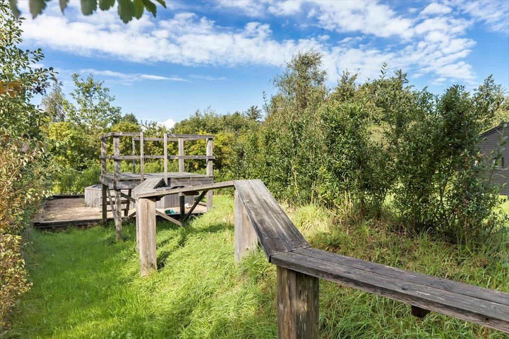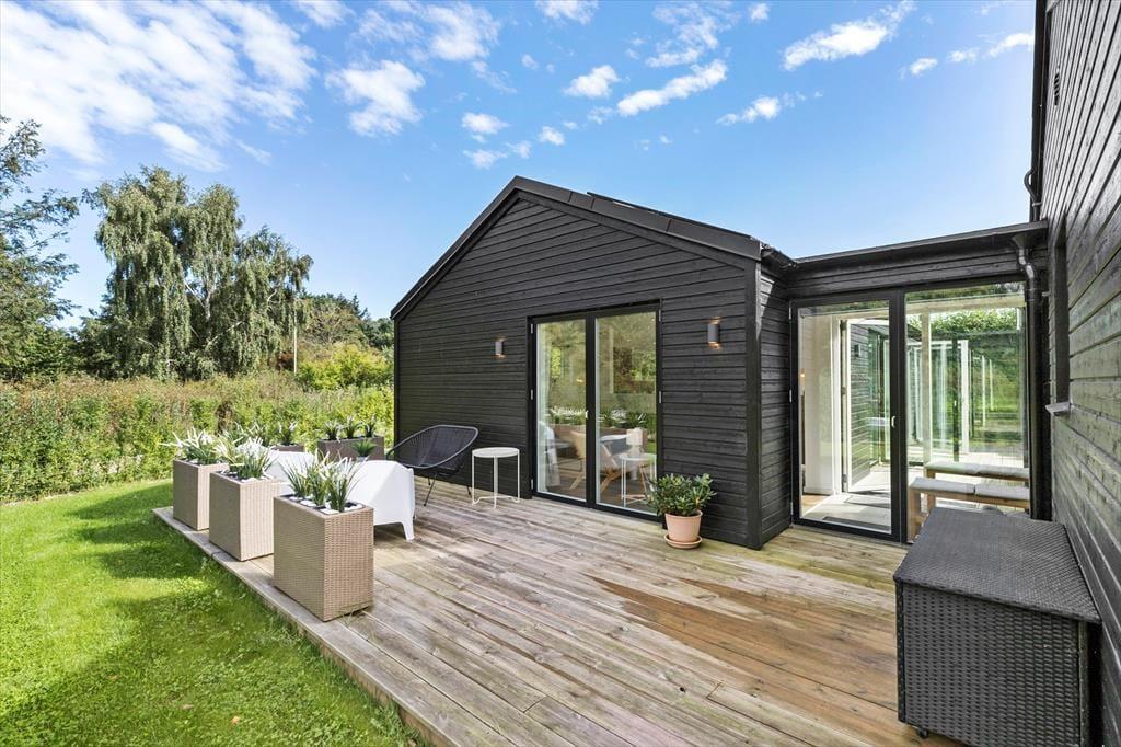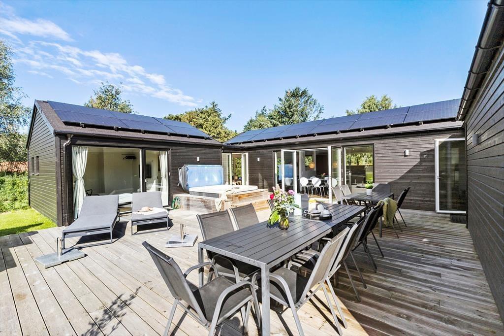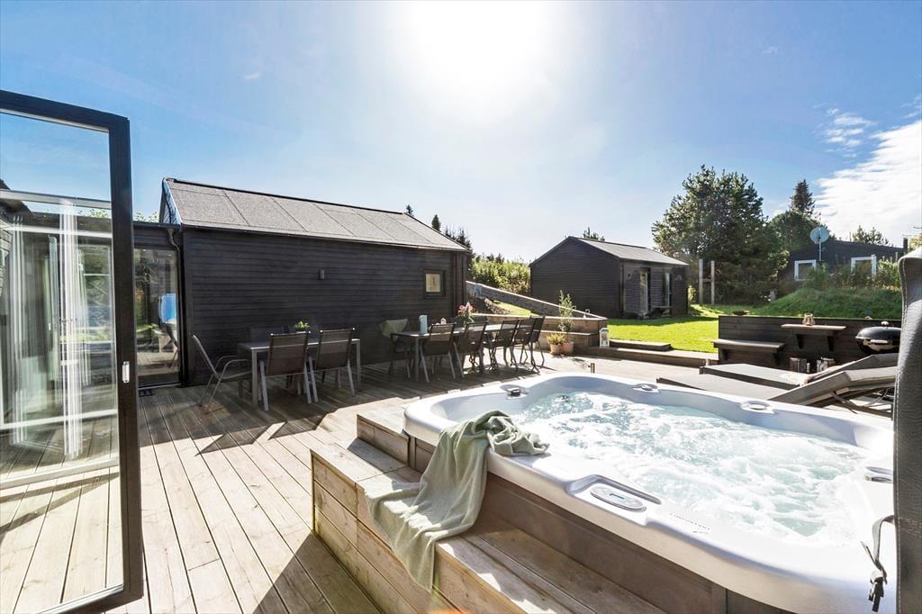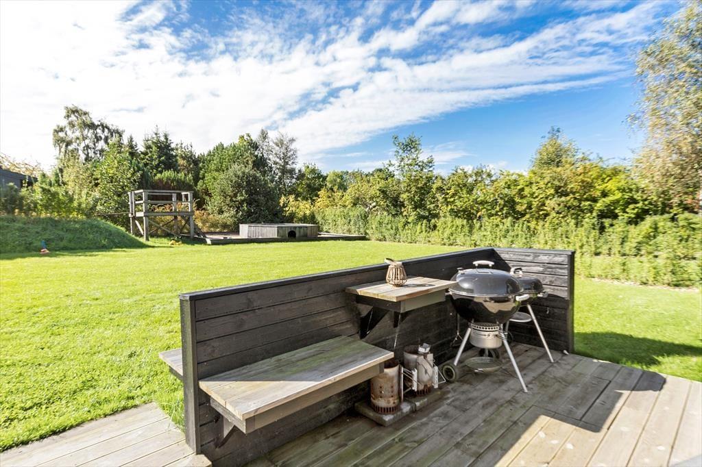 Nyd livet udenfor Når I træder ud på terrassen, åbner der sig en verden af luksus og afslapning, hvor hver detalje er designet til at forkæle jer. Forestil jer at starte dagen med morgenkaffe i de elegante loungemøbler, mens børnene leger frit på den store, grønne græsplæne og hopper hvinende i trampolinen. Når sulten melder sig, er det en fornøjelse at tænde op i grillen og tilberede lækre måltider under åben himmel. Når aftenen falder på, kan I lade jer glide ned i det opvarmede udendørs spabad, hvor I kan nyde roen og livet i fulde drag.